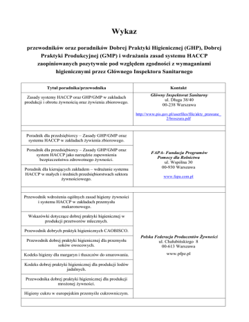 Wykaz przewodników oraz poradników Dobrej Praktyki Higienicznej (GHP), Dobrej Praktyki Produkcyjnej (GMP) i wdrażania zasad systemu HACCP zaopiniowanych pozytywnie pod względem zgodności z wymaganiami higienicznymi przez Głównego Inspektora Sanitarnego Tytuł poradnika/przewodnika Kontakt Zasady systemy HACCP oraz GHP/GMP w zakładach produkcji i obrotu żywnością oraz żywienia zbiorowego. Główny Inspektorat Sanitarny ul. Długa 38/40 00-238 Warszawa http://www.pis.gov.pl/userfiles/file/akty_prawane_ 2/broszura.pdf Poradnik dla przedsiębiorcy – Zasady GHP/GMP oraz systemu HACCP w zakładach żywienia zbiorowego. Poradnik dla przedsiębiorcy – Zasady GHP/GMP oraz system HACCP jako narzędzie zapewnienia bezpieczeństwa zdrowotnego żywności. Poradnik dla kierujących zakładem – wdrażanie systemu HACCP w małych i średnich przedsiębiorstwach sektora żywnościowego. FAPA- Fundacja Programów Pomocy dla Rolnictwa ul. Wspólna 30 00-930 Warszawa www.fapa.com.pl Przewodnik wdrożenia ogólnych zasad higieny żywności i systemu HACCP w zakładach przemysłu makaronowego. Wskazówki dotyczące dobrej praktyki higienicznej w produkcji przetworów mlecznych. Przewodnik dobrych praktyk higienicznych CAOBISCO. Przewodnik dobrej praktyki higienicznej dla przemysłu soków owocowych. Polska Federacja Producentów Żywności ul. Chałubińskiego 8 00-613 Warszawa Kodeks higieny dla margaryn i tłuszczów do smarowania. www.pfpz.pl Kodeks dobrej praktyki higienicznej dla produkcji lodów jadalnych. Przewodnika dobrej praktyki higienicznej dla produkcji mrożonej żywności. Higieny cukru w europejskim przemyśle cukrowniczym. Kodeks dobrej praktyki produkcyjnej i dobrej praktyki higienicznej dla produkcji piekarskiej i ciastkarskiej. Dobra Praktyka Produkcyjna i Dobra Praktyka Higieniczna w gastronomii z elementami HACCP. Przewodnik opracowywania i wdrażania systemu HACCP oraz jego oceny dla przemysłu spożywczego i jego kooperantów. Stowarzyszenie Naukowo Techniczne Inżynierów i Techników Przemysłu Spożywczego ul. Czackiego 3/5 00-043 Warszawa tel. 022 827-38-48 Polski Rejestr Statków SA ul. Gen. Józefa Hallera 128 80-416 Gdańsk Poradnik dla hurtowni spożywczych do wprowadzania dobrej praktyki higienicznej i wewnętrznej kontroli jakości zdrowotnej środków spożywczych oraz zasad systemu HACCP. Poradnik dla właścicieli sklepów spożywczych do wprowadzania dobrej praktyki higienicznej wewnętrznej i kontroli jakości zdrowotnej środków spożywczych. Poradnik dla zakładów żywienia zbiorowego do wprowadzania dobrej praktyki produkcyjnej (GMP), dobrej praktyki higienicznej (GHP), wewnętrznej kontroli, jakości zdrowotnej środków spożywczych oraz zasad systemu HACCP. Handlowo-Usługowa Spółdzielnia „Samopomoc Chłopska” ul. Kopernika 30 00-950 Warszawa tel. 827-27-97 Poradnik dla właścicieli piekarń i cukierni do wprowadzenia Dobrej Praktyki Produkcyjnej (GMP), Dobrej Praktyki Higienicznej (GHP) oraz zasad systemu HACCP. Instrukcje Dobrych Praktyk Produkcyjnych i Higienicznych GMP-GHP. Piekarnia. Opracowania zasad Dobrej Praktyki Produkcyjnej (GMP) i Dobrej Praktyki Higienicznej (GHP) z przykładowo wypełnioną dokumentacją-piekarnia. Dokumentacja sanitarna według zasad Dobrej Praktyki Produkcyjnej (GMP) i Dobrej Praktyki Higienicznej (GHP) – instrukcje – zapisy. Piekarnia. Rejestr temperatur w urządzeniach chłodniczych w sklepie spożywczym i hurtowni. Książka kontroli wewnętrznej w sklepie spożywczym i hurtowni – z wyjaśnieniami. Rejestr środków spożywczych wycofanych z obrotu. Ośrodek Doradztwa i Doskonalenia Kadr Sp. zo.o. ul. Obrońców Westerplatte 32A 80-317 Gdańsk Oliwa [email protected] Rejestr konserwacji i napraw urządzeń i sprzętu chłodniczego. Książka sanitarna środka transportu. Księga reklamacji z wyjaśnieniami i przykładem. Dobra Praktyka Higieniczna w sklepie spożywczym i hurtowni, wzorcowe instrukcje z wyjaśnieniami. Uniwersalna lista kontrolna auditu wewnętrznego HACCP. Poradnik opracowania zasad Dobrej Praktyki Produkcyjnej – GMP i Dobrej Praktyki Higienicznej – GHP z przykładowo wypełnioną dokumentacją. Wytwórnie żywności Kodeks Żywnościowy – Wytyczne Dobrej Praktyki Higienicznej Poradnik wdrażania zasad GHP/GMP i systemu HACCP w zakładach żywienia zbiorowego i firmach cateringowych. Kuchnia serwuje system HACCP. GASTROPOL GROUP Sp. z o.o. ul. ul. Banacha 1a 02-097 Warszawa [email protected] HACCP – program do samodzielnego wdrażania systemu bezpieczeństwa żywności z komentarzem praktycznym. Wydawnictwo FORUM Sp. z o.o. ul. Polska 13 60-595 Poznań tel. (0 61) 665 58 80 Procedura ochrony przed szkodnikami w przemyśle spożywczym. Poradnik wdrażania zasad systemu HACCP w Jednostkach Organizacyjnych Służby Więziennej. Biuro Promocji Jakości ul. Resorowa 10 02-956 Warszawa Centralny Zarząd Służby Więziennej ul. Rakowiecka 37 02-521 Warszawa tel. 640-83-11 Dobra Praktyka produkcyjna - GMP w produkcji żywności. Praktyczny audit systemu HACCP. Podstawy zapewnienia bezpieczeństwa żywności w systemie HACCP. Dokumentowanie systemu HACCP w przemyśle Biuro Doradcze LONG ul. Mazowiecka 2/22 10-699 Olsztyn tel. 089 543 30 61 spożywczym. HACCP System zapewnienia bezpieczeństwa i jakości zdrowotnej żywności. Europejski Instytut Jakości Sp. zo.o. ul. Żurawia 22 00-515 Warszawa [email protected] Poradnik Dobrej Praktyki Produkcyjnej i Dobrej Praktyki Higienicznej w Rozlewniach Wód w Opakowaniach. Dobre Praktyki Magazynowania i Ekspozycji Wód i Napojów. Krajowa Izba Gospodarcza „Przemysł Rozlewniczy“ ul. Żurawia 32/34 00-515 Warszawa [email protected] Zasady GHP i GMP w gospodarstwach agroturystycznych. Polska Federacja Turystyki Wiejskiej „Gospodarstwa Gościnne” ul. Wspólna 30 00-930 Warszawa tel. 022 623 23 43 Przewodnik wdrażania zasad HACCP w małych piekarniach. Centrum Obsługi Piekarstwa „AKO” S.A. ul. Startowa 2a 85-744 Bydgoszcz tel. 0