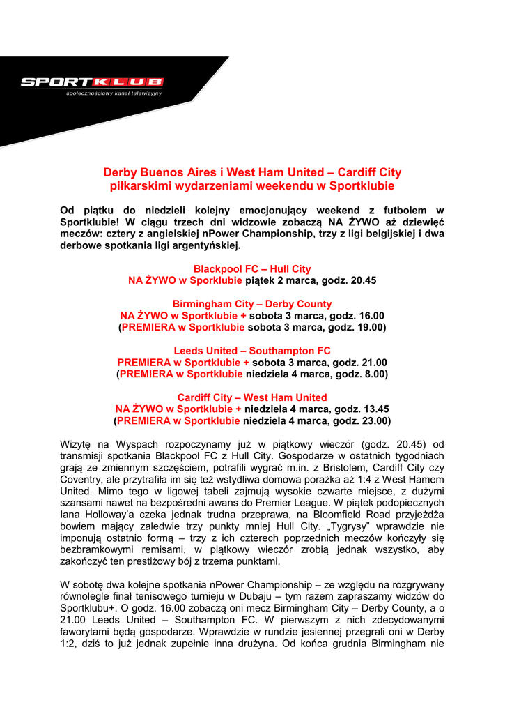 Derby Buenos Aires i West Ham United – Cardiff City piłkarskimi wydarzeniami weekendu w Sportklubie Od piątku do niedzieli kolejny emocjonujący weekend z futbolem w Sportklubie! W ciągu trzech dni widzowie zobaczą NA ŻYWO aż dziewięć meczów: cztery z angielskiej nPower Championship, trzy z ligi belgijskiej i dwa derbowe spotkania ligi argentyńskiej. Blackpool FC – Hull City NA ŻYWO w Sporklubie piątek 2 marca, godz. 20.45 Birmingham City – Derby County NA ŻYWO w Sportklubie + sobota 3 marca, godz. 16.00 (PREMIERA w Sportklubie sobota 3 marca, godz. 19.00) Leeds United – Southampton FC PREMIERA w Sportklubie + sobota 3 marca, godz. 21.00 (PREMIERA w Sportklubie niedziela 4 marca, godz. 8.00) Cardiff City – West Ham United NA ŻYWO w Sportklubie + niedziela 4 marca, godz. 13.45 (PREMIERA w Sportklubie niedziela 4 marca, godz. 23.00) Wizytę na Wyspach rozpoczynamy już w piątkowy wieczór (godz. 20.45) od transmisji spotkania Blackpool FC z Hull City. Gospodarze w ostatnich tygodniach grają ze zmiennym szczęściem, potrafili wygrać m.in. z Bristolem, Cardiff City czy Coventry, ale przytrafiła im się też wstydliwa domowa porażka aż 1:4 z West Hamem United. Mimo tego w ligowej tabeli zajmują wysokie czwarte miejsce, z dużymi szansami nawet na bezpośredni awans do Premier League. W piątek podopiecznych Iana Holloway’a czeka jednak trudna przeprawa, na Bloomfield Road przyjeżdża bowiem mający zaledwie trzy punkty mniej Hull City. „Tygrysy” wprawdzie nie imponują ostatnio formą – trzy z ich czterech poprzednich meczów kończyły się bezbramkowymi remisami, w piątkowy wieczór zrobią jednak wszystko, aby zakończyć ten prestiżowy bój z trzema punktami. W sobotę dwa kolejne spotkania nPower Championship – ze względu na rozgrywany równolegle finał tenisowego turnieju w Dubaju – tym razem zapraszamy widzów do Sportklubu+. O godz. 16.00 zobaczą oni mecz Birmingham City – Derby County, a o 21.00 Leeds United – Southampton FC. W pierwszym z nich zdecydowanymi faworytami będą gospodarze. Wprawdzie w rundzie jesiennej przegrali oni w Derby 1:2, dziś to już jednak zupełnie inna drużyna. Od końca grudnia Birmingham nie przegrało w lidze kolejnych jedenastu spotkań, dopiero w poprzedni weekend okazało się słabsze od Nottingham Forest. Derby z kolei śrubuje zupełnie inną serię. Podopieczni Nigela Clougha przegrali pięć z sześciu ostatnich meczów i systematycznie osuwają się w ligowej tabeli. W drugim sobotnim pojedynku Southampton zmierzy się na wyjeździe z Leeds. Goście po kilku słabszych styczniowych występach, znów złapali wiatr w żagle – w lutym pokonali m.in. Burnley, Derby i Watford i wrócili na fotel lidera tabeli. Wprawdzie mają rozegrany jeden mecz więcej od West Hamu, to jednak ich goni teraz reszta stawki. Na Elland Road o wygraną łatwo nie będzie, przyjezdnych stać jednak na zwycięstwo, mimo że ich ostatnia wizyta „Świętych” na tym obiekcie zakończyła się ich porażką 0:1. W niedzielę ostatnie, ale jakże ciekawe spotkanie tej kolejki nPower Championship. Na Cardiff City Stadium walczący o awans do najwyższej klasy rozgrywkowej gospodarze podejmą West Ham United, dla którego celem na ten sezon … również jest awans do Premiership. W rundzie jesiennej dosyć niespodziewanie lepsi byli Walijczycy, którzy na gorącym Boleyn Ground wygrali 1:0. W niedzielę także mają więcej szans na wygraną. Jeszcze niedawno za podopiecznymi Malky’ego Mackay’a przemawiałby atut własnego boiska, na którym rzadko gubili punkty. Ostatnio jednak również u siebie przytrafiają im się porażki, jak choćby 1:3 z Blackpool. A że także na wyjazdach Cardiff prezentuje się nieco słabiej, spadło w tabeli na szóste miejsce, ostatnie uprawniające do gry w barażach. Mimo słabszej formy w niedzielę gospodarzy stać na pokonanie wiceliderów z Londynu. Czy uda im się ta sztuka? Odpowiedź na to pytania tylko w Sportklubie i Sportklubie +. KV Mechelen – KAA Gent NA ŻYWO w Sportklubie + sobota 3 marca, godz. 18.00 (PREMIERA w Sportklubie sobota 3 marca, godz. 1.00) Club Brugge – Standard Liege NA ŻYWO w Sportklubie niedziela 4 marca, godz. 14.15 Anderlecht Bruksela – Cercle Brugge NA ŻYWO w Sportklubie niedziela 4 marca, godz. 18.00 W belgijskiej Jupiler Pro League wielkimi krokami zbliża się koniec rundy zasadniczej. W ubiegłym tygodniu trzecią drużyną, która zapewniła sobie awans do grupy mistrzowskiej była Gandawa. W ten weekend podopieczni Tronda Sollieda spróbują powiększyć swój dorobek w starciu z Mechelen. Zadanie nie będzie łatwe, bo gospodarze mają wciąż teoretyczne szanse na znalezienie się w pierwszej szóstce i z pewnością będą chcieli przedłużyć je jeszcze o tydzień. Goście jednak również powalczą o pełną pulę, aby na starcie decydującej batalii o mistrzostwo nie mieć zbyt dużej straty do Anderlechtu Bruksela. A „Fiołki” w niedzielne popołudnie (godz. 18.00 w Sportklubie) zmierzą się z Cercle Brugge. Podopieczni Ariëla Jacobsa odpadli wprawdzie z Ligi Europejskiej, na krajowym podwórku są jednak nie do zatrzymania – od połowy grudnia nie przegrali ani jednego meczu, zdecydowaną większość z nich rozstrzygając na swoją korzyść. Jeśli drużyna Marcina Wasilewskiego wygra również ze słabszą z drużyn z Brugii, zapewni sobie pierwsze miejsce przed fazą play-off. A jeśli nie zwolni tempa, będzie na najlepszej drodze, aby na finiszu rozgrywek cieszyć się z trzydziestego pierwszego tytułu mistrza Belgii. Także w niedzielę (o godz. 14.15 w Sportklubie) o ligowe punkty walczyć będzie druga z drużyn z Brugii. Wiceliderzy Jupiler Pro League podejmą na Jan Breydel Stadium pogromcę Wisły Kraków w Lidze Europejskiej, Standard Liege. Gospodarze są już pewni udziału w grupie mistrzowskiej, goście wciąż walczą o pierwszą szóstkę, aby się w niej znaleźć wystarczy im jednak nie przegra
