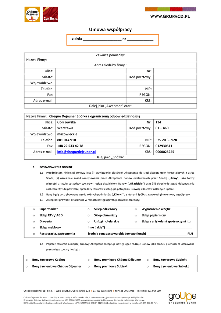 Umowa współpracy z dnia ___________________ nr _____________ Zawarta pomiędzy: Nazwa Firmy: Adres siedziby firmy : Ulica: Nr: Miasto: Kod pocztowy: Województwo: Telefon: NIP: Fax: REGON: Adres e-mail: KRS: Dalej jako „Akceptant” oraz: Nazwa Firmy: Chèque Déjeuner Spółka z ograniczoną odpowiedzialnością Ulica: Miasto: Województwo: Telefon: Fax: Adres e-mail: 1. Górczewska Nr: Warszawa Kod pocztowy: 124 01 – 460 mazowieckie 801 014 910 NIP: +48 22 533 42 78 REGON: [email protected] Dalej jako „Spółka”: KRS: 525 20 35 928 012930511 0000025255 POSTANOWIENIA OGÓLNE 1.1 Przedmiotem niniejszej Umowy jest (i) przyłączenie placówek Akceptanta do sieci akceptantów korzystających z usług Spółki, (ii) określenie zasad akceptowania przez Akceptanta Bonów emitowanych przez Spółkę („Bony”) jako formy płatności z tytułu sprzedaży towarów i usług okazicielom Bonów („Okaziciele”) oraz (iii) określenie zasad dokonywania rozliczeń z tytułu powyższej sprzedaży towarów i usług, po potrąceniu Prowizji i Kosztów należnych Spółce. 1.2 Bony będą dystrybuowane wśród różnych podmiotów („Klienci”), z którymi Spółka zawrze odrębne umowy współpracy. 1.3 Akceptant prowadzi działalność w ramach następujących placówek sprzedaży: o Supermarket o Sklep odzieżowy o Wyposażenie wnętrz o Sklep RTV / AGD o Sklep obuwniczy o Sklep papierniczy o Drogeria o Usługi hotelarskie o Sklep z artykułami spożywczymi itp. o Sklep meblowy Inne (jakie?) ____________________________________________________ o Restauracja, gastronomia Średnia cena zestawu obiadowego (lunch) ________________________ PLN 1.4 Poprzez zawarcie niniejszej Umowy Akceptant akceptuje następujące rodzaje Bonów jako środek płatności za oferowane przez niego towary i usługi : o Bony towarowe Cadhoc o Bony premiowe Chèque Déjeuner o Bony towarowe Subiekt o Bony żywieniowe Chèque Déjeuner o Bony premiowe Subiekt o Bony żywieniowe Subiekt Chèque Déjeuner Sp. z o.o. I Wola Court, ul. Górczewska 124 I 01-460 Warszawa I NIP 525 20 35 928 I Infolinia: 801 014 910 Chèque Déjeuner Sp. z o.o. z siedzibą w Warszawie, ul. Górczewska 124, 01-460 Warszawa, jest wpisana do rejestru przedsiębiorców Krajowego Rejestru Sądowego pod numerem KRS 0000025255, prowadzonego przez Sąd Rejonowy dla miasta stołecznego Warszawy, XII Wydział Gospodarczy Krajowego Rejestru Sądowego, NIP 5252035928, REGON 012930511 o kapitale zakładowym w wysokości 5 795 000,00 PLN. na następujących warunkach finansowych ( ”Warunki Finansowe” ): Koszty manipulacyjne jednego rozliczenia Bonów ( ”Koszty” ) Prowizja netto dla Spółki z tytułu świadczonych usług - od wartości nominalnej Bonów ( “Prowizja” ) Wzory Bonów oraz ich zabezpieczenia wskazane są w Załączniku nr 1 do niniejszej Umowy. 1.5 Z zastrzeżeniem postanowień punktu 4 Umowy, Spółka zobowiązuje się do dokonywania rozliczeń Bonów tj. przekazywania Akceptantowi z kwot otrzymanych od Klientów, należności za towary i usługi zakupione u Akceptanta przez Okazicieli w zamian za poszczególne Bony po potrąceniu Prowizji oraz Kosztów, powiększonych o podatek VAT na następujący rachunek bankowy Akceptanta: Nazwa Firmy: Telefon: Imię i nazwisko osoby kontaktowej: Telefon kom.: Adres e-mail: Nazwa Banku: Oddział: Nr rachunku bankowego: 2. OBOWIĄZKI SPÓŁKI Spółka zobowiązuje się do: 2.1 Promowania Bonów jako formy płatności dostępnej u Akceptanta i pozyskiwanie Klientów; 2.2 Emisji i dystrybuowania Bonów do Klientów na podstawie odrębnych umów; 2.3 Informowania Klientów o placówkach Akceptanta, w których mogą być wykorzystane Bony; 2.4 Dostarczenia Akceptantowi oznaczeń Spółki informujących o możliwości dokonywania płatności za towar lub usługę w formie Bonów; 2.5 Rozliczania Bonów, zgodnie z postanowieniami punktu 1.5. Powyżej; 2.6 Dokumentowania rozliczeń dokonywanych z Akceptantem (wystawienia not księgowych na wartość nominalną zrealizowanych Bonów oraz faktur na wartość Prowizji i Kosztów). 3. OBOWIĄZKI AKCEPTANTA W ramach przedmiotu niniejszej Umowy Akceptant zobowiązuje się do: 3.1 Akceptowania Bonów jako formy płatności za towary i usługi we wszystkich placówkach handlowych Akceptanta z tytułu nabycia towaru lub usługi przez Okaziciela; 3.2 Udostępniania listy placówek handlowych i usługowych Akceptanta; 3.3 Informowania o zmianach dotyczących placówek handlowych i usługowych Klienta, w tym zmianie adresu, stałym lub okresowym zamknięciu placówki, otwarciu nowej placówki – w terminie piętnastu dni od dnia zmiany; 3.4 Zapoznania personelu wszystkich placówek handlowych Akceptanta z wzorami Bonów i ich zabezpieczeniami, a także zasadami związanymi z wykorzystaniem Bonów, o których mowa w punkcie 5 niniejszej umowy oraz respektowania wymienionych zasad. 3.5 Oznaczenia wszystkich placówek handlowych Akceptanta, w tym stanowisk kasowych, oznaczeniami Spółki, informujących o możliwości zapłaty za towar lub usługę w formie Bonów. Chèque Déjeuner Sp. z o.o. I Wola Court, ul. Górczewska 124 I 01-460 Warszawa I NIP 525 20 35 928 I Infolinia: 801 014 910 Chèque Déjeuner Sp. z o.o. z siedzibą w Warszawie, ul. Górczewska 124, 01-460 Warszawa, jest wpisana do rejestru przedsiębiorców Krajowego Rejestru Sądowego pod numerem KRS 0000025255, prowadzonego przez Sąd Rejonowy dla miasta stołecznego Warszawy, XII Wydział Gospodarczy Krajowego Rejestru Sądowego, NIP 5252035928, REGON 012930511 o kapitale zakładowym w wysokości 5 795 000,00 PLN. 4. ZASADY ROZLICZANIA BONÓW 4.1 Celem rozliczenia zrealizowanych Bonów Akceptant dostarcza je na swój koszt na adres: ul. Górczewska 124, 01-460 Warszawa za poświadczeniem odbioru: przesyłką kurierską, listem poleconym lub osobiście w bezpiecznej kopercie, zabezpieczającej przed otwarciem przez osoby trzecie. Odpowiedzialność za przesyłane Bony przechodzi na Spółkę 
