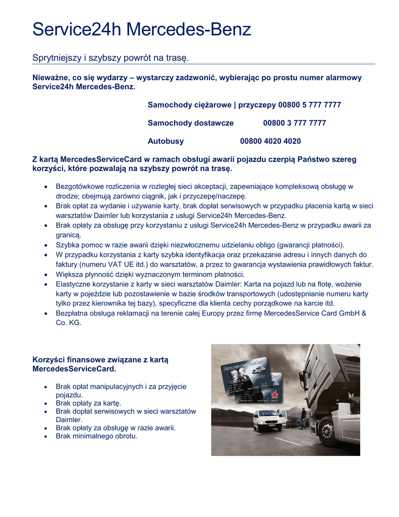 Service24h Mercedes-Benz Sprytniejszy i szybszy powrót na trasę. Nieważne, co się wydarzy – wystarczy zadzwonić, wybierając po prostu numer alarmowy Service24h Mercedes-Benz. Samochody ciężarowe | przyczepy 00800 5 777 7777 Samochody dostawcze Autobusy 00800 3 777 7777 00800 4020 4020 Z kartą MercedesServiceCard w ramach obsługi awarii pojazdu czerpią Państwo szereg korzyści, które pozwalają na szybszy powrót na trasę. Bezgotówkowe rozliczenia w rozległej sieci akceptacji, zapewniające kompleksową obsługę w drodze; obejmują zarówno ciągnik, jak i przyczepę/naczepę. Brak opłat za wydanie i używanie karty, brak dopłat serwisowych w przypadku płacenia kartą w sieci warsztatów Daimler lub korzystania z usługi Service24h Mercedes-Benz. Brak opłaty za obsługę przy korzystaniu z usługi Service24h Mercedes-Benz w przypadku awarii za granicą. Szybka pomoc w razie awarii dzięki niezwłocznemu udzielaniu obligo (gwarancji płatności). W przypadku korzystania z karty szybka identyfikacja oraz przekazanie adresu i innych danych do faktury (numeru VAT UE itd.) do warsztatów, a przez to gwarancja wystawienia prawidłowych faktur. Większa płynność dzięki wyznaczonym terminom płatności. Elastyczne korzystanie z karty w sieci warsztatów Daimler: Karta na pojazd lub na flotę, wożenie karty w pojeździe lub pozostawienie w bazie środków transportowych (udostępnianie numeru karty tylko przez kierownika tej bazy), specyficzne dla klienta cechy porządkowe na karcie itd. Bezpłatna obsługa reklamacji na terenie całej Europy przez firmę MercedesService Card GmbH & Co. KG. Korzyści finansowe związane z kartą MercedesServiceCard. Brak opłat manipulacyjnych i za przyjęcie pojazdu. Brak opłaty za kartę. Brak dopłat serwisowych w sieci warsztatów Daimler. Brak opłaty za obsługę w razie awarii. Brak minimalnego obrotu.