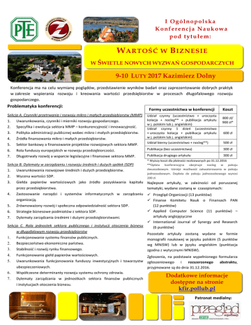 I O g ó l n o p o l s ka K o nf e r e n c j a Na uk o wa pod tytułem: W ARTOŚĆ W B IZNESIE W ŚWIETLE NOWYCH WYZWAŃ GOSPODARCZYCH 9-10 LUTY 2017 Kazimierz Dolny Konferencja ma na celu wymianę poglądów, przedstawienie wyników badań oraz zaprezentowanie dobrych praktyk w zakresie wspierania rozwoju i kreowania wartości przedsiębiorstw w procesach długofalowego rozwoju gospodarczego. Problematyka konferencji: Sekcja A. Czynniki przetrwania i rozwoju mikro i małych przedsiębiorstw (MMP) Formy uczestnictwa w konferencji Udział czynny (uczestnictwo + uroczysta kolacja + nocleg** + publikacja artykułu w j. polskim lub j. angielskim) Udział czynny 1 dzień (uczestnictwo + uroczysta kolacja + publikacja artykułu w j. polskim lub j. angielskim) Koszt 800 zł/ 900 zł* 1. Uwarunkowania, czynniki i mierniki rozwoju gospodarczego. 2. Specyfika i ewolucja sektora MMP – konkurencyjność i innowacyjność. 3. Polityka administracji publicznej wobec mikro i małych przedsiębiorstw. 4. Źródła finansowania mikro i małych przedsiębiorstw. 5. Sektor bankowy a finansowanie projektów rozwojowych sektora MMP. Udział bierny (uczestnictwo + nocleg**) 500 zł 6. Rola funduszy europejskich w rozwoju przedsiębiorczości. Publikacja (bez uczestnictwa) 300 zł 7. Długotrwały rozwój a wsparcie legislacyjne i finansowe sektora MMP. Publikacja drugiego artykułu 300 zł Sekcja B. Dylematy w zarządzaniu i rozwoju średnich i dużych spółek (SDP) 1. Uwarunkowania rozwojowe średnich i dużych przedsiębiorstw. 600 zł * Wyższy koszt dla płatności realizowanych po 31.12.2016 **Opłata konferencyjna obejmuje nocleg w pokoju dwuosobowym. Istnieje możliwość zakwaterowania w pokoju jednoosobowym. Dopłata do pokoju jednoosobowego wynosi 200 zł. 2. Wycena wartości SDP. 3. Giełda papierów wartościowych jako źródło pozyskiwania kapitału Najlepsze artykuły, w zależności od poruszanej przez przedsiębiorstwa. tematyki, wydane zostaną w czasopismach: Zastosowanie narzędzi i systemów informatycznych w zarządzaniu Przegląd Organizacji (13 punktów) 4. organizacją. Finanse Komitetu Nauk o Finansach PAN (12 punktów) 5. Zrównoważony rozwój i społeczna odpowiedzialność sektora SDP. Applied Computer Science (11 punktów) – 6. Strategie biznesowe podmiotów z sektora SDP. artykuły anglojęzyczne 7. Dylematy zarządzania średnimi i dużymi przedsiębiorstwami. International Journal of Synergy and Research Sekcja C. Rola jednostek sektora publicznego i instytucji otoczenia biznesu (6 punktów) w długofalowym rozwoju przedsiębiorstw Pozostałe artykuły zostaną wydane w formie 1. Funkcjonowanie systemu finansów publicznych. monografii naukowej w języku polskim (5 punktów 2. Bezpieczeństwo ekonomiczne państwa. wg MNiSW) lub w języku angielskim (punktacja 3. Stabilność i rozwój rynku finansowego. zgodna z wytycznymi MNiSW). 4. Funkcjonowanie giełd papierów wartościowych. Zgłoszenia, na podstawie wypełnionego formularza 6. Uwarunkowania funkcjonowania funduszy inwestycyjnych i towarzystw zgłoszeniowego i rozszerzonego ubezpieczeniowych. przyjmowane są do dnia 31.12.2016. Współczesne determinanty rozwoju systemu ochrony zdrowia. 7. Dylematy zarządzania w jednostkach sektora finansów publicznych 5. i instytucjach otoczenia biznesu. abstraktu, Dodatkowe informacje dostępne na stronie kfir.pollub.pl Patronat medialny: WARTOŚĆ W BIZNESIE W ŚWIETLE NOWYCH WYZWAŃ GOSPODARCZYCH Hotel Kazimierzówka, w którym odbędzie się konferencja, to urokliwe miejsce, położone w kameralnym zakątku Kazimierza Dolnego. Do dyspozycji gości oprócz komfortowej sali konferencyjnej, w której odbędą się poszczególne sesje wystąpień, będzie dostępny kompleks Wellness & Spa proponujący saunę fińską, łaźnie parową (hammam), salę relaksu oraz jacuzzi. Dla prelegenta najlepszego wystąpienia przyznana zostanie nagroda specjalna w postaci indywidualnego zabiegu Spa. Dla Uczestników konferencji Hotel Kazimierzówka przygotował specjalną ofertę noclegów umożliwiającą przedłużenie pobytu w Kazimierzu Dolnym. Pytania w tej sprawie prosimy kierować na adres: [email protected]. Rada programowa: dr hab. inż. Artur Paździor, prof. PL – przewodniczący (Politechnika Lubelska) dr hab. Teresa Bednarczyk, prof. UMCS (Uniwersytet Marii Curie-Skłodowskiej w Lublinie) prof. dr hab. Aurelia Bielawska (Uniwersytet Szczeciński) prof. dr hab. Ewa Bojar (Politechnika Lubelska) dr hab. Stanisław Brzeziński, prof. PCz. (Politechnika Częstochowska) dr hab. Wiesława Caputa, prof. Pol. Śl. (Politechnika Śląska) prof. dr hab. inż. Tadeusz Dudycz (Politechnika Wrocławska) dr inż. Arkadiusz Gola (Politechnika Lubelska) prof. dr hab. Jacek Grzywacz (Szkoła Główna Handlowa w Warszawie) dr hab. Wiesław Janik, prof. PL (Politechnika Lubelska) dr hab. Dorota Jelonek, prof. PCz (Politechnika Częstochowska) dr Rachael Khansa (Modern University for Business and Science, Liban) dr hab. Izabela Krawczyk-Sokołowska, PCz. (Politechnika Częstochowska) dr Magdalena Maciaszczyk (Politechnika Lubelska) prof. dr hab. Krzysztof Marecki (Szkoła Główna Handlowa w Warszawie) dr Krzysztof Markowski (Urząd Statystyczny w Lublinie) prof. dr hab. Elżbieta Mączyńska (Polskie Towarzystwo Ekonomiczne - Prezes Zarządu) PhD Bohuslava Mihalčová, prof. Ing.(University of Economics in Bratislava) dr Magdalena Miszczuk (Politechnika Lubelska) dr hab. Wojciech Misztal, prof. UMCS (Uniwersytet Marii Curie-Skłodowskiej w Lublinie) dr hab. Błażej Prusak (Politechnika Gdańska) CSc. Michal Pružinský, prof. Ing. (University of Economics in Bratislava) dr hab. Anna Rakowska, prof. UMCS (Uniwersytet Marii Curie-Skłodowskiej w Lublinie) dr Paweł Rydzewski (Uniwersytet Marii Curie-Skłodowskiej w Lublinie) dr hab. inż. Magdalena Rzemieniak, prof. PL (Politechnika Lubelska) dr hab. Adam Sadowski, prof. UwB (Uniwersytet w Białymstoku) dr Ilona Skibińska-Fabrowska (Narodowy Bank P