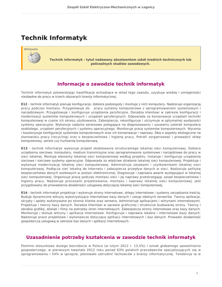 Zespół Szkół Elektryczno-Mechanicznych w Legnicy Technik Informatyk Wikipedia Technik informatyk - tytuł nadawany absolwentom szkół średnich technicznych lub policealnych studiów zawodowych. Informacje o zawodzie technik informatyk Technik informatyk potwierdzając kwalifikacje wchodzące w skład tego zawodu, uzyskuje wiedzę i umiejętności niezbędne do pracy w trzech obszarach branży informatycznej. E12 - technik informatyk planuje konfiguracje, dobiera podzespoły i montuje z nich komputery. Nadzoruje organizacją pracy podczas montażu. Przygotowuje do pracy systemy komputerowe z oprogramowaniem systemowym i narzędziowym. Przygotowuje i konfiguruje urządzenia peryferyjne. Doradza klientowi w zakresie konfiguracji i modernizacji systemów komputerowych i urządzeń peryferyjnych. Odpowiada za konserwacje urządzeń techniki komputerowej w czasie ich okresu użytkowania. Zabezpiecza, rekonfiguruje i utrzymuje w optymalnej wydajności systemy operacyjne. Wykonuje zadania serwisowe polegające na diagnozowaniu i usuwaniu usterek komputera osobistego, urządzeń peryferyjnych i systemu operacyjnego. Monitoruje pracę systemów komputerowych. Wycenia i kosztorysuje konfiguracje systemów komputerowych oraz ich konserwacje i naprawy. Dba o aspekty ekologiczne na stanowisku pracy (recycling) oraz o bezpieczeństwo i higienę pracy. Potrafi zorganizować i prowadzić sklep komputerowy, serwis czy hurtownię komputerową. E13 - technik informatyk wykonuje projekt okablowania strukturalnego lokalnej sieci komputerowej. Dobiera urządzenia sieciowe, komputery, medium transmisyjne oraz oprogramowanie systemowe i narzędziowe do pracy w sieci lokalnej. Montuje elementy lokalnej sieci komputerowej według projektu. Instaluje i konfiguruje urządzenia sieciowe i sieciowe systemy operacyjne. Odpowiada za właściwe działanie lokalnej sieci komputerowej. Projektuje i wykonuje modernizację lokalnej sieci komputerowej. Administruje zasobami i użytkownikami lokalnej sieci komputerowej. Podłącza sieć lokalną do Internetu i zabezpiecza przepływ danych w sieci. Nadzoruje politykę bezpieczeństwa danych osobowych w postaci elektronicznej. Diagnozuje i naprawia awarie występujące w lokalnej sieci komputerowej. Organizuje pracę podczas montażu sieci i jej naprawy przestrzegając zasad bezpieczeństwa i higieny pracy. Nadzoruje procesami projektowania, montażu i naprawy lokalnej sieci komputerowej. Jest przygotowany do prowadzenia działalności usługowej dotyczącej lokalnej sieci komputerowej. E14 - technik informatyk projektuje i wykonuje strony internetowe, sklepy internetowe i systemy zarządzania treścią. Buduje dynamiczne witryny wykorzystujące internetowe bazy danych i usługi zdalnych serwerów. Tworzy aplikacje, skrypty i aplety wykonywane po stronie klienta oraz serwera. Administruje aplikacjami i witrynami internetowymi. Projektuje i tworzy bazy danych. Doradza klientowi w oprawie graficznej i strukturze budowanej strony. Tworzy i obrabia grafikę, dźwięk i filmy na potrzeby stron internetowych. Zabezpiecza strony internetowe oraz bazy danych. Monitoruje i testuje witryny i aplikacje internetowe. Konfiguruje i naprawia lokalne i internetowe bazy danych. Nadzoruje prace projektowe i wykonawcze dotyczące aplikacji internetowych i baz danych. Prowadzi działalność gospodarczą usługową w zakresie baz danych i aplikacji internetowych. Uzasadnienie potrzeby kształcenia w zawodzie technik informatyk Pomimo stosunkowo dużego bezrobocia w Polsce (w lutym 2012 r. 13,5%) i oznak globalnego spowolnienia gospodarczego, w pierwszym kwartale 2012 roku ponad 63% polskich pracodawców specjalizujących się w oprogramowaniu i 54% w sprzęcie, planowało zatrudnić fachowców z branży informatycznej. Tendencja ta w 1 Zespół Szkół Elektryczno-Mechanicznych w Legnicy następnych kwartałach ma się utrzymać. Znacząca część tych prognoz dotyczy pracowników średniego szczebla, w tym absolwentów technikum. Powodem dobrych wyników w branży IT jest wejście na polski rynek nowych firm informatycznych i teleinformatycznych, wzrost konkurencji i ciągły postęp technologiczny. Wszystkie te czynniki wymuszają podwyższanie jakości usług, często osiągane przez inwestycje w infrastrukturę IT. Nie bez znaczenia jest też kierunek informatyzacji i cyfryzacji administracji publicznej. Istotny jest również dobór efektów kształcenia podstawy programowej. Według analizy rynku pracy informatycy najczęściej posługują się językami programowania takimi jak: SQL, HTML, CSS i PHP. Wśród narzędzi bazodanowych prym wiodą MSSQL, Oracle i MySQL. Według danych dotyczących kompetencji informatyków, najwięcej z nich zajmuje się administracją sieci LAN (31%) a nieco mniej szeroko rozumianą obsługą usług serwera http (30%). Natomiast dane dotyczące ofert pracy jasno określają obszary zainteresowania pracodawców. 41% ofert pracy dotyczy programistów (w dużej części aplikacji internetowych), 20% administratorów sieci, a 16% instalatorów i serwisantów systemów komputerowych. Według tych analiz oraz struktury ofert pracy kształcenie w zawodach branży IT jest nie tyle celowe, ale wręcz konieczne, ze względu nie tylko na zapotrzebowanie rynku pracy, ale również na tendencje rozwoju kraju w przyszłości. Ponadto kierunki kształcenia w kwalifikacjach zawodowych technika informatyka wydają się być optymalnie dopasowane do potrzeb rynku pracy. //źródło: www.koweziu.edu.pl 2