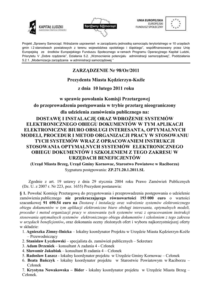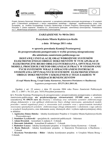 Projekt „Sprawny Samorząd. Wdrażanie usprawnień w zarządzaniu jednostką samorządu terytorialnego w 10 urzędach gmin i 2 starostwach powiatowych z terenu województwa opolskiego i śląskiego”, współfinansowany przez Unię Europejską ze środków Europejskiego Funduszu Społecznego w ramach Programu Operacyjnego Kapitał Ludzki, Priorytetu V „Dobre rządzenie”, Działania 5.2. „Wzmocnienie potencjału administracji samorządowej”, Poddziałania 5.2.1. „Modernizacja zarządzania w administracji samorządowej ” ZARZĄDZENIE Nr 98/Or/2011 Prezydenta Miasta Kędzierzyn-Koźle z dnia 10 lutego 2011 roku w sprawie powołania Komisji Przetargowej do przeprowadzenia postępowania w trybie przetarg nieograniczony dla udzielenia zamówienia publicznego na: DOSTAWĘ I INSTALACJĘ ORAZ WDROŻENIE SYSTEMÓW ELEKTRONICZNEGO OBIEGU DOKUMENTÓW W TYM APLIKACJI ELEKTRONICZNE BIURO OBSŁUGI INTERESANTA, OPTYMALNYCH MODELI, PROCEDUR I METOD ORGANIZACJI PRACY W STOSOWANIU TYCH SYSTEMÓW WRAZ Z OPRACOWANIEM INSTRUKCJI STOSOWANIA OPTYMALNYCH SYSTEMÓW ELEKTRONICZNEGO OBIEGU DOKUMENTÓW I SZKOLENIEM Z TEGO ZAKRESU W URZĘDACH BENEFICJENTÓW (Urząd Miasta Brzeg, Urząd Gminy Kornowac, Starostwo Powiatowe w Raciborzu) Sygnatura postępowania: ZP.271.20.1.2011.SL Zgodnie z art. 19 ustawy z dnia 29 stycznia 2004 roku Prawo Zamówień Publicznych (Dz. U. z 2007 r. Nr 223, poz. 1655) Prezydent postanawia: § 1. Powołać Komisję Przetargową do przygotowania i przeprowadzenia postępowania o udzielenie zamówienia publicznego nie przekraczającego równowartości 193 000 euro o wartości szacunkowej 91 690.54 euro na Dostawę i instalację oraz wdrożenie systemów elektronicznego obiegu dokumentów w tym aplikacji elektroniczne biuro obsługi interesanta, optymalnych modeli, procedur i metod organizacji pracy w stosowaniu tych systemów wraz z opracowaniem instrukcji stosowania optymalnych systemów elektronicznego obiegu dokumentów i szkoleniem z tego zakresu w urzędach beneficjentów, oraz dokonania oceny złożonych ofert i wyboru najkorzystniejszej oferty w składzie: 1. Agnieszka Zimny-Ilnicka – lokalny koordynator Projektu w Urzędzie Miasta Kędzierzyn-Koźle – Przewodniczący 2. Stanisław Łyczkowski – specjalista ds. zamówień publicznych – Sekretarz 3. Adam Drzeniek – konsultant A zadania 4 - Członek 4. Sławomir Jakubiak – konsultant B zadania 4 – Członek 5. Radosław Łuszcz - lokalny koordynator projektu w Urzędzie Gminy Kornowac – Członek 6. Beata Bańczyk - lokalny koordynator projektu w Starostwie Powiatowym w Raciborzu – Członek 7. Krystyna Nowakowska – Bider - lokalny koordynator projektu w Urzędzie Miasta Brzeg – Członek. § 2. 1. Komisja Przetargowa działa w oparciu o zasady działania Komisji przetargowej stanowiące załącznik nr 6 do „Regulaminu postępowania o udzielenie zamówienia publicznego przez Gminę Kędzierzyn-Koźle, prowadzonego przez Urząd Miasta Kędzierzyn-Koźle” nadanego zarządzeniem nr 1693/Or/10 Prezydenta Miasta z dnia 04-03-2010r. 2. Komisja Przetargowa rozpoczyna pracę z dniem jej powołania. 3. Komisja Przetargowa kończy pracę z chwilą wyboru najkorzystniejszej oferty lub unieważnienia postępowania. § 3. Obsługę biurowo-kancelaryjną komisji przetargowej zapewnia Wydział Zamówień Publicznych Urzędu Miasta Kędzierzyn-Koźle. § 4. Zarządzenie wchodzi w życie z dniem podjęcia i podlega publikacji na stronie podmiotowej Biuletynu Informacji Publicznej Urzędu Miasta Kędzierzyn-Koźle. PREZYDENT MIASTA KĘDZIERZYN-KOŹLE Tomasz Odpowiedzialny za sporządzenie informacji: Zastępca Kierownika Wydziału Organizacyjnego Urzędu Miasta Kędzierzyn-Koźle Agnieszka Zimny-Ilnicka (-) W a n t u ł a (-)