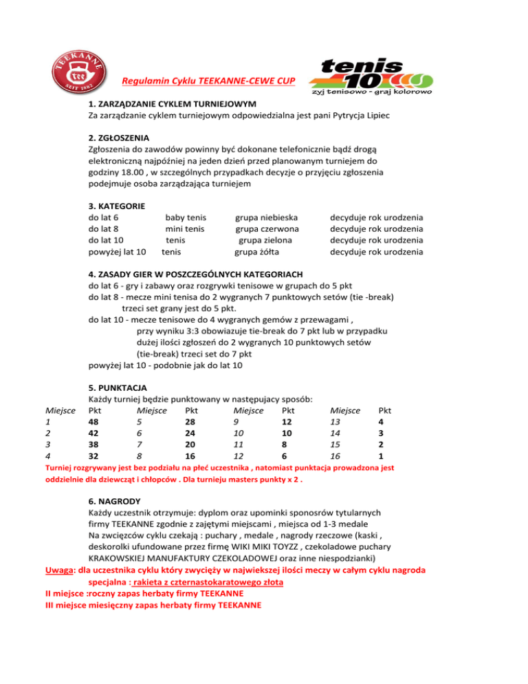 Regulamin Cyklu TEEKANNE-CEWE CUP 1. ZARZĄDZANIE CYKLEM TURNIEJOWYM Za zarządzanie cyklem turniejowym odpowiedzialna jest pani Pytrycja Lipiec 2. ZGŁOSZENIA Zgłoszenia do zawodów powinny być dokonane telefonicznie bądź drogą elektroniczną najpóźniej na jeden dzień przed planowanym turniejem do godziny 18.00 , w szczególnych przypadkach decyzje o przyjęciu zgłoszenia podejmuje osoba zarządzająca turniejem 3. KATEGORIE do lat 6 baby tenis grupa niebieska do lat 8 mini tenis grupa czerwona do lat 10 tenis grupa zielona powyżej lat 10 tenis grupa żółta decyduje rok urodzenia decyduje rok urodzenia decyduje rok urodzenia decyduje rok urodzenia 4. ZASADY GIER W POSZCZEGÓLNYCH KATEGORIACH do lat 6 - gry i zabawy oraz rozgrywki tenisowe w grupach do 5 pkt do lat 8 - mecze mini tenisa do 2 wygranych 7 punktowych setów (tie -break) trzeci set grany jest do 5 pkt. do lat 10 - mecze tenisowe do 4 wygranych gemów z przewagami , przy wyniku 3:3 obowiazuje tie-break do 7 pkt lub w przypadku dużej ilości zgłoszeń do 2 wygranych 10 punktowych setów (tie-break) trzeci set do 7 pkt powyżej lat 10 - podobnie jak do lat 10 Miejsce 1 2 3 4 5. PUNKTACJA Każdy turniej będzie punktowany w następujacy sposób: Pkt Miejsce Pkt Miejsce Pkt 48 5 28 9 12 42 6 24 10 10 38 7 20 11 8 32 8 16 12 6 Miejsce 13 14 15 16 Pkt 4 3 2 1 Turniej rozgrywany jest bez podziału na płeć uczestnika , natomiast punktacja prowadzona jest oddzielnie dla dziewcząt i chłopców . Dla turnieju masters punkty x 2 . 6. NAGRODY Każdy uczestnik otrzymuje: dyplom oraz upominki sponosrów tytularnych firmy TEEKANNE zgodnie z zajętymi miejscami , miejsca od 1-3 medale Na zwcięzców cyklu czekają : puchary , medale , nagrody rzeczowe (kaski , deskorolki ufundowane przez firmę WIKI MIKI TOYZZ , czekoladowe puchary KRAKOWSKIEJ MANUFAKTURY CZEKOLADOWEJ oraz inne niespodzianki) Uwaga: dla uczestnika cyklu który zwycięży w najwiekszej ilości meczy w całym cyklu nagroda specjalna : rakieta z czternastokaratowego złota II miejsce :roczny zapas herbaty firmy TEEKANNE III miejsce miesięczny zapas herbaty firmy TEEKANNE 7. PLANOWANE TURNIEJE Teekanne - Cewe Cup dzieci od lat 6, 8, 10 i 10 + Miasta i terminy turniejów : 30.05-Kędzierzyn -Koźle 09.06 - Zabrze 15.06 - Wrocław 16.06 - Kraków 30.06 - Opole 07.07 - Bielsko - Biała 11.07 - Opoczno 12.07 - Łódź 14.07 - Warszawa 16.07 - Konin 03.08 - Rychwałd 14.09 - Kędzierzyn - Koźle. ( Masters ) .... Weryfikacja : 10 lat - 9:45-10:00 6 lat - 11:30 8 lat - 13:00 10+ lat - 14:00 O szczególnych przypadkach regulaminowych decyduje p. Patrycja Lipiec telefon kontaktowy: 515 777 337 Mail: [email protected]