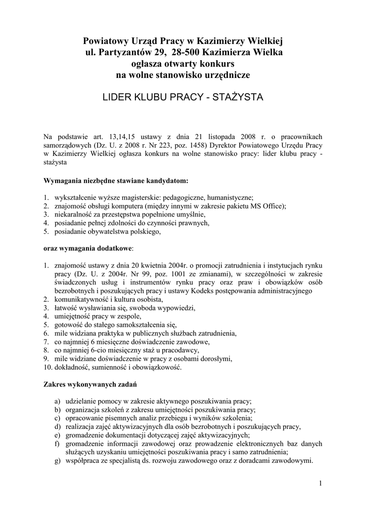 Powiatowy Urząd Pracy w Kazimierzy Wielkiej ul. Partyzantów 29, 28-500 Kazimierza Wielka ogłasza otwarty konkurs na wolne stanowisko urzędnicze LIDER KLUBU PRACY - STAŻYSTA Na podstawie art. 13,14,15 ustawy z dnia 21 listopada 2008 r. o pracownikach samorządowych (Dz. U. z 2008 r. Nr 223, poz. 1458) Dyrektor Powiatowego Urzędu Pracy w Kazimierzy Wielkiej ogłasza konkurs na wolne stanowisko pracy: lider klubu pracy stażysta Wymagania niezbędne stawiane kandydatom: 1. 2. 3. 4. 5. wykształcenie wyższe magisterskie: pedagogiczne, humanistyczne; znajomość obsługi komputera (między innymi w zakresie pakietu MS Office); niekaralność za przestępstwa popełnione umyślnie, posiadanie pełnej zdolności do czynności prawnych, posiadanie obywatelstwa polskiego, oraz wymagania dodatkowe: 1. znajomość ustawy z dnia 20 kwietnia 2004r. o promocji zatrudnienia i instytucjach rynku pracy (Dz. U. z 2004r. Nr 99, poz. 1001 ze zmianami), w szczególności w zakresie świadczonych usług i instrumentów rynku pracy oraz praw i obowiązków osób bezrobotnych i poszukujących pracy i ustawy Kodeks postępowania administracyjnego 2. komunikatywność i kultura osobista, 3. łatwość wysławiania się, swoboda wypowiedzi, 4. umiejętność pracy w zespole, 5. gotowość do stałego samokształcenia się, 6. mile widziana praktyka w publicznych służbach zatrudnienia, 7. co najmniej 6 miesięczne doświadczenie zawodowe, 8. co najmniej 6-cio miesięczny staż u pracodawcy, 9. mile widziane doświadczenie w pracy z osobami dorosłymi, 10. dokładność, sumienność i obowiązkowość. Zakres wykonywanych zadań a) b) c) d) e) f) udzielanie pomocy w zakresie aktywnego poszukiwania pracy; organizacja szkoleń z zakresu umiejętności poszukiwania pracy; opracowanie pisemnych analiz przebiegu i wyników szkolenia; realizacja zajęć aktywizacyjnych dla osób bezrobotnych i poszukujących pracy, gromadzenie dokumentacji dotyczącej zajęć aktywizacyjnych; gromadzenie informacji zawodowej oraz prowadzenie elektronicznych baz danych służących uzyskaniu umiejętności poszukiwania pracy i samo zatrudnienia; g) współpraca ze specjalistą ds. rozwoju zawodowego oraz z doradcami zawodowymi. 1 Określenie stanowiska: 1) wymiar etatu: pełny (umowa na czas określony) 2) ilość etatów: 1 Wymagane dokumenty: 1) życiorys zawodowy i list motywacyjny, 2) kwestionariusz dla osoby ubiegającej się o zatrudnienie ( do pobrania w sekretariacie PUP Kazimierza Wielka pok. nr 7 lub ze strony PUP (załącznik nr 1), 3) kserokopie dokumentów potwierdzających posiadane kwalifikacje (udokumentowanie posiadanej wiedzy niezbędnej do wykonywania obowiązków, kserokopie dokumentów potwierdzających posiadane wykształcenie, ukończenie kursów, szkoleń, studiów podyplomowych); 4) kserokopie świadectw pracy i inne dokumenty potwierdzające staż, praktyki zawodowe potwierdzające posiadanie doświadczenia zawodowego, 5) wobec kandydatów którzy nie są obywatelami polskimi, ale są obywatelami Unii Europejskiej lub obywatelami innych państw, którym na podstawie umów międzynarodowych lub przepisów prawa wspólnotowego przysługuje prawo do podjęcia zatrudnienia na terytorium Rzeczypospolitej Polskiej, dokument poświadczający znajomość języka polskiego, określonym w przepisach o służbie cywilnej, 6) kserokopie posiadanych referencji i opinii 7) oświadczenie o wyrażeniu zgody na umieszczeniu imienia, nazwiska i miejsca zamieszkania w rozumieniu przepisów Kodeksu cywilnego (miejscowości) na liście kandydatów spełniających wymagania formalne, która zostanie opublikowana na stronie BIP i tablicy ogłoszeń Urzędu.( załącznik Nr 2) 8) informacja o terminie umożliwiającym podjęcie pracy w PUP Kazimierza Wielka wg wzoru stanowiącego załącznik Nr 2, 9) oświadczenie kandydata o korzystaniu z pełni praw publicznych i o niekaralności za przestępstwa popełnione umyślnie,( załącznik Nr 2) 10) oświadczenie o wyrażeniu zgody na przetwarzanie danych osobowych do celów rekrutacji o treści: „Wyrażam zgodę na przetwarzanie moich danych osobowych zawartych w ofercie pracy dla potrzeb niezbędnych do realizacji procesu rekrutacji w PUP Kazimierza Wielka.” zgodnie z ustawą z dnia 29.08.1997r. o ochronie danych osobowych (tekst jednolity z 2002r. Dz. U. Nr 101, poz. 926 z późn. zmianami) oraz Ustawą z dnia 21.11.2008r. o pracownikach samorządowych (Dz. U. z 2008r. Nr 223 poz. 1458).(załącznik Nr 2). 11) Oświadczenie o treści: „Wyrażam zgodę na komisyjne zniszczenie złożonej prze mnie oferty (wraz z kserokopiami dokumentów), uznanej za nie spełniającą wymagań formalnych lub złożoną po terminie, w przypadku jej nieodebrania w terminie 2 tygodni od upowszechnienia w Biuletynie Informacji Publicznej listy kandydatów spełniających wymagania formalne, jak również złożonej w terminie i spełniającej wymagania formalne oferty wraz z kserokopiami dokumentów, nie odebranej przeze mnie w terminie 2 tygodni od zakończenia procedury naboru” wg wzoru stanowiącego załącznik Nr 2. Dokumenty należy składać: osobiście - w sekretariacie Powiatowego Urzędu Pracy w Kazimierzy Wielkiej przy ul. Partyzantów 29, pokój nr 7, do 16 grudnia 2010r. do godz. 10.00, lub drogą pocztową na adres: Powiatowy Urząd Pracy w Kazimierzy Wielkiej, ul. Partyzantów 29, 28-500 Kazimierza Wielka. Za datę doręczenia dokumentów uważa się datę wpływu do PUP w Kazimierza Wielka, ul. Partyzantów 29. 2 Koperta z ofertą powinna być zaklejona i opatrzona imieniem i nazwiskiem i adresem zwrotnym nadawcy oraz dopiskiem „Konkurs na stanowisko pracy –lider klubu pracy stażysta”. Oferty konkursowe, które wpłyną do urzędu po wyżej wymienionym terminie, jak również nie spełniające wymogów formalnych nie będą rozpatrywane i zostaną komisyjnie zniszczone. Jednocześnie Powiatowy Urząd Pracy w Kazimierzy Wielkiej informuje, że istnieje możliwość nie wybr