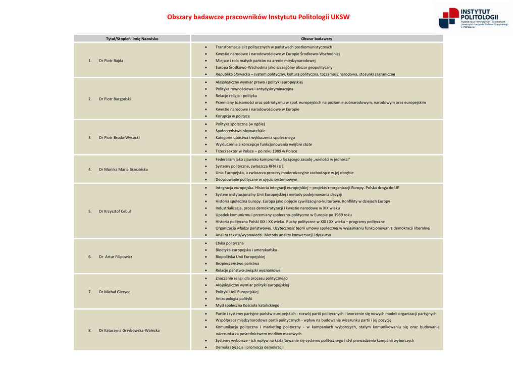 Obszary badawcze pracowników Instytutu Politologii UKSW Tytuł/Stopień Imię Nazwisko 1. 2. 3. 4. 5. 6. 7. 8. Dr Piotr Bajda Dr Piotr Burgoński Dr Piotr Broda-Wysocki Dr Monika Maria Brzezińska Dr Krzysztof Cebul Dr Artur Filipowicz Dr Michał Gierycz Dr Katarzyna Grzybowska-Walecka Obszar badawczy Transformacja elit politycznych w państwach postkomunistycznych Kwestie narodowe i narodowościowe w Europie Środkowo-Wschodniej Miejsce i rola małych państw na arenie międzynarodowej Europa Środkowo-Wschodnia jako szczególny obszar geopolityczny Republika Słowacka – system polityczny, kultura polityczna, tożsamość narodowa, stosunki zagraniczne Aksjologiczny wymiar prawa i polityki europejskiej Polityka równościowa i antydyskryminacyjna Relacje religia - polityka Przemiany tożsamości oraz patriotyzmu w społ. europejskich na poziomie subnarodowym, narodowym oraz europejskim Kwestie narodowe i narodowościowe w Europie Korupcja w polityce Polityka społeczne (w ogóle) Społeczeństwo obywatelskie Kategorie ubóstwa i wykluczenia społecznego Wykluczenie a koncepcje funkcjonowania welfare state Trzeci sektor w Polsce – po roku 1989 w Polsce Federalizm jako zjawisko kompromisu łączącego zasadę „wielości w jedności” Systemy polityczne, zwłaszcza RFN i UE Unia Europejska, a zwłaszcza procesy modernizacyjne zachodzące w jej obrębie Decydowanie polityczne w ujęciu systemowym Integracja europejska. Historia integracji europejskiej – projekty reorganizacji Europy. Polska droga do UE System instytucjonalny Unii Europejskiej i metody podejmowania decyzji Historia społeczna Europy. Europa jako pojęcie cywilizacyjno-kulturowe. Konflikty w dziejach Europy Industrializacja, proces demokratyzacji i kwestie narodowe w XIX wieku Upadek komunizmu i przemiany społeczno-polityczne w Europie po 1989 roku Historia polityczna Polski XIX i XX wieku. Ruchy polityczne w XIX i XX wieku – programy polityczne Organizacja władzy państwowej. Użyteczność teorii umowy społecznej w wyjaśnianiu funkcjonowania demokracji liberalnej Analiza tekstu/wypowiedzi. Metody analizy konwersacji i dyskursu Etyka polityczna Bioetyka europejska i amerykańska Biopolityka Unii Europejskiej Bezpieczeństwo państwa Relacje państwo-związki wyznaniowe Znaczenie religii dla procesu politycznego Aksjologiczny wymiar polityki europejskiej Polityki Unii Europejskiej Antropologia polityki Myśl społeczna Kościoła katolickiego Partie i systemy partyjne państw europejskich - rozwój partii politycznych i tworzenie się nowych modeli organizacji partyjnych Współpraca międzynarodowa partii politycznych - wpływ na budowanie wizerunku partii i jej pozycję Komunikacja polityczna i marketing polityczny - w kampaniach wyborczych, stałym komunikowaniu się oraz budowanie Systemy wyborcze - ich wpływ na kształtowanie się systemu politycznego i styl prowadzenia kampanii wyborczych Demokratyzacja i promocja demokracji wizerunku za pośrednictwem mediów masowych 9. 10. 11. 12. 13. 14. Dr Anna Jaroń Dr Marek Jarentowski Dr Tadeusz Kamiński Dr Grzegorz Kęsik Dr Paweł Matuszewski Dr Zbigniew Mikołajczyk Systemy ochrony praw człowieka Prawo międzynarodowe publiczne Socjologia prawa Demokratyzacja Systemy polityczne, w szczególności: systemy wyborcze, systemy rządów, parlamenty, administracja publiczna Prawo konstytucyjne, prawo administracyjne ustrojowe Technika legislacyjna Polityka społeczna Praca socjalna Stosunki państwo – Kościół Trzeci sektor i społeczeństwo obywatelskie Etyka zawodowa: cele, funkcje, uzasadnienia Ochrona zabytków w wymiarze lokalnym (aspekty prawne) Związki architektury i władzy (od czasów starożytnych aż po XXI wiek) Modele kształtowania miejskich przestrzeni historycznych Europejski kontekst ochrony i rozwoju miast historycznych Zachowania wyborcze w perspektywie teorii systemowych Opinia publiczna i świadomość zbiorowa elektoratu Klasy społeczne Grupy interesów w procesach zmian systemowych w gospodarce (sektor publiczny) Historia Twierdzy Modlin Systemy bezpieczeństwa Przejawy i przyczyny przestępczości Śledcze badanie miejsca zdarzenia przestępczego i metody identyfikacji sprawcy przestępstwa na podstawie ujawnionych Społeczne aspekty działań związanych z ustaleniem faktu i sposobu popełnienia przestępstwa, wykrywaniem sprawców Ruch feministyczny jako aktor polityczny Migracje kobiet Polityka emancypacji i polityka życia jako domena działania nowych ruchów społecznych Patologie życia społecznego Religia i religijność współczesnego społeczeństwa polskiego Polityka penitencjarna Wypalenie zawodowe pracowników i wolontariuszy pomocy społecznej i pracy socjalnej Duszpasterstwo więzienne Problemy i kwestie społeczne Systemy partyjne w Europie i Polsce Systemy polityczne w Europie i Polsce Systemy wyborcze w Europie i Polsce Szkolnictwo wyznaniowe Zewnętrzne relacje Unii Europejskiej Procesy decyzyjne w Unii Europejskiej po zmianach wprowadzonych przez Traktat z Lizbony Rola Kościoła katolickiego w procesach integracji europejskiej Fenomen procesu instytucjonalizacji współczesnych stosunków międzynarodowych Współczesne teorie oraz metodologia w nauce o stosunkach międzynarodowych Metodologia oraz teoria w studiach europejskich śladów przestępstw i zapobieganiem przestępstwom oraz innym zjawiskom patologicznym 15. 16. 17. 18. Dr Małgorzata Pawlus Dr Jan Pol Dr Andrzej Rudowski Dr Anna Skolimowska 19. 20. 21. 22. 23. 24. 25. 26. 27. Dr Sławomir Sowiński Dr Benjamin D. Stanley Dr Monika Trojanowska-Strzęboszewska Dr Kinga Wojtas Dr hab. Janusz Balicki, prof. UKSW Współczesna myśl polityczna System polityczny i partyjny RP Polityka i religia Modele relacji państwo Kościół w Unii Europejskiej Państwo narodowe i tożsamość narodowa Studia porównawcze nad europejskimi partiami politycznymi i systemami partyjnymi Polityka i społeczeństwo we współczesnej Polsce Tworzenie się podziałów w kraj