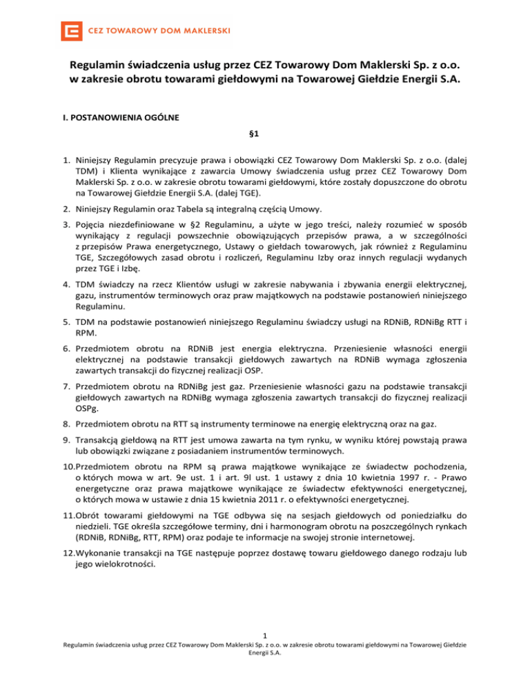 Regulamin świadczenia usług przez CEZ Towarowy Dom Maklerski Sp. z o.o. w zakresie obrotu towarami giełdowymi na Towarowej Giełdzie Energii S.A. I. POSTANOWIENIA OGÓLNE §1 1. Niniejszy Regulamin precyzuje prawa i obowiązki CEZ Towarowy Dom Maklerski Sp. z o.o. (dalej TDM) i Klienta wynikające z zawarcia Umowy świadczenia usług przez CEZ Towarowy Dom Maklerski Sp. z o.o. w zakresie obrotu towarami giełdowymi, które zostały dopuszczone do obrotu na Towarowej Giełdzie Energii S.A. (dalej TGE). 2. Niniejszy Regulamin oraz Tabela są integralną częścią Umowy. 3. Pojęcia niezdefiniowane w §2 Regulaminu, a użyte w jego treści, należy rozumieć w sposób wynikający z regulacji powszechnie obowiązujących przepisów prawa, a w szczególności z przepisów Prawa energetycznego, Ustawy o giełdach towarowych, jak również z Regulaminu TGE, Szczegółowych zasad obrotu i rozliczeń, Regulaminu Izby oraz innych regulacji wydanych przez TGE i Izbę. 4. TDM świadczy na rzecz Klientów usługi w zakresie nabywania i zbywania energii elektrycznej, gazu, instrumentów terminowych oraz praw majątkowych na podstawie postanowień niniejszego Regulaminu. 5. TDM na podstawie postanowień niniejszego Regulaminu świadczy usługi na RDNiB, RDNiBg RTT i RPM. 6. Przedmiotem obrotu na RDNiB jest energia elektryczna. Przeniesienie własności energii elektrycznej na podstawie transakcji giełdowych zawartych na RDNiB wymaga zgłoszenia zawartych transakcji do fizycznej realizacji OSP. 7. Przedmiotem obrotu na RDNiBg jest gaz. Przeniesienie własności gazu na podstawie transakcji giełdowych zawartych na RDNiBg wymaga zgłoszenia zawartych transakcji do fizycznej realizacji OSPg. 8. Przedmiotem obrotu na RTT są instrumenty terminowe na energię elektryczną oraz na gaz. 9. Transakcją giełdową na RTT jest umowa zawarta na tym rynku, w wyniku której powstają prawa lub obowiązki związane z posiadaniem instrumentów terminowych. 10.Przedmiotem obrotu na RPM są prawa majątkowe wynikające ze świadectw pochodzenia, o których mowa w art. 9e ust. 1 i art. 9l ust. 1 ustawy z dnia 10 kwietnia 1997 r. - Prawo energetyczne oraz prawa majątkowe wynikające ze świadectw efektywności energetycznej, o których mowa w ustawie z dnia 15 kwietnia 2011 r. o efektywności energetycznej. 11.Obrót towarami giełdowymi na TGE odbywa się na sesjach giełdowych od poniedziałku do niedzieli. TGE określa szczegółowe terminy, dni i harmonogram obrotu na poszczególnych rynkach (RDNiB, RDNiBg, RTT, RPM) oraz podaje te informacje na swojej stronie internetowej. 12.Wykonanie transakcji na TGE następuje poprzez dostawę towaru giełdowego danego rodzaju lub jego wielokrotności. 1 Regulamin świadczenia usług przez CEZ Towarowy Dom Maklerski Sp. z o.o. w zakresie obrotu towarami giełdowymi na Towarowej Giełdzie Energii S.A. §2 Ilekroć w niniejszym Regulaminie jest mowa o: 1. Regulaminie - rozumie się przez to Regulamin świadczenia usług przez TDM w zakresie obrotu towarami giełdowymi na TGE, 2. Osobie krajowej - rozumie się przez to rezydenta w rozumieniu przepisów ustawy z dnia 27 lipca 2002 r. - prawo dewizowe (Dz. U. z 2002 r. Nr 141, poz. 1178 z późn. zm.), 3. Osobie zagranicznej - rozumie się przez to nierezydenta w rozumieniu przepisów ustawy z dnia 27 lipca 2002 r. - prawo dewizowe (Dz. U. z 2002 r. Nr 141, poz. 1178 z późn. zm.), 4. Prawie energetycznym - rozumie się przez to ustawę z dnia 10 kwietnia 1997 r. - prawo energetyczne (tekst jednolity Dz. U. z 2012 r. poz. 1059 z późn. zm.), 5. Ustawie - rozumie się przez to ustawę z dnia 26 października 2000 r. o giełdach towarowych (tekst jednolity Dz. U. z 2010 r. Nr 48, poz. 284 z późn. zm.), 6. IRiESPe - rozumie się przez to Instrukcję Ruchu i Eksploatacji Sieci Przesyłowej opracowaną przez Operatora Systemu Przesyłowego zgodnie z art. 9 g ustawy Prawo energetyczne, 7. IRiESPg - rozumie się przez to Instrukcję Ruchu i Eksploatacji Sieci Przesyłowej opracowaną przez Operatora Gazociągów Przesyłowych GAZ – SYSTEM S.A. zgodnie z art. 9 g ustawy Prawo energetyczne, 8. Umowie - rozumie się przez to umowę zawartą pomiędzy TDM a Klientem, w której TDM zobowiązuje się wobec Klienta do prowadzenia działalności maklerskiej w zakresie czynności związanych z obrotem towarami giełdowymi, polegających na (i) nabywaniu i zbywaniu towarów giełdowych na rachunek Klienta na zasadach określonych w art. 38b Ustawy, tj. działalności, o której jest mowa w art. 38 ust. 2 pkt 2 Ustawy, oraz (ii) prowadzenia rachunków i rejestrów towarów giełdowych w obrocie giełdowym, tj. działalności, o której mowa w art. 38 ust.2 pkt 3 Ustawy, 9. Kliencie - rozumie się przez to osobę prawną lub jednostkę organizacyjną nieposiadającą osobowości prawnej, która posiada zawartą z TDM Umowę o świadczenie usług maklerskich, 10. Koncesji - rozumie się przez to wydaną przez Prezesa Urzędu Regulacji Energetyki koncesję na wytwarzanie i/lub przesyłanie i/lub dystrybucję i/lub obrót energią elektryczną, bądź paliwami gazowymi. 11. Energii elektrycznej - rozumie się przez to towar giełdowy, o którym mowa w art. 2 pkt 2 lit. b Ustawy, 12. Paliwie gazowym (Gazie) – rozumie się przez to towar giełdowy, o którym mowa w art. 2 pkt 2 lit. b Ustawy, 13. Instrumentach terminowych - rozumie się przez to niebędące instrumentami finansowymi prawa majątkowe, których cena w sposób pośredni lub bezpośredni zależy od ceny lub wartości określonych rodzajów energii lub paliw gazowych, o których mowa w art. 2 pkt 2 lit. e Ustawy, 14. Giełdzie towarowej - rozumie się przez to giełdę towarową w rozumieniu Ustawy, w szczególności Towarową Giełdę Energii S.A., 15. TGE - rozumie się przez to Towarową Giełdę Energii S.A., 16. IRGiT - rozumie się przez to Izbę Rozliczeniową Giełd Towarowych S.A., 17. Izbie - rozumie się przez to giełdową izbę rozrachunkową prowadzoną przez IRGiT, 2