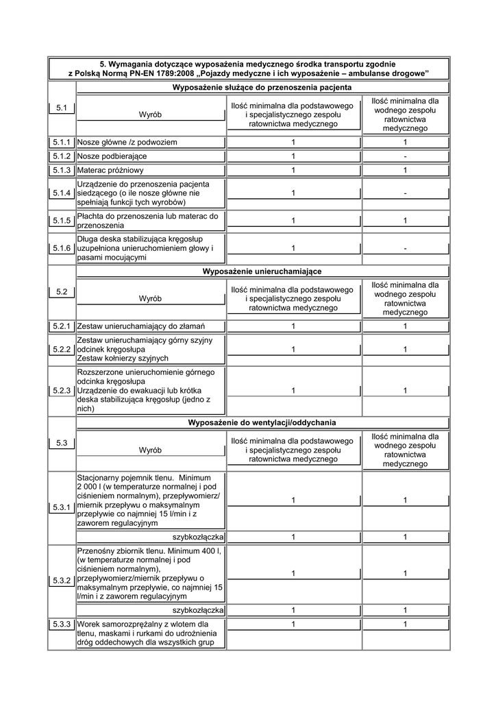 5. Wymagania dotyczące wyposażenia medycznego środka transportu zgodnie z Polską Normą PN-EN 1789:2008 „Pojazdy medyczne i ich wyposażenie – ambulanse drogowe” Wyposażenie służące do przenoszenia pacjenta Ilość minimalna dla podstawowego i specjalistycznego zespołu ratownictwa medycznego Ilość minimalna dla wodnego zespołu ratownictwa medycznego 5.1.1 Nosze główne /z podwoziem 1 1 5.1.2 Nosze podbierające 1 - 5.1.3 Materac próżniowy 1 1 Urządzenie do przenoszenia pacjenta 5.1.4 siedzącego (o ile nosze główne nie spełniają funkcji tych wyrobów) 1 - 1 1 1 - 5.1 5.1.5 Wyrób Płachta do przenoszenia lub materac do przenoszenia Długa deska stabilizująca kręgosłup 5.1.6 uzupełniona unieruchomieniem głowy i pasami mocującymi Wyposażenie unieruchamiające Ilość minimalna dla podstawowego i specjalistycznego zespołu ratownictwa medycznego Ilość minimalna dla wodnego zespołu ratownictwa medycznego 5.2.1 Zestaw unieruchamiający do złamań 1 1 Zestaw unieruchamiający górny szyjny 5.2.2 odcinek kręgosłupa Zestaw kołnierzy szyjnych 1 1 Rozszerzone unieruchomienie górnego odcinka kręgosłupa 5.2.3 Urządzenie do ewakuacji lub krótka deska stabilizująca kręgosłup (jedno z nich) 1 1 5.2 Wyrób Wyposażenie do wentylacji/oddychania Ilość minimalna dla podstawowego i specjalistycznego zespołu ratownictwa medycznego Ilość minimalna dla wodnego zespołu ratownictwa medycznego 1 1 szybkozłączka 1 1 Przenośny zbiornik tlenu. Minimum 400 l, (w temperaturze normalnej i pod ciśnieniem normalnym), 5.3.2 przepływomierz/miernik przepływu o maksymalnym przepływie, co najmniej 15 l/min i z zaworem regulacyjnym 1 1 szybkozłączka 1 1 1 1 5.3 Wyrób Stacjonarny pojemnik tlenu. Minimum 2 000 l (w temperaturze normalnej i pod ciśnieniem normalnym), przepływomierz/ 5.3.1 miernik przepływu o maksymalnym przepływie co najmniej 15 l/min i z zaworem regulacyjnym 5.3.3 Worek samorozprężalny z wlotem dla tlenu, maskami i rurkami do udrożnienia dróg oddechowych dla wszystkich grup wiekowych oraz rezerwuarem tlenu Mechaniczne urządzenie do odsysania 5.3.4 o minimalnym ciśnieniu 65 kPa i minimalnej pojemności 1 I 1 1 5.3.5 Przenośne urządzenie do odsysania 1 1 Wyposażenie diagnostyczne Wyrób Ilość minimalna dla podstawowego i specjalistycznego zespołu ratownictwa medycznego Ilość minimalna dla wodnego zespołu ratownictwa medycznego Aparat do ręcznego pomiaru ciśnienia krwi, rozmiary mankietów 10 cm – 66 cm 1 1 5.4.2 Oksymetr 1 - 5.4.3 Stetoskop 1 1 5.4 5.4.1 5.4.4 Termometr (zakres minimalny od 28 °C do 42 °C) 1 1 5.4.5 Urządzenie do oznaczania glukozy we krwi 1 1 1 1 Ilość minimalna dla podstawowego i specjalistycznego zespołu ratownictwa medycznego Ilość minimalna dla wodnego zespołu ratownictwa medycznego 1 1 5.4.6 Latarka diagnostyczna Leki 5.5 Rodzaj leku 5.5.1 Przeciwbólowy Wyposażenie do infuzji Ilość minimalna dla podstawowego i specjalistycznego zespołu ratownictwa medycznego Ilość minimalna dla wodnego zespołu ratownictwa medycznego 5.6.1 Płyny infuzyjne, litry 4 4 5.6.2 Zestawy do iniekcji i infuzji 2 2 Układ do infuzji przeznaczony do podawania płynu ogrzanego do (37 ± 2) 5.6.3 °C (nie wymaga się, aby ten układ był przenośny) 1 1 5.6.4 Uchwyt do zestawów do infuzji 2 2 5.6.5 Urządzenie do infuzji pod ciśnieniem 1 1 5.6 Wyrób Wyposażenie do postępowania w nagłych stanach zagrożenia zdrowotnego 5.7 5.7.1 5.7.2 5.7.3 Ilość minimalna Ilość minimalna dla dla specjalistycznego podstawowego zespołu zespołu ratownictwa ratownictwa medycznego medycznego Wyrób Defibrylator z rejestratorem rytmu i a danych pacjenta a Monitor kardiologiczny a Kardiostymulator zewnętrzny Ilość minimalna dla wodnego zespołu ratownictwa medycznego 1 1 1 1 1 1 1 1 1 Przenośny zestaw rurek do udrażniania dróg oddechowych (p.a.c.s.) Worek samorozprężalny ręczny Maska z ustnikiem do wentylacji z wlotem 5.7.4 dla tlenu Rurki ustno- i nosowo-gardłowe Ssak Cewniki do odsysania 1 1 1 Przenośny rozszerzony zestaw do udrażniania dróg oddechowych (p.a.c.s.) Zawartość przenośnego zestawu rurek do udrażniania dróg oddechowych (p.a.c.s.) Zestaw do infuzji – łącznie z odpowiednimi kaniulami dożylnymi zakładanymi na stałe Zestaw do podawania płynów infuzyjnych Płyny infuzyjne 5.7.5 Samoprzylepne materiały do mocowania Zestaw do intubacji – zawierający rękojeść(-ci) laryngoskopu i odpowiednie łopatki Kleszczyki Magilla Mandryny/prowadnice do wprowadzania Rurki dotchawicze z łącznikami Zacisk do rurki do napełniania mankietu Mocowania rurek Stetoskop Zestaw do podawania leków 1 1 1 5.7.6 Aparat do nebulizacji 1 1 - - 1 - 1 - 1 5.7.10 Respirator ratowniczo-transportowy 1 1 1 Zastawka wytwarzająca dodatnie 5.7.11 ciśnienie końcowe wydechowe (PEEP), regulowana lub o stałym ciśnieniu - 1 1 5.7.12 Kapnometr - 1 - 5.7.7 Zestaw do drenażu klatki piersiowej 5.7.8 Wolumetryczna pompa infuzyjna 5.7.9 Kaniule do wkłuć centralnych b 1 b 1 a Jeżeli to pożądane, jedno urządzenie może spełniać dwie lub kilka z tych funkcji. b Wymagany tylko w wodnych specjalistycznych zespołach ratownictwa medycznego. Wyroby bandażowanie i pielęgnacja Ilość minimalna dla podstawowego i specjalistycznego zespołu ratownictwa medycznego Ilość minimalna dla wodnego zespołu ratownictwa medycznego 5.8.1 Pościel 1 1 5.8.2 Koce 2 2 5.8.3 Materiały do opatrywania ran 1 1 1 1 5.8.5 Miska nerkowata 1 1 5.8.6 Worek na wymiociny 1 2 5.8 5.8.4 Wyrób Materiały do leczenia oparzeń termicznych i chemicznych 5.8.7 Pojemnik na mocz (niewykonany ze szkła) 1 1 5.8.8 Pojemnik na zużyte materiały ostre 1 1 5.8.9 Zgłębnik żołądkowy z wyposażeniem 1 1 5 5 100 100 5.8.12 Zestaw porodowy 1 1 5.8.13 Worek na odpady 1 1 5.8.14 Worek na odpady medyczne 1 1 1 1 5.8.10 Rękawice chirurgiczne sterylne, liczba par 5.8.11 Rękawice jednorazowego użytku niesterylne 5.8.15 Nieprzepuszczalne prześcieradło na nosze Śr