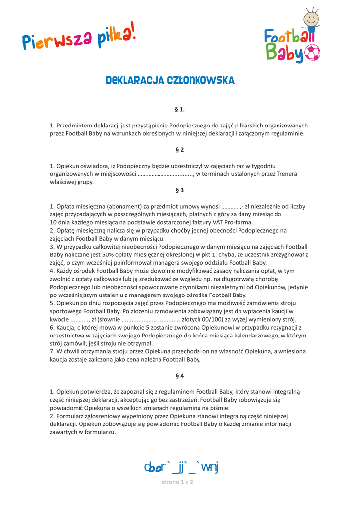 deklaracja członkowska § 1. 1. Przedmiotem deklaracji jest przystąpienie Podopiecznego do zajęć piłkarskich organizowanych przez Football Baby na warunkach określonych w niniejszej deklaracji i załączonym regulaminie. §2 1. Opiekun oświadcza, iż Podopieczny będzie uczestniczył w zajęciach raz w tygodniu organizowanych w miejscowości ……………………..........., w terminach ustalonych przez Trenera właściwej grupy. §3 1. Opłata miesięczna (abonament) za przedmiot umowy wynosi ………...,- zł niezależnie od liczby zajęć przypadających w poszczególnych miesiącach, płatnych z góry za dany miesiąc do 10 dnia każdego miesiąca na podstawie dostarczonej faktury VAT Pro-forma. 2. Opłatę miesięczną nalicza się w przypadku choćby jednej obecności Podopiecznego na zajęciach Football Baby w danym miesiącu. 3. W przypadku całkowitej nieobecności Podopiecznego w danym miesiącu na zajęciach Football Baby naliczane jest 50% opłaty miesięcznej określonej w pkt 1. chyba, że uczestnik zrezygnował z zajęć, o czym wcześniej poinformował managera swojego oddziału Football Baby. 4. Każdy ośrodek Football Baby może dowolnie modyfikować zasady naliczania opłat, w tym zwolnić z opłaty całkowicie lub ją zredukować ze względu np. na długotrwałą chorobę Podopiecznego lub nieobecności spowodowane czynnikami niezależnymi od Opiekunów, jedynie po wcześniejszym ustaleniu z managerem swojego ośrodka Football Baby. 5. Opiekun po dniu rozpoczęcia zajęć przez Podopiecznego ma możliwość zamówienia stroju sportowego Football Baby. Po złożeniu zamówienia zobowiązany jest do wpłacenia kaucji w kwocie ..........., zł (słownie ................................... złotych 00/100) za wyżej wymieniony strój. 6. Kaucja, o której mowa w punkcie 5 zostanie zwrócona Opiekunowi w przypadku rezygnacji z uczestnictwa w zajęciach swojego Podopiecznego do końca miesiąca kalendarzowego, w którym strój zamówił, jeśli stroju nie otrzymał. 7. W chwili otrzymania stroju przez Opiekuna przechodzi on na własność Opiekuna, a wniesiona kaucja zostaje zaliczona jako cena należna Football Baby. §4 1. Opiekun potwierdza, że zapoznał się z regulaminem Football Baby, który stanowi integralną część niniejszej deklaracji, akceptując go bez zastrzeżeń. Football Baby zobowiązuje się powiadomić Opiekuna o wszelkich zmianach regulaminu na piśmie. 2. Formularz zgłoszeniowy wypełniony przez Opiekuna stanowi integralną część niniejszej deklaracji. Opiekun zobowiązuje się powiadomić Football Baby o każdej zmianie informacji zawartych w formularzu. f tballbaby.pl §5 1. Opiekun oświadcza, iż Podopieczny został poddany stosownym badaniom oraz że stan zdrowia Podopiecznego jest dobry i umożliwia mu udział w zajęciach, a nadto oświadcza, iż nie są mu znane jakiekolwiek przeciwwskazania do udziału Podopiecznego w zajęciach Football Baby. §6 1. Opiekun wyraża zgodę na wykorzystywanie wizerunku Podopiecznego w zakresie promocji marki Football Baby oraz podmiotów współpracujących, produktów oferowanych przez Football Baby i podmioty współpracujące. 2. Podmiotami współpracującymi w rozumieniu niniejszej deklaracji są: adidas Poland sp. z o.o., North Coast (przedstawiciel marki Isostar), Learning Systems Poland (właściciel marki empik school), Playarena sp. z o.o., Egmont Polska Sp. z o.o., Electronic Arts Sp. z o.o. oraz ........... §7 1. W sprawach nieuregulowanych niniejszą deklaracją zastosowanie mają właściwe przepisy. §8 1. Niniejsza deklaracja została sporządzona w dwóch jednobrzmiących egzemplarzach, po jednym dla Opiekuna i Football Baby. f tballbaby.pl
