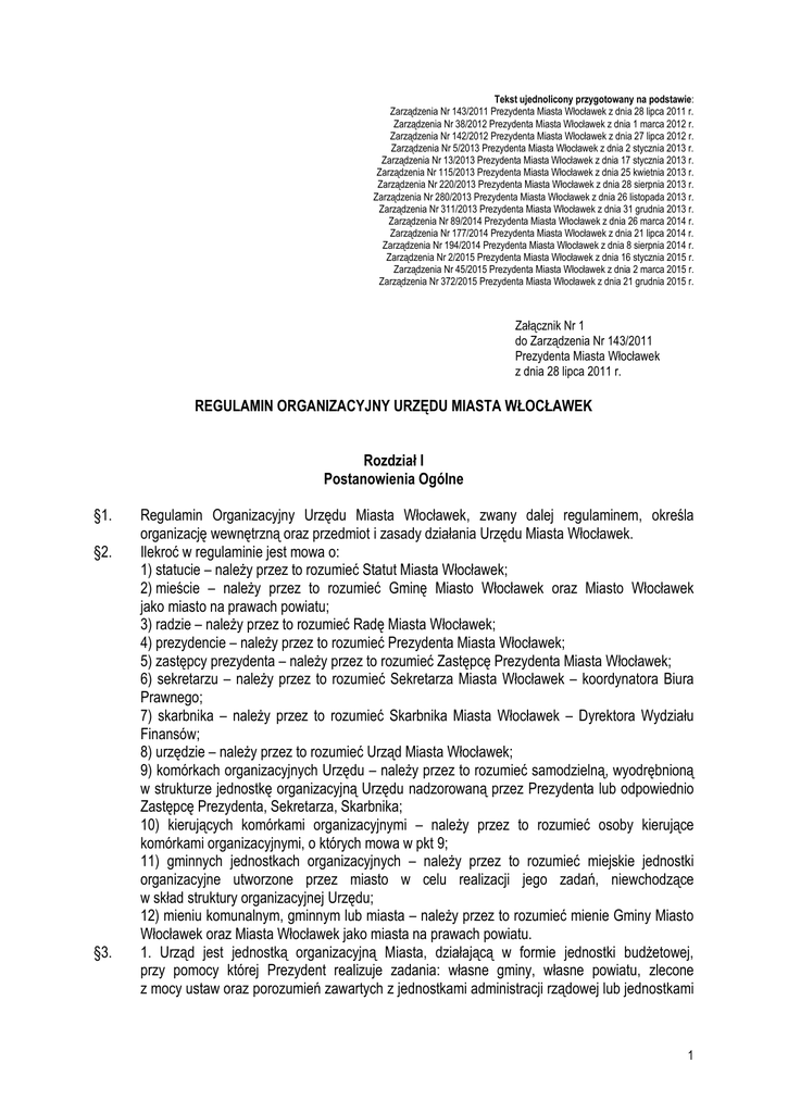 Tekst ujednolicony przygotowany na podstawie: Zarządzenia Nr 143/2011 Prezydenta Miasta Włocławek z dnia 28 lipca 2011 r. Zarządzenia Nr 38/2012 Prezydenta Miasta Włocławek z dnia 1 marca 2012 r. Zarządzenia Nr 142/2012 Prezydenta Miasta Włocławek z dnia 27 lipca 2012 r. Zarządzenia Nr 5/2013 Prezydenta Miasta Włocławek z dnia 2 stycznia 2013 r. Zarządzenia Nr 13/2013 Prezydenta Miasta Włocławek z dnia 17 stycznia 2013 r. Zarządzenia Nr 115/2013 Prezydenta Miasta Włocławek z dnia 25 kwietnia 2013 r. Zarządzenia Nr 220/2013 Prezydenta Miasta Włocławek z dnia 28 sierpnia 2013 r. Zarządzenia Nr 280/2013 Prezydenta Miasta Włocławek z dnia 26 listopada 2013 r. Zarządzenia Nr 311/2013 Prezydenta Miasta Włocławek z dnia 31 grudnia 2013 r. Zarządzenia Nr 89/2014 Prezydenta Miasta Włocławek z dnia 26 marca 2014 r. Zarządzenia Nr 177/2014 Prezydenta Miasta Włocławek z dnia 21 lipca 2014 r. Zarządzenia Nr 194/2014 Prezydenta Miasta Włocławek z dnia 8 sierpnia 2014 r. Zarządzenia Nr 2/2015 Prezydenta Miasta Włocławek z dnia 16 stycznia 2015 r. Zarządzenia Nr 45/2015 Prezydenta Miasta Włocławek z dnia 2 marca 2015 r. Zarządzenia Nr 372/2015 Prezydenta Miasta Włocławek z dnia 21 grudnia 2015 r. Załącznik Nr 1 do Zarządzenia Nr 143/2011 Prezydenta Miasta Włocławek z dnia 28 lipca 2011 r. REGULAMIN ORGANIZACYJNY URZĘDU MIASTA WŁOCŁAWEK Rozdział I Postanowienia Ogólne §1. §2. §3. Regulamin Organizacyjny Urzędu Miasta Włocławek, zwany dalej regulaminem, określa organizację wewnętrzną oraz przedmiot i zasady działania Urzędu Miasta Włocławek. Ilekroć w regulaminie jest mowa o: 1) statucie – należy przez to rozumieć Statut Miasta Włocławek; 2) mieście – należy przez to rozumieć Gminę Miasto Włocławek oraz Miasto Włocławek jako miasto na prawach powiatu; 3) radzie – należy przez to rozumieć Radę Miasta Włocławek; 4) prezydencie – należy przez to rozumieć Prezydenta Miasta Włocławek; 5) zastępcy prezydenta – należy przez to rozumieć Zastępcę Prezydenta Miasta Włocławek; 6) sekretarzu – należy przez to rozumieć Sekretarza Miasta Włocławek – koordynatora Biura Prawnego; 7) skarbnika – należy przez to rozumieć Skarbnika Miasta Włocławek – Dyrektora Wydziału Finansów; 8) urzędzie – należy przez to rozumieć Urząd Miasta Włocławek; 9) komórkach organizacyjnych Urzędu – należy przez to rozumieć samodzielną, wyodrębnioną w strukturze jednostkę organizacyjną Urzędu nadzorowaną przez Prezydenta lub odpowiednio Zastępcę Prezydenta, Sekretarza, Skarbnika; 10) kierujących komórkami organizacyjnymi – należy przez to rozumieć osoby kierujące komórkami organizacyjnymi, o których mowa w pkt 9; 11) gminnych jednostkach organizacyjnych – należy przez to rozumieć miejskie jednostki organizacyjne utworzone przez miasto w celu realizacji jego zadań, niewchodzące w skład struktury organizacyjnej Urzędu; 12) mieniu komunalnym, gminnym lub miasta – należy przez to rozumieć mienie Gminy Miasto Włocławek oraz Miasta Włocławek jako miasta na prawach powiatu. 1. Urząd jest jednostką organizacyjną Miasta, działającą w formie jednostki budżetowej, przy pomocy której Prezydent realizuje zadania: własne gminy, własne powiatu, zlecone z mocy ustaw oraz porozumień zawartych z jednostkami administracji rządowej lub jednostkami 1 §4. samorządu terytorialnego, z uwzględnieniem przyjętej polityki określonej w strategii rozwoju Miasta, zapewniając ekonomiczną, skuteczną i profesjonalną realizację zadań. 2. W uzasadnionych ekonomicznie, organizacyjnie i technicznie przypadkach Prezydent realizuje zadania i zaspokaja lokalne potrzeby, dokonując zakupu usług świadczonych przez inne podmioty. 3. Urząd działa na podstawie przepisów prawa powszechnie obowiązującego, aktów prawnych wydawanych przez Radę oraz Prezydenta, w szczególności statutu i regulaminu. 1. Siedzibą Urzędu jest Miasto Włocławek. 2. Terytorialny zasięg działania Urzędu obejmuje Miasto Włocławek. 3. Terytorialny zasięg działania Urzędu Stanu Cywilnego we Włocławku obejmuje Miasto Włocławek oraz Gminę Włocławek, na podstawie rozporządzenia Wojewody Włocławskiego z dnia 16 stycznia 1991 r. Nr 2/91 w sprawie utworzenia urzędu stanu cywilnego dla niektórych okręgów (Dz. Urz. Województwa Włocławskiego z dnia 22 stycznia 1991 r. Nr 1, poz. 2). Rozdział II Zasady i cele funkcjonowania Urzędu §5. §6. §7. §8. 1. Nadrzędnym celem działania Urzędu, jego misją, jest służba społeczności lokalnej poprzez zaspokajanie jej potrzeb i uwzględnianie słusznych interesów. 2. Podstawową wartość dla Urzędu i jego pracowników stanowi dobro wspólnoty samorządowej osiągane przy uwzględnieniu i poszanowaniu praw jednostki. 1. Funkcjonowanie Urzędu opiera się na zasadzie jednoosobowego kierownictwa, służbowego podporządkowania, podziału czynności służbowych i indywidualnej odpowiedzialności za wykonanie powierzonych zadań. 2. Urząd jest pracodawcą w rozumieniu przepisów prawa pracy. 3. Z zastrzeżeniem przepisów szczególnych, Prezydent dokonuje czynności w sprawach z zakresu prawa pracy w stosunku do pracowników Urzędu i kierowników gminnych jednostek organizacyjnych. 4. Do realizacji zadań, o których mowa w ust. 3, Prezydent może upoważnić Sekretarza. 1. Pracownicy Urzędu, realizując powierzone im zadania, kierują się zasadami etyki i praworządności, dobro publiczne przedkładają nad interesy własne. Są bezstronni w wykonywaniu zadań i obowiązków, szanują prawo obywateli do informacji, zapewniając w granicach prawem przewidzianych, jawność prowadzonych postępowań. 2. Pracowników samorządowych łączy identyfikacja z Miastem, cechuje dbałość o dobre imię Urzędu, jawność i otwartość działania oraz wrażliwość na problemy mieszkańców. 3. Zasady postępowania oraz standardy zachowania pracowników Urz