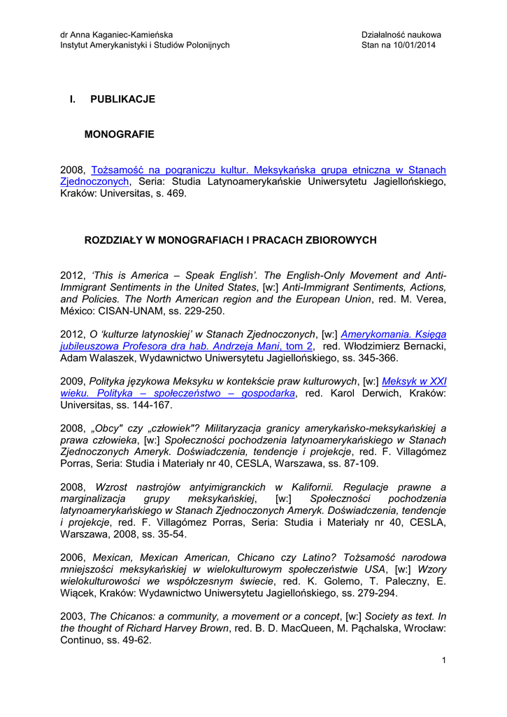 dr Anna Kaganiec-Kamieńska Instytut Amerykanistyki i Studiów Polonijnych I. Działalność naukowa Stan na 10/01/2014 PUBLIKACJE MONOGRAFIE 2008, Tożsamość na pograniczu kultur. Meksykańska grupa etniczna w Stanach Zjednoczonych, Seria: Studia Latynoamerykańskie Uniwersytetu Jagiellońskiego, Kraków: Universitas, s. 469. ROZDZIAŁY W MONOGRAFIACH I PRACACH ZBIOROWYCH 2012, ‘This is America – Speak English’. The English-Only Movement and AntiImmigrant Sentiments in the United States, [w:] Anti-Immigrant Sentiments, Actions, and Policies. The North American region and the European Union, red. M. Verea, México: CISAN-UNAM, ss. 229-250. 2012, O ‘kulturze latynoskiej’ w Stanach Zjednoczonych, [w:] Amerykomania. Księga jubileuszowa Profesora dra hab. Andrzeja Mani, tom 2, red. Włodzimierz Bernacki, Adam Walaszek, Wydawnictwo Uniwersytetu Jagiellońskiego, ss. 345-366. 2009, Polityka językowa Meksyku w kontekście praw kulturowych, [w:] Meksyk w XXI wieku. Polityka – społeczeństwo – gospodarka, red. Karol Derwich, Kraków: Universitas, ss. 144-167. 2008, „Obcy" czy „człowiek"? Militaryzacja granicy amerykańsko-meksykańskiej a prawa człowieka, [w:] Społeczności pochodzenia latynoamerykańskiego w Stanach Zjednoczonych Ameryk. Doświadczenia, tendencje i projekcje, red. F. Villagómez Porras, Seria: Studia i Materiały nr 40, CESLA, Warszawa, ss. 87-109. 2008, Wzrost nastrojów antyimigranckich w Kalifornii. Regulacje prawne a marginalizacja grupy meksykańskiej, [w:] Społeczności pochodzenia latynoamerykańskiego w Stanach Zjednoczonych Ameryk. Doświadczenia, tendencje i projekcje, red. F. Villagómez Porras, Seria: Studia i Materiały nr 40, CESLA, Warszawa, 2008, ss. 35-54. 2006, Mexican, Mexican American, Chicano czy Latino? Tożsamość narodowa mniejszości meksykańskiej w wielokulturowym społeczeństwie USA, [w:] Wzory wielokulturowości we współczesnym świecie, red. K. Golemo, T. Paleczny, E. Wiącek, Kraków: Wydawnictwo Uniwersytetu Jagiellońskiego, ss. 279-294. 2003, The Chicanos: a community, a movement or a concept, [w:] Society as text. In the thought of Richard Harvey Brown, red. B. D. MacQueen, M. Pąchalska, Wrocław: Continuo, ss. 49-62. 1 dr Anna Kaganiec-Kamieńska Instytut Amerykanistyki i Studiów Polonijnych Działalność naukowa Stan na 10/01/2014 2003, Richard Harvey Brown: Portrait of a scholar, [w:] Society as text. In the thought of Richard Harvey Brown, red. B. D. MacQueen, M. Pąchalska, Wrocław: Continuo, ss. 185-202, (współautor: Maria Pąchalska). ARTYKUŁY NAUKOWE 2013, Zarys problematyki języków indiańskich w Ameryce Łacińskiej, „Ameryka Łacińska”, vol. 79, nr 1, ss. 5-22. 2012, Polityka imigracyjna wybranych państw Ameryki Łacińskiej na przełomie XIX i XX w., „Studia Migracyjne-Przegląd Polonijny”, nr 4, ss. 57-82. 2011, Cena „amerykańskiego snu” La ruta de la muerte i problem porwań migrantów w Meksyku, „Ameryka Łacińska”, vol. 71, nr 1, ss. 11-22. 2010, November 2010: Oklahoma Becomes the Next State to Approve Official English Legislation (Critical note), „Norteamerica. Revista Academica del CISANUNAM”, Año 5, no. 2, ss. 185-198. 2010, Amerykańska polityka językowa wobec terenów przyłączanych w wyniku ekspansji terytorialnej, „Politeja”, nr 2, ss. 103-122. 2010, Jeden naród – jeden język? Ruch English-Only w kontekście wcześniejszych prób uregulowania statusu języka angielskiego w Stanach Zjednoczonych, „Sprawy Narodowościowe”, nr 37, ss. 121-135. 2010, Parę uwag o „kulturze latynoskiej” w Stanach Zjednoczonych, „Ameryka Łacińska”, vol. 68, nr 2, ss. 27-37. 2004, Stosunki amerykańsko–meksykańskie za prezydentur George’a W. Busha i Vincente’a Foxa, „Politeja”, nr 1, ss. 140-151. 2003, Miejsce i rola imigracji meksykańskiej do Stanów Zjednoczonych, „Przegląd Polonijny”, nr 2, ss. 11-21. 2003, Imigracja meksykańska do Stanów Zjednoczonych. Analiza historyczna, „Przegląd Polonijny”, nr 1, ss. 29-48. 2 dr Anna Kaganiec-Kamieńska Instytut Amerykanistyki i Studiów Polonijnych Działalność naukowa Stan na 10/01/2014 REDAKCJE 2013, Politeja, vol. 24, nr 2: Venezuelan Studies, s. 354, (współredaktorzy: Hector Maldonado Lira, Caroline Bosc-Bierne de Otezya, Silvana A. Gómez Mercado). 2008, Doświadczenie demokracji w Ameryce Łacińskiej, Kraków: Wydawnictwo Uniwersytetu Jagiellońskiego, s. 278, (współredaktor: Marta Kania). HASŁA ENCYKLOPEDYCZNE I SŁOWNIKOWE 2013, Multicultural America: A Multimedia Encyclopedia, red. Carlos E. Cortes, Thousand Oaks: SAGE Publications, Inc.: Californios, vol. I, ss. 425-427, Carribean Americans, vol. I, ss. 440-446, European Americans, vol. II, ss. 843-849, Salvadoran Americans, vol. IV, ss. 1857-1861, Sanctuary Movement, vol. IV, ss. 1866-1867. 2012, Counterterrorism: From the Cold War to the War on Terror, red. Frank Shanty, Santa Barbara, CA: Praeger: Colombia, vol. I, ss. 76-81, Mexico, vol. I, ss. 130-135, Peru, vol. I, ss. 149-152, Revolutionary Armed Forces of Colombia (aka FARC), vol. II, s. 307, Reyes, Raúl, vol. II, s. 307, Reynoso, Abimael Guzman, vol. II, s. 308, Rios, Ivan, vol. II, s. 308, Sanchez, Ilyich Ramirez, vol. II, s. 308, Sendero Luminoso (aka Shining Path), vol. II, s. 309. 2004, Encyklopedia Współczesna 1978-2004, Kraków: Wydawnictwo Zielona Sowa; hasła z zakresu: Ameryka Łacińska. TŁUMACZENIA 2004, Martin Rejtman, Mój stan fizyczny [w:] „Literatura na świecie”, nr 9-10, ss. 155163, tł. j. hiszpańskiego. 3 dr Anna Kaganiec-Kamieńska Instytut Amerykanistyki i Studiów Polonijnych II. Działalność naukowa Stan na 10/01/2014 WYSTĄPIENIA KONFERENCYJNE 2013, Las políticas inmigratorias estadounidenses y el New Sanctuary Movement. Referat wygłoszony podczas VII Congreso de Consejo Europeo de Investigaciones Sociales sobre América Latina (CEISAL): “Memoria, presente y porvenir en América Latina”, Porto, Portugalia, 12-15 czerwca. 20