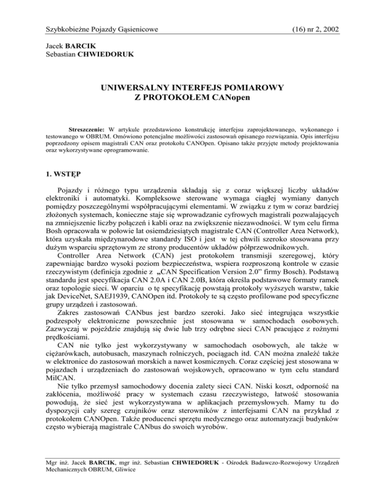 Szybkobieżne Pojazdy Gąsienicowe (16) nr 2, 2002 Jacek BARCIK Sebastian CHWIEDORUK UNIWERSALNY INTERFEJS POMIAROWY Z PROTOKOŁEM CANopen Streszczenie: W artykule przedstawiono konstrukcję interfejsu zaprojektowanego, wykonanego i testowanego w OBRUM. Omówiono potencjalne możliwości zastosowań opisanego rozwiązania. Opis interfejsu poprzedzony opisem magistrali CAN oraz protokołu CANOpen. Opisano także przyjęte metody projektowania oraz wykorzystywane oprogramowanie. 1. WSTĘP Pojazdy i różnego typu urządzenia składają się z coraz większej liczby układów elektroniki i automatyki. Kompleksowe sterowane wymaga ciągłej wymiany danych pomiędzy poszczególnymi współpracującymi elementami. W związku z tym w coraz bardziej złożonych systemach, konieczne staje się wprowadzanie cyfrowych magistrali pozwalających na zmniejszenie liczby połączeń i kabli oraz na zwiększenie niezawodności. W tym celu firma Bosh opracowała w połowie lat osiemdziesiątych magistrale CAN (Controller Area Network), która uzyskała międzynarodowe standardy ISO i jest w tej chwili szeroko stosowana przy dużym wsparciu sprzętowym ze strony producentów układów półprzewodnikowych. Controller Area Network (CAN) jest protokołem transmisji szeregowej, który zapewniając bardzo wysoki poziom bezpieczeństwa, wspiera rozproszoną kontrole w czasie rzeczywistym (definicja zgodnie z „CAN Specification Version 2.0” firmy Bosch). Podstawą standardu jest specyfikacja CAN 2.0A i CAN 2.0B, która określa podstawowe formaty ramek oraz topologie sieci. W oparciu o tę specyfikację powstają protokoły wyższych warstw, takie jak DeviceNet, SAEJ1939, CANOpen itd. Protokoły te są często profilowane pod specyficzne grupy urządzeń i zastosowań. Zakres zastosowań CANbus jest bardzo szeroki. Jako sieć integrująca wszystkie podzespoły elektroniczne powszechnie jest stosowana w samochodach osobowych. Zazwyczaj w pojeździe znajdują się dwie lub trzy odrębne sieci CAN pracujące z rożnymi prędkościami. CAN nie tylko jest wykorzystywany w samochodach osobowych, ale także w ciężarówkach, autobusach, maszynach rolniczych, pociągach itd. CAN można znaleźć także w elektronice do zastosowań morskich a nawet kosmicznych. Coraz częściej jest stosowana w pojazdach i urządzeniach do zastosowań wojskowych, opracowano w tym celu standard MilCAN. Nie tylko przemysł samochodowy docenia zalety sieci CAN. Niski koszt, odporność na zakłócenia, możliwość pracy w systemach czasu rzeczywistego, łatwość stosowania powodują, że sieć jest wykorzystywana w aplikacjach przemysłowych. Mamy tu do dyspozycji cały szereg czujników oraz sterowników z interfejsami CAN na przykład z protokołem CANOpen. Także producenci sprzętu medycznego oraz automatyzacji budynków często wybierają magistrale CANbus do swoich wyrobów. Mgr inż. Jacek BARCIK, mgr inż. Sebastian CHWIEDORUK - Ośrodek Badawczo-Rozwojowy Urządzeń Mechanicznych OBRUM, Gliwice Jacek BARCIK, Sebastian CHWIEDORUK Podstawowe standardy dotyczące sieci CAN: Robert Bosch GmbH: CAN specification 2.0 ISO DIS 16845 : CAN Conformance Test Plan ISO DIS 11898-1: CAN Transfer Layer ISO DIS 11898-2: CAN High Speed Physical Layer ISO CD 11898-3 : CAN Fault Tolerant Physical Layer Specyfikacja firmy Bosch określa między innymi warstwę podstawowych protokołów komunikacji. Dopuszczalne są dwa formaty ramek: standardowa (wersja 2.0A) z 11-bitowym identyfikatorem i rozszerzona (wersja 2.0B) z 29-bitowym identyfikatorem. Wersja rozszerzona pozwala na podłączenie większej ilości urządzeń do jednej sieci. 2. WARSTWA FIZYCZNA Na warstwę fizyczną sieci CAN składa się warstwa łącza danych, czyli sprzętowy sterownik CAN oraz układ nadajnik/odbiornik do dopasowania elektrycznego magistrali. Protokół CAN, zgodny z ISO 11898-1, nie definiował warstwy fizycznej. Obecnie warstwę fizyczna definiują standardy ISO 11898-2 (High Speed Physical Layer) i ISO CD 11898-3 (Fault Tolerant Physical Layer). Rys.1. Schemat podłączenia do sieci Fizycznym połączeniem jest dwuprzewodowa linia danych zakończona po obu końcach rezystorem o impedancji charakterystycznej linii, w celu eliminacji efektów odbić. Z tego samego powodu, topologia okablowania powinna być możliwie zbliżona do struktury pojedynczej linii. Doprowadzenia z urządzenia do magistrali powinny być możliwie krótkie, zwłaszcza dla większych prędkości transmisji. Dla 1Mb/s długość doprowadzeń nie powinna przekraczać 0,3 m. Uniwersalny interfejs pomiarowy z protokołem CANOpen Zgodnie z ISO 11898-2 przewody wykorzystywane w magistrali CAN powinny mieć nominalną impedancję 120 (118 do 130), nominalne opóźnienie 5ns/m oraz rezystywność linii 70m/m. Takie parametry zapewniają poprawną transmisję z prędkością do 1 Mb/s. Przewody połączeniowe mogą być prowadzone równolegle, skręcane (najczęściej stosowane), zarówno ekranowane, jak i nie ekranowane - zależnie od wymagań dotyczących kompatybilności elektromagnetycznej. W razie potrzeby stosuje się izolację galwaniczną, w celu zmniejszenia prądów płynących przez linie masy. Rys.2. Ilustracja poziomów napięć na magistrali Teoretyczna długość magistrali to 40m przy prędkości 1Mb/s. Dla niższych prędkości długość ta wyraźnie wzrasta. Dla prędkości 50kb/s maksymalna długość linii to 1 km. Dopuszczalne jest stosowanie urządzeń typu bridge czy też repeater, w celu zwiększenia ilości podłączonych urządzeń lub zwiększenia długości magistrali. Układ odbiornika powinien rozpoznać stan recesywny magistrali, gdy różnica napięcia pomiędzy CAN_H i CAN_L jest nie większa od 0,5 V. Gdy napięcie linii CAN_H jest co najmniej o 0,9V wyższe od niż CAN_L, wtedy powinien być rozpoznany dominujący stan magistrali. Nominalne napięcie dla stanu dominującego wynosi 3,5 V dla linii CAN_H oraz 1,5V dla linii CAN_L. Różnicowy charakter transmisji sygn