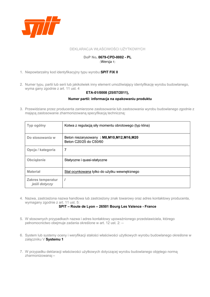DEKLARACJA WŁAŚCIWOŚCI UŻYTKOWYCH DoP No. 0679-CPD-0002 - PL (Wersja 1) 1. Niepowtarzalny kod identyfikacyjny typu wyrobu:SPIT FIX II 2. Numer typu, partii lub serii lub jakikolwiek inny element umożliwiający identyfikację wyrobu budowlanego, wyma gany zgodnie z art. 11 ust. 4 ETA-01/0008 (25/07/2011), Numer partii: informacja na opakowaniu produktu 3. Przewidziane przez producenta zamierzone zastosowanie lub zastosowania wyrobu budowlanego zgodnie z mającą zastosowanie zharmonizowaną specyfikacją techniczną: Typ ogólny Kotwa z regulacją siły momentu obrotowego (typ klina) Do stosowania w Beton niezarysowany : M8,M10,M12,M16,M20 Beton C20/25 do C50/60 Opcja / kategoria 7 Obciążenie Statyczne i quasi-statyczne Materiał Stal ocynkowana tylko do użytku wewnętrznego Zakres temperatur jeśli dotyczy / 4. Nazwa, zastrzeżona nazwa handlowa lub zastrzeżony znak towarowy oraz adres kontaktowy producenta, wymagany zgodnie z art. 11 ust. 5: SPIT – Route de Lyon – 26501 Bourg Les Valence - France 5. W stosownych przypadkach nazwa i adres kontaktowy upoważnionego przedstawiciela, którego pełnomocnictwo obejmuje zadania określone w art. 12 ust. 2: -6. System lub systemy oceny i weryfikacji stałości właściwości użytkowych wyrobu budowlanego określone w załączniku V Systemu 1 7. W przypadku deklaracji właściwości użytkowych dotyczącej wyrobu budowlanego objętego normą zharmonizowaną:-- 8. W przypadku deklaracji właściwości użytkowych dotyczącej wyrobu budowlanego, dla którego wydana została europejska ocena techniczna: CSTB - Centre Scientifique et Technique du Bâtiment (France) wydał(-a/-o) ETA-01/0008 (25/07/2011) na podstawie ETAG-001-2, Organ notyfikujący 0679-CPR, wykonano w ramach Systemu 1 i. ustalenia typu wyrobu na podstawie badań typu (w tym pobierania próbek), obliczeń typu, tabelarycznych wartości lub opisowej dokumentacji wyrobu; ii. iii. wstępnej inspekcji zakładu produkcyjnego i zakładowej kontroli produkcji; stałego nadzoru, oceny i ewaluacji zakładowej kontroli produkcji w ramach Systemu 1. 9. Deklarowane właściwości użytkowe Charakterystyka podstawowa Metoda projektowania Wydajność Wytrzymałość charakterystyczna na naprężenia Załącznik C ETA-01/0008 Załącznik 4 Wytrzymałość charakterystyczna na ścinanie Załącznik C ETA-01/0008 Załącznik 5 minimalny rozstaw i minimalna odległość od krawędzi Załącznik C ETA-01/0008 Załącznik 3 przesunięcie do granicznego stanu używalności Załącznik C ETA-01/0008 Załącznik 4 & 5 Zharmonizowa na specyfikacja techniczna ETAG 001-1,2 W przypadku gdy na podstawie art. 37 lub 38 zastosowana została specjalna dokumentacja techniczna, wymagania, z którymi wyrób jest zgodny: -10. Właściwości użytkowe wyrobu określone w pkt 1 i 2 są zgodne z właściwościami użytkowymi deklarowanymi w pkt 9. Niniejsza deklaracja właściwości użytkowych wydana zostaje na wyłączną odpowiedzialność producenta określonego w pkt 4. W imieniu producenta podpisał(-a): Bourg-Lés-Valence (France), 01/07/2013 G. JAILLET Business Development & Innovation Director C. QUERRY BU Manager Anchors Manufacturing