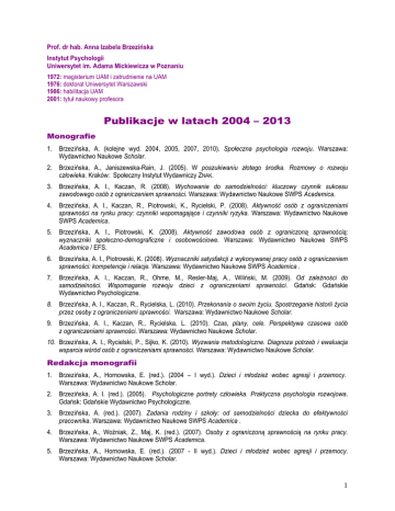 Prof. dr hab. Anna Izabela Brzezińska Instytut Psychologii Uniwersytet im. Adama Mickiewicza w Poznaniu 1972: magisterium UAM i zatrudnienie na UAM 1976: doktorat Uniwersytet Warszawski 1986: habilitacja UAM 2001: tytuł naukowy profesora Publikacje w latach 2004 – 2013 Monografie 1. Brzezińska, A. (kolejne wyd. 2004, 2005, 2007, 2010). Społeczna psychologia rozwoju. Warszawa: Wydawnictwo Naukowe Scholar. 2. Brzezińska, A., Janiszewska-Rain, J. (2005). W poszukiwaniu złotego środka. Rozmowy o rozwoju człowieka. Kraków: Społeczny Instytut Wydawniczy ZNAK. 3. Brzezińska, A. I., Kaczan, R. (2008). Wychowanie do samodzielności: kluczowy czynnik sukcesu zawodowego osób z ograniczeniem sprawności. Warszawa: Wydawnictwo Naukowe SWPS Academica. 4. Brzezińska, A. I., Kaczan, R., Piotrowski, K., Rycielski, P. (2008). Aktywność osób z ograniczeniami sprawności na rynku pracy: czynniki wspomagające i czynniki ryzyka. Warszawa: Wydawnictwo Naukowe SWPS Academica. 5. Brzezińska, A. I., Piotrowski, K. (2008). Aktywność zawodowa osób z ograniczoną sprawnością: wyznaczniki społeczno-demograficzne i osobowościowe. Warszawa: Wydawnictwo Naukowe SWPS Academica / EFS. 6. Brzezińska, A. I., Piotrowski, K. (2008). Wyznaczniki satysfakcji z wykonywanej pracy osób z ograniczeniem sprawności: kompetencje i relacje. Warszawa: Wydawnictwo Naukowe SWPS Academica . 7. Brzezińska, A. I., Kaczan, R., Ohme, M., Resler-Maj, A., Wiliński, M. (2009). Od zależności do samodzielności. Wspomaganie rozwoju dzieci z ograniczeniami sprawności. Gdańsk: Gdańskie Wydawnictwo Psychologiczne. 8. Brzezińska, A. I., Kaczan, R., Rycielska, L. (2010). Przekonania o swoim życiu. Spostrzeganie historii życia przez osoby z ograniczeniami sprawności. Warszawa: Wydawnictwo Naukowe Scholar. 9. Brzezińska, A. I., Kaczan, R., Rycielska, L. (2010). Czas, plany, cele. Perspektywa czasowa osób z ograniczeniami sprawności. Warszawa: Wydawnictwo Naukowe Scholar. 10. Brzezińska, A. I., Rycielski, P., Sijko, K. (2010). Wyzwania metodologiczne. Diagnoza potrzeb i ewaluacja wsparcia wśród osób z ograniczeniami sprawności. Warszawa: Wydawnictwo Naukowe Scholar. Redakcja monografii 1. Brzezińska, A., Hornowska, E. (red.). (2004 – I wyd.). Dzieci i młodzież wobec agresji i przemocy. Warszawa: Wydawnictwo Naukowe Scholar. 2. Brzezińska, A. I. (red.). (2005). Psychologiczne portrety człowieka. Praktyczna psychologia rozwojowa. Gdańsk: Gdańskie Wydawnictwo Psychologiczne. 3. Brzezińska, A. (red.). (2007). Zadania rodziny i szkoły: od samodzielności dziecka do efektywności pracownika. Warszawa: Wydawnictwo Naukowe SWPS Academica . 4. Brzezińska, A., Woźniak, Z., Maj, K. (red.). (2007). Osoby z ograniczoną sprawnością na rynku pracy. Warszawa: Wydawnictwo Naukowe SWPS Academica. 5. Brzezińska, A., Hornowska, E. (red.). (2007 - II wyd.). Dzieci i młodzież wobec agresji i przemocy. Warszawa: Wydawnictwo Naukowe Scholar. 1 6. Brzezińska, A., Toeplitz, Z. (red.). (2007). Problemy etyczne w badaniach i interwencji psychologicznej wobec dzieci i młodzieży. Wydawnictwo Naukowe SWPS Academica. 7. Brzezińska, A., Ober-Łopatka, K., Stec, R., Ziółkowska, K. (red.). (2007). Szanse rozwoju w okresie późnej dorosłości. Poznań: Wydawnictwo Fundacji Humaniora. 8. Brzezińska, A., Ober-Łopatka, K., Stec, R., Ziółkowska, K. (red.). (2007). Zagrożenia rozwoju w okresie późnej dorosłości. Poznań: Wydawnictwo Fundacji Humaniora. 9. Brzezińska, A. I., Kaczan, R., Smoczyńska, K. (red.). (2010). Diagnoza potrzeb i modele pomocy dla osób z ograniczeniami sprawności. Warszawa: Wydawnictwo Naukowe Scholar. 10. Brzezińska, A. I., Kaczan, R., Smoczyńska, K. (red.). (2010). Sytuacja i możliwości pomocy dla osób z rzadkimi i sprzężonymi ograniczeniami sprawności. Warszawa: Wydawnictwo Naukowe Scholar. 11. Brzezińska, A. I., Pluta, J., Rycielski, P. (red.). (2010). Potrzeby specyficznych grup osób z ograniczeniami sprawności: wyniki badań. Warszawa: Wydawnictwo Naukowe Scholar. 12. Brzezińska, A. I., Pluta, J., Rycielski, P. (red.). (2010). Wsparcie dla osób z ograniczeniami sprawności i ich otoczenia: wyniki badań. Warszawa: Wydawnictwo Naukowe Scholar. Redakcja naukowa przekładów 1. Brzezińska, A. (2004). Redakcja naukowa książki: Bee, H. L. (1998, 2nd edition)). Lifespan development. New York, NY: Prentice Hall, Inc. Wydanie polskie: Psychologia rozwoju człowieka. Poznań, 2004, II wyd. popr. 2007, Wydawnictwo Zysk i S-ka (przekład: Aleksander Wojciechowski). 2. Brzezińska, A. (2005). Redakcja naukowa: W: H. R. Schaffer, Warszawa: Wydawnictwo Naukowe PWN (przekład: Aleksander Wojciechowski). Psychologia dziecka. 3. Brzezińska, A. (2005). Redakcja naukowa: J. S. Bruner, Kultura edukacji . Universitas (przekład: Tamara Brzostowska-Tereszkiewicz). Kraków: Wydawnictwo 4. Appelt, K., Brzezińska, A. I., Jabłoński, S., Wojciechowska, J., Ziółkowska, B. (2009). Redakcja naukowa: D. Boyd, H. Bee (2006). Lifespan developoment (IVth edition). Boston: Pearson Education Inc. Wydanie polskie: Rozwój w ciągu życia. Poznań: Wydawnictwo Zysk i S-ka (przekład: Joanna Gilewicz, Aleksander Wojciechowski). Redakcja naukowa numerów monograficznych czasopism 1. Brzezińska, A. I., Kaczan, R., Rycielski, P. (red.). (2010). Polityka Spoleczna - redakcja numeru specjalnego pt.: Diagnoza potrzeb i podstawy interwencji społecznych na rzecz osób z ograniczeniami sprawności. 2. Federowicz, M., Sitek, M., Brzezińska, A. I. (2012). Polityka Spoleczna - redakcja numeru tematycznego 1/2012 pt.: Polityka edukacyjna: wyzwania i szanse. Artykuły naukowe - ENG 1. Brzezińska, A. I., Hanć, T. (2009). Intensity of ADHD symptoms and subjective feeling of competence in school age children, School Psychology International, 30 (5), 491-506. 2. Piotrowski, K., Brzezińska, A. I. (2011). Identity, self-sufficiency and disability in the context of educational and vocational activity. Polish Psyc