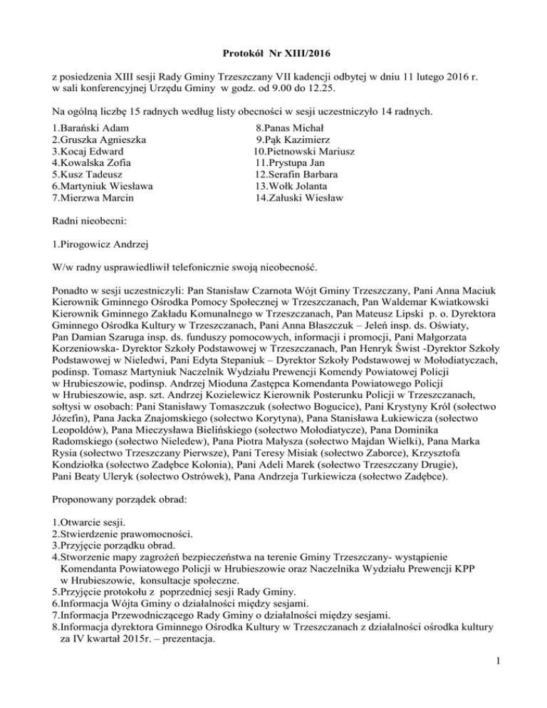 Protokół Nr XIII/2016 z posiedzenia XIII sesji Rady Gminy Trzeszczany VII kadencji odbytej w dniu 11 lutego 2016 r. w sali konferencyjnej Urzędu Gminy w godz. od 9.00 do 12.25. Na ogólną liczbę 15 radnych według listy obecności w sesji uczestniczyło 14 radnych. 1.Barański Adam 2.Gruszka Agnieszka 3.Kocaj Edward 4.Kowalska Zofia 5.Kusz Tadeusz 6.Martyniuk Wiesława 7.Mierzwa Marcin 8.Panas Michał 9.Pąk Kazimierz 10.Pietnowski Mariusz 11.Prystupa Jan 12.Serafin Barbara 13.Wołk Jolanta 14.Załuski Wiesław Radni nieobecni: 1.Pirogowicz Andrzej W/w radny usprawiedliwił telefonicznie swoją nieobecność. Ponadto w sesji uczestniczyli: Pan Stanisław Czarnota Wójt Gminy Trzeszczany, Pani Anna Maciuk Kierownik Gminnego Ośrodka Pomocy Społecznej w Trzeszczanach, Pan Waldemar Kwiatkowski Kierownik Gminnego Zakładu Komunalnego w Trzeszczanach, Pan Mateusz Lipski p. o. Dyrektora Gminnego Ośrodka Kultury w Trzeszczanach, Pani Anna Błaszczuk – Jeleń insp. ds. Oświaty, Pan Damian Szaruga insp. ds. funduszy pomocowych, informacji i promocji, Pani Małgorzata Korzeniowska- Dyrektor Szkoły Podstawowej w Trzeszczanach, Pan Henryk Świst -Dyrektor Szkoły Podstawowej w Nieledwi, Pani Edyta Stepaniuk – Dyrektor Szkoły Podstawowej w Mołodiatyczach, podinsp. Tomasz Martyniuk Naczelnik Wydziału Prewencji Komendy Powiatowej Policji w Hrubieszowie, podinsp. Andrzej Mioduna Zastępca Komendanta Powiatowego Policji w Hrubieszowie, asp. szt. Andrzej Kozielewicz Kierownik Posterunku Policji w Trzeszczanach, sołtysi w osobach: Pani Stanisławy Tomaszczuk (sołectwo Bogucice), Pani Krystyny Król (sołectwo Józefin), Pana Jacka Znajomskiego (sołectwo Korytyna), Pana Stanisława Łukiewicza (sołectwo Leopoldów), Pana Mieczysława Bielińskiego (sołectwo Mołodiatycze), Pana Dominika Radomskiego (sołectwo Nieledew), Pana Piotra Małysza (sołectwo Majdan Wielki), Pana Marka Rysia (sołectwo Trzeszczany Pierwsze), Pani Teresy Misiak (sołectwo Zaborce), Krzysztofa Kondziołka (sołectwo Zadębce Kolonia), Pani Adeli Marek (sołectwo Trzeszczany Drugie), Pani Beaty Uleryk (sołectwo Ostrówek), Pana Andrzeja Turkiewicza (sołectwo Zadębce). Proponowany porządek obrad: 1.Otwarcie sesji. 2.Stwierdzenie prawomocności. 3.Przyjęcie porządku obrad. 4.Stworzenie mapy zagrożeń bezpieczeństwa na terenie Gminy Trzeszczany- wystąpienie Komendanta Powiatowego Policji w Hrubieszowie oraz Naczelnika Wydziału Prewencji KPP w Hrubieszowie, konsultacje społeczne. 5.Przyjęcie protokołu z poprzedniej sesji Rady Gminy. 6.Informacja Wójta Gminy o działalności między sesjami. 7.Informacja Przewodniczącego Rady Gminy o działalności między sesjami. 8.Informacja dyrektora Gminnego Ośrodka Kultury w Trzeszczanach z działalności ośrodka kultury za IV kwartał 2015r. – prezentacja. 1 9.Podjęcie uchwał: - w sprawie określenia kryteriów rekrutacji do oddziałów przedszkolnych w szkołach podstawowych prowadzonych przez Gminę Trzeszczany na drugim etapie postępowania rekrutacyjnego, ustalenia liczby punktów za każde z tych kryteriów oraz dokumentów niezbędnych do ich potwierdzenia - w sprawie określenia kryteriów rekrutacji oraz rodzajów dokumentów niezbędnych do ich potwierdzenia w postępowaniu rekrutacyjnym dla kandydatów zamieszkałych poza obwodem do klas pierwszych szkoły podstawowej i gimnazjum, dla których organem prowadzącym jest Gmina Trzeszczany - w sprawie zabezpieczenia zwiększonego wkładu własnego związanego z realizacją Projektu „Od wizji do nowoczesnego zarządzania podregionem Gotania” w ramach Szwajcarsko-Polskiego Programu Współpracy - w sprawie przystąpienia Gminy Trzeszczany do stowarzyszenia Lokalnej Organizacji Turystycznej „Gotania” - w sprawie udzielenia pomocy finansowej Powiatowi Hrubieszowskiemu z przeznaczeniem na remont i budowę chodników oraz przebudowę drogi. 10.Zapytania, interpelacje i wnioski radnych i sołtysów. 11.Sprawy różne. 12.Odpowiedzi na zapytania, interpelacje i wnioski radnych i sołtysów. 13.Zakończenie obrad. Do punktu 1-go Otwarcia XIII sesji VII kadencji dokonała Wiceprzewodnicząca Rady Gminy Pani Wiesława Martyniuk, witając wszystkie osoby obecne na sesji. Do punktu 2-go Wiceprzewodnicząca Rady Gminy stwierdziła prawomocność. Na 15 radnych w chwili stwierdzania prawomocności obecnych było 13 radnych, co stanowi quorum do podejmowania pełnoprawnych uchwał i decyzji. Do punktu 3-go Wiceprzewodnicząca Rady Gminy przedstawiła proponowany porządek obrad. Uwag do porządku obrad nie wniesiono. Za przyjęciem proponowanego porządku obrad głosowało - 13 radnych, przeciw -0, wstrzymało się 0, Porządek obrad został przyjęty jednogłośnie. Do punktu 4-go Kolejny punkt to stworzenie mapy zagrożeń bezpieczeństwa na terenie Gminy Trzeszczanywystąpienie Komendanta Powiatowego Policji w Hrubieszowie oraz Naczelnika Wydziału Prewencji KPP w Hrubieszowie, konsultacje społeczne. Głos zabrał podinsp. Andrzej Mioduna, który na wstępnie swojej wypowiedzi podziękował za ujęcie w planie sesji Rady Gminy tematu dotyczącego mapy zagrożeń bezpieczeństwa. Oznajmił, że celem dzisiejszego spotkania jest przedstawienie poziomu bezpieczeństwa na terenie Gminy Trzeszczany w roku 2015. Dla przejrzystości mapa zagrożeń została stworzona w formie graficznej. Zgodnie z założeniami mieszkańcy będą mieli nieograniczony dostęp do mapy zagrożeń poprzez umieszczenie jej na stronie internetowej. Mapa będzie aktualizowana w systemie kwartalnym. Dodał, że po zapoznaniu się z tą prezentacją liczy na opinie, propozycje, sugestie mieszkańców w sprawie mapy zagrożeń bezpieczeństwa. Następnie podinsp. Tomasz Martyniuk przedstawił graficzną prezentację mapy zagrożeń bezpieczeństwa. Poinformował, że mapy zagrożeń bezpieczeństwa tworzone są na terenie całego kraju począwszy od 2 poziomu krajowego, wojewódzkiego i powiatowego. Przestępczość ogółem na terenie Gm