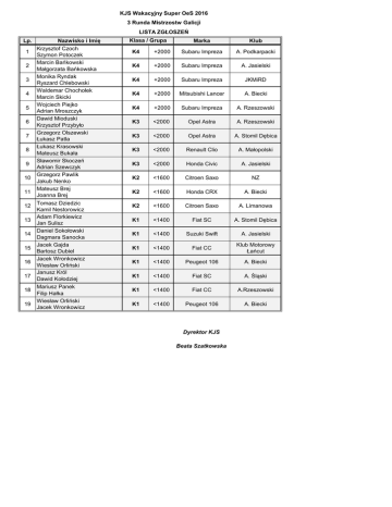 KJS Wakacyjny Super OeS 2016 3 Runda Mistrzostw Galicji LISTA ZGŁOSZEŃ Lp. 1 2 3 4 5 6 7 8 9 10 11 12 13 14 15 16 17 18 19 Nazwisko i Imię Krzysztof Czoch Szymon Potoczek Marcin Bańkowski Małgorzata Bańkowska Monika Ryndak Ryszard Chlebowski Waldemar Chochołek Marcin Skicki Wojciech Piejko Adrian Mroszczyk Dawid Mioduski Krzysztof Przybyło Grzegorz Olszewski Łukasz Patla Łukasz Krasowski Mateusz Bukała Sławomir Skoczeń Adrian Szewczyk Grzegorz Pawlik Jakub Nenko Mateusz Brej Joanna Brej Tomasz Dziedzic Kamil Nestorowicz Adam Florkiewicz Jan Sulisz Daniel Sokołowski Dagmara Sanocka Jacek Gajda Bartosz Dubiel Jacek Wronkowicz Wiesław Orliński Janusz Król Dawid Kołodziej Mariusz Panek Filip Hałka Wiesław Orliński Jacek Wronkowicz Klasa / Grupa Marka Klub K4 +2000 Subaru Impreza A. Podkarpacki K4 +2000 Subaru Impreza A. Jasielski K4 +2000 Subaru Impreza JKMiRD K4 +2000 Mitsubishi Lancer A. Biecki K4 +2000 Subaru Impreza A. Rzeszowski K3 <2000 Opel Astra A. Rzeszowski K3 <2000 Opel Astra A. Stomil Dębica K3 <2000 Renault Clio A. Małopolski K3 <2000 Honda Civic A. Jasielski K2 <1600 Citroen Saxo NZ K2 <1600 Honda CRX A. Biecki K2 <1600 Citroen Saxo A. Limanowa K1 <1400 Fiat SC A. Stomil Dębica K1 <1400 Suzuki Swift A. Jasielski K1 <1400 Fiat CC Klub Motorowy Łańcut K1 <1400 Peugeot 106 A. Biecki K1 <1400 Fiat SC A. Śląski K1 <1400 Fiat CC A.Rzeszowski K1 <1400 Peugeot 106 A. Biecki Dyrektor KJS Beata Szatkowska