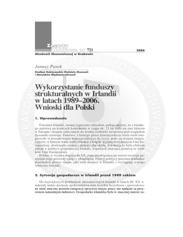 Zesz yty Naukowe nr 721 2006 Akademii Ekonomicznej w Krakowie Janusz Pasek Studium Doktoranckie Wydzia∏u Ekonomii i Stosunków Mi´dzynarodowych Wykorzystanie funduszy strukturalnych w Irlandii w latach 1989–2006. Wnioski dla Polski 1. Wprowadzenie Fenomen Irlandii, zwanej tygrysem celtyckim, polega na tym, ˝e z biednego paƒstwa na kraƒcach kontynentu w ciàgu ok. 15 lat sta∏a si´ ona liderem w Europie i krajem zaliczanym do Êcis∏ej czo∏ówki Êwiatowej pod wzgl´dem dynamiki rozwoju. Paƒstwo, z którego przez dziesi´ciolecia wiele osób emigrowa∏o w poszukiwaniu lepszego miejsca do ˝ycia, sta∏o si´ krajem imigracyjnym, w którym wiele osób, równie˝ z krajów wysoko rozwini´tych Unii Europejskiej, dostrzeg∏o szans´ i miejsce dla siebie. Ewolucja ta by∏a efektem zmian w polityce gospodarczej Irlandii, wspartych znaczàcà pomocà ze Êrodków Unii Europejskiej. Polska, w wyniku wejÊcia do UE, staje przed szansà na wzrost rozwoju gospodarczego porównywalny z irlandzkim. Polscy politycy powinni dok∏adnie przeÊledziç proces zmian, jaki mia∏ miejsce w Irlandii, i wyciàgnàç z niego w∏aÊciwe wnioski. 2. Sytuacja gospodarcza w Irlandii przed 1989 rokiem Do najwi´kszych problemów ekonomicznych Irlandii w latach 80. XX w. nale˝a∏y niskie dochody spo∏eczeƒstwa oraz wysokie bezrobocie i spowodowany nimi znaczny poziom emigracji (przyrost miejsc pracy nie nadà˝a∏ za przyrostem naturalnym ludnoÊci). Gospodarka irlandzka by∏a w znacznej mierze za- 152 Janusz Pasek le˝na od rolnictwa1. Jej rozwój blokowa∏a zacofana struktura przemys∏u (przy jednoczesnym niskim poziomie inwestycji), niedobór kapita∏u krajowego oraz wysokie koszty transportu spowodowane peryferyjnym po∏o˝eniem kraju i s∏abo rozwini´tà infrastrukturà transportowà. Niezrównowa˝enie bud˝etu oraz wysokie zad∏u˝enie sektora publicznego ogranicza∏y mo˝liwoÊci interwencji rzàdu. Irlandia przystàpi∏a do Wspólnot Europejskich w 1973 r.2 Pomoc otrzymana z WE do 1989 r. nie wp∏yn´∏a na zmian´ sytuacji gospodarczej kraju. W ciàgu 15 lat z pariasa Europy Irlandia przekszta∏ci∏a si´ w kraj o wiodàcej gospodarce, nie tylko w skali europejskiej, ale i Êwiatowej. U podstaw tego sukcesu leg∏o porozumienie, jakie w 1986 r. rzàd irlandzki podpisa∏ ze zwiàzkami zawodowymi. Zak∏ada∏o ono szereg bolesnych dla spo∏eczeƒstwa posuni´ç, których celem by∏o uzdrowienie gospodarki. W myÊl porozumienia p∏ace realne mia∏y zmaleç, poniewa˝ konieczne by∏o zduszenie inflacji. Ponadto podwy˝szono podatki od osób fizycznych wprowadzajàc jednoczeÊnie bardzo niski (12,5%) podatek od przedsi´biorstw, aby przyciàgnàç inwestorów zagranicznych. Przez system ulg podatkowych i grantów zach´cano do inwestowania g∏ównie firmy z sektora ICT3. Dodatkowo rzàd przeprowadzi∏ reform´ wydatków publicznych, która mia∏a obni˝yç poziom d∏ugu publicznego, przekraczajàcego wówczas 120% PKB4. Za drugi czynnik sukcesu uznaç mo˝na fundusze Unii Europejskiej. Nie spowodowa∏y one bezpoÊrednio rozwoju gospodarki, ale ich umiej´tne wykorzystanie przyspieszy∏o wzrost gospodarczy i by∏o jego katalizatorem. Dzi´ki funduszom strukturalnym Irlandczycy mogli stworzyç w∏aÊciwe warunki dla podtrzymania wzrostu gospodarczego. Bez wspieranych przez UE nak∏adów na infrastruktur´ i edukacj´ w krótkim czasie pojawi∏yby si´ bariery, które by∏yby znacznym ograniczeniem dla dalszego rozwoju. Do efektywnego wykorzystania funduszy doprowadzi∏o wiele czynników, wÊród których wymieniç nale˝y sprawnà administracj´ i w∏aÊciwy dobór priorytetów. Istotnym czynnikiem sukcesu by∏a równie˝ skala inwestycji. Wieloletnie, wysokie nak∏ady na niewielkim terytorium przynios∏y wi´kszy efekt, ni˝ mia∏oby to miejsce w du˝ym kraju5. 1 Ireland. Community Support Framework 1994–99. Objective 1: Development and Structural Adjustment of Regions whose Development is Lagging behind, Office for Official Publications of the European Communities, Luxembourg 1994, s. 24 i nast. 2 J. Ruszkowski, E. Górnicz, M. ˚urek, Leksykon integracji europejskiej, Wydawnictwo Naukowe PWN, Warszawa 2002, s. 268. 3 Information and Communication Technology. 4 T. O’Sullivan, The Irish Economy. A Partnership Perspective, Irish Business and Employers Confederation, Dublin 2001 s. 6. 5 T.G. Grosse, Polityka regionalna Unii Europejskiej i jej wp∏yw na rozwój gospodarczy. Przyk∏ad Grecji, W∏och, Irlandii i wnioski dla Polski, Instytut Spraw Publicznych, Warszawa 2000, s. 97–98. Wykorzystanie funduszy strukturalnych w Irlandii... 153 3. Europejska polityka spójnoÊci w Irlandii w latach 1989–2006 3.1. Uwagi ogólne Od 1989 r. europejska polityka regionalna oparta zosta∏a na zasadzie programowania wieloletniego. Oznacza to, ˝e Unia Europejska dofinansowuje jedynie kompleksowe programy rozwoju regionalnego, a nie pojedyncze projekty inwestycyjne. Pierwszym etapem tworzenia takich programów jest opracowanie „Narodowego planu rozwoju” (NPR). Plan ten jest podstawà negocjowania przez kraje cz∏onkowskie z Komisjà Europejskà podstaw wsparcia wspólnoty (Community Suport Framework – CSF), dokumentu okreÊlajàcego kierunki i wysokoÊç wsparcia ze strony funduszy strukturalnych na realizacj´ zamierzeƒ rozwojowych. Postanowienia zawarte w CSF sà nast´pnie wdra˝ane za pomocà sektorowych planów operacyjnych (SPO), które opisujà dzia∏ania planowane w ramach ustalonych priorytetów polityki strukturalnej. Dotychczas dla Irlandii stworzono trzy kompleksowe programy rozwoju – na lata 1989–1993, 1994–1999 oraz 2000–2006. Przez wszystkie wymienione okresy planistyczne mo˝na by∏o zaobserwowaç cztery g∏ówne priorytety irlandzkiej polityki strukturalnej: sektor produkcyjny, infrastruktura gospodarcza, zasoby ludzkie i rozwój lokalny. Opisujàce je sektorowe programy operacyjne w kolejnych okresach ulega∏y pewnym drob