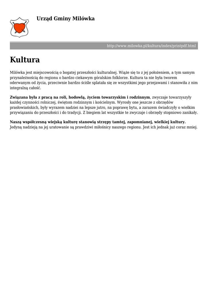 Urząd Gminy Milówka http://www.milowka.pl/kultura/index/printpdf.html Kultura Milówka jest miejscowością o bogatej przeszłości kulturalnej. Wiąże się to z jej położeniem, a tym samym przynależnością do regionu o bardzo ciekawym góralskim folklorze. Kultura ta nie była tworem oderwanym od życia, przeciwnie bardzo ściśle splatała się ze wszystkimi jego przejawami i stanowiła z nim integralną całość. Związana była z pracą na roli, hodowlą, życiem towarzyskim i rodzinnym, zwyczaje towarzyszyły każdej czynności rolniczej, świętom rodzinnym i kościelnym. Wyrosły one jeszcze z obrzędów prasłowiańskich, były wyrazem nadziei na lepsze jutro, na poprawę bytu, a zarazem świadczyły o wielkim przywiązaniu do przeszłości i do tradycji. Z biegiem lat wszystkie te zwyczaje i obrzędy stopniowo zanikały. Naszą współczesną wiejską kulturę stanowią strzępy tamtej, zapomnianej, wielkiej kultury. Jedyną nadzieją na jej uratowanie są prawdziwi miłośnicy naszego regionu. Jest ich jednak już coraz mniej.