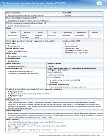 Funkcjonowanie ekosystemów morskich - fakultet #7.2.0280 Sylabusy - Ośrodek Informatyczny UG Nazwa przedmiotu Kod ECTS Funkcjonowanie ekosystemów morskich - fakultet Nazwa jednostki prowadzącej przedmiot 7.2.0280 Zakład Ekologii Eksperymentalnej Organizmów Morskich Nazwisko osoby prowadzącej (osób prowadzących) prof. dr hab. Anna Szaniawska Studia wydział Wydział Chemii kierunek Ochrona Środowiska stopień pierwszego stopnia tryb stacjonarne specjalność Podstawowa Formy zajęć, sposób ich realizacji i przypisana im liczba godzin Formy zajęć specjalizacja Podstawowa semestr 4 Liczba punktów ECTS Ćw. audytoryjne Sposób realizacji zajęć zajęcia w sali dydaktycznej Liczba godzin 2 zajęcia - 30 godz. konsultacje - 2 godz. praca własna studenta - 18 godz. RAZEM: 50 godz. - 2 pkt. ECTS Ćw. audytoryjne: 30 godz. Cykl dydaktyczny 2015/2016 letni Status przedmiotu fakultatywny (do wyboru) Metody dydaktyczne - ćwiczenia audytoryjne - dyskusja - ćwiczenia audytoryjne - praca w grupach Język wykładowy polski Forma i sposób zaliczenia oraz podstawowe kryteria oceny lub wymagania egzaminacyjne Sposób zaliczenia Zaliczenie na ocenę Formy zaliczenia - przygotowanie prezentacji multimedialnej, - kolokwium Podstawowe kryteria oceny Ocena z prezentacji i sprawdzian z bieżących wiadomości. Określenie przedmiotów wprowadzających wraz z wymogami wstępnymi A. Wymagania formalne Przygotowanie do sprawdzianu i prezentacji. Studiowanie literatury. B. Wymagania wstępne brak Cele kształcenia Celem zajęć jest zapoznanie studentów z podstawowymi procesami zachodzącymi w środowisku wodnym, określenie wpływu czynników abiotycznych (tj. temperatura, zasolenie, niedobory tlenowe, obecność siarkowodoru, metali ciężkich) na funkcjonowanie organizmów w różnych warunkach środowiskowych. Zajęcia obejmują zagadnienia dotyczące podstawowych pojęć związanych z funkcjonowaniem organizmów, populacji, gatunków, w ekosystemach wodnych. Treści programowe Zajęcia poruszają tematykę funkcjonowania ekosystemów morskich na przykładzie różnych zbiorników wodnych. Zajęcia mają zapoznać z zasadami funkcjonowania ekosystemów morskich, oceną różnorodności życia w morzu i zasadami jego ochrony. Studenci aktywnie biorą udział w ćwiczeniach poprzez przygotowywanie prezentacji i korzystanie z literatury tematu. Wykaz literatury Wolnomiejski N., Pawlikowski T.. Zarys ekologii i ochrony mórz. Część I. Wydawnictwo Uniwersytetu Mikołoja Kopernika. Toruń 2006 Duxbury A.C., Duxbury A.B., Sverdrup K.A.. Oceany świata. Wydawnictwo Naukowe PWN. Warszawa 2002 Byatt A., Fothergill A., Holmes M.. Błękitna planeta. Historia naturalna oceanów. Funkcjonowanie ekosystemów morskich - fakultet #7.2.0280 | a557ab4445d54033d8e2995e71be15ee | Strona 1 z 2 Funkcjonowanie ekosystemów morskich - fakultet #7.2.0280 Sylabusy - Ośrodek Informatyczny UG MUZA SA. Warszawa 2002 Pliński M. Hydrobiologia ogólna.Uniwersytet Gdański, 1992 Efekty uczenia się Wiedza K_W03charakteryzuje związki i zależności pomiędzy Charakteryzuje związki i zależności pomiędzy różnymi dyscyplinami nauk różnymi dyscyplinami nauk przyrodniczych i ścisłych, przyrodniczych i ścisłych, wykorzystuje wiedzę z zakresu matematyki, fizyki, chemii i wykorzystuje wiedzę z zakresu matematyki, fizyki, chemii i biologii w opisie podstawowych pojęć, koncepcji oraz zasad w ochronie środowiska. biologii w opisie podstawowych pojęć, koncepcji oraz zasad Zapoznaje się z rodzajem i zakresem wpływu czynników abiotycznych na organizmy w ochronie środowiska; wodne. K_W06wyjaśnia przebieg naturalnych oraz wywołanych antropopresją fizycznych, chemicznych oraz biologicznych Wyjaśnia przebieg naturalnych oraz wywołanych antropopresją fizycznych, procesów i zjawisk zachodzących w przyrodzie na różnych chemicznych oraz biologicznych procesów i zjawisk zachodzących w przyrodzie na poziomach organizacji materii; róznych poziomach organizacji materii. Poznaje wybrane elementy dotyczące K_W09wyjaśnia mechanizmy powstawania gospodarczej i środowiska wodnego: ekosystem, biocenoza populacja i procesy oraz zjawiska konsumpcyjnej presji na środowisko oraz rozpoznaje zachodzące na różnych poziomach organizacji w środowisku wodnym. możliwości jej ograniczania z wykorzystaniem najnowszej Wyjaśnia mechanizmy powstawania gospodarczej i konsumpcyjnej presji na wiedzy i osiągnięć nauki; środowisko oraz rozpoznaje możliwości jej ograniczania z wykorzystaniem K_W11opisuje podstawowe metody, techniki i narzędzia najnowszej wiedzy i osiągnięć nauki. Zapoznaje się z warunkami panującymi w pozwalające na racjonalne wykorzystywanie, kształtowanie środowisku wodnym oraz z mechanizmami adaptacyjnymi organizmów wodnych do i odtwarzanie zasobów naturalnych; środowisk, często zmienionych przez człowieka. K_W13definiuje podstawowe regulacje prawne i instrumenty stosowania prawa w ochronie środowiska; Opisuje podstawowe metody, techniki i narzędzia pozwalające na racjonalne K_U03ocenia funkcjonowanie naturalnych i zmienionych przez człowieka systemów przyrodniczych oraz określa wykorzystanie, kształtowanie i odtwarzanie zasobów naturalnych. Poznaje sprzęt wpływ antropopresji na określone procesy zachodzące w używany do zbioru materiału biologicznego. Zaznajamia się z przykładami środowisku naturalnym; funkcjonowania wybranych, typowych dla środowiska morskiego ekosystemów. K_U06posługuje się terminologią z zakresu ochrony środowiska oraz nomenklaturą poszczególnych dyscyplin z nią związanych; Definiuje podstawowe regulacje prawne i instrumenty stosowania prawa w ochronie K_K01identyfikuje poziom swojej wiedzy i umiejętności oraz środowiska. Poznaje regulacje prawne dotyczące morskich obszarów chronionych potrzebę ciagłego dokształcania się zawodowego, aktualizowania wiedzy o środowisku i jego ochronie oraz na świecie i w Bałtyku. rozwoju osobistego