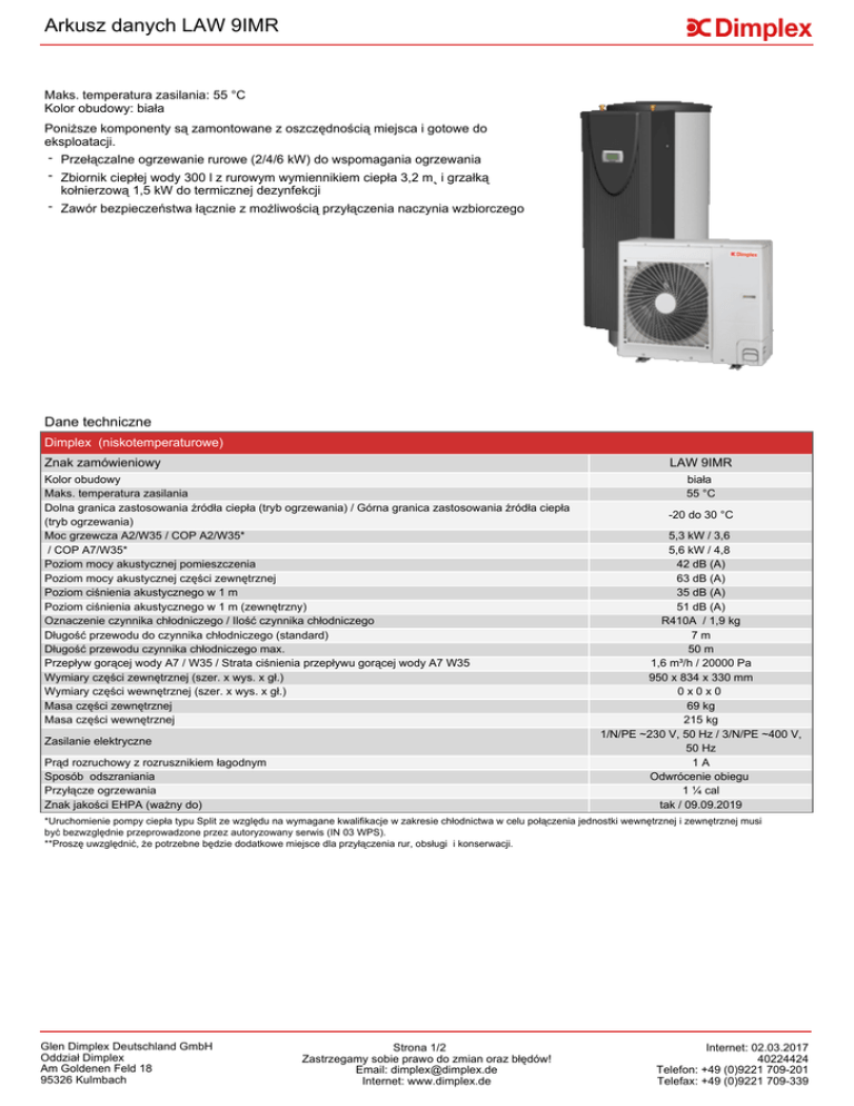 Arkusz danych LAW 9IMR Maks. temperatura zasilania: 55 °C Kolor obudowy: biała Poniższe komponenty są zamontowane z oszczędnością miejsca i gotowe do eksploatacji. - Przełączalne ogrzewanie rurowe (2/4/6 kW) do wspomagania ogrzewania - Zbiornik ciepłej wody 300 l z rurowym wymiennikiem ciepła 3,2 m˛ i grzałką kołnierzową 1,5 kW do termicznej dezynfekcji - Zawór bezpieczeństwa łącznie z możliwością przyłączenia naczynia wzbiorczego Dane techniczne Dimplex (niskotemperaturowe) Znak zamówieniowy LAW 9IMR Kolor obudowy Maks. temperatura zasilania Dolna granica zastosowania źródła ciepła (tryb ogrzewania) / Górna granica zastosowania źródła ciepła (tryb ogrzewania) Moc grzewcza A2/W35 / COP A2/W35* / COP A7/W35* Poziom mocy akustycznej pomieszczenia Poziom mocy akustycznej części zewnętrznej Poziom ciśnienia akustycznego w 1 m Poziom ciśnienia akustycznego w 1 m (zewnętrzny) Oznaczenie czynnika chłodniczego / Ilość czynnika chłodniczego Długość przewodu do czynnika chłodniczego (standard) Długość przewodu czynnika chłodniczego max. Przepływ gorącej wody A7 / W35 / Strata ciśnienia przepływu gorącej wody A7 W35 Wymiary części zewnętrznej (szer. x wys. x gł.) Wymiary części wewnętrznej (szer. x wys. x gł.) Masa części zewnętrznej Masa części wewnętrznej Zasilanie elektryczne Prąd rozruchowy z rozrusznikiem łagodnym Sposób odszraniania Przyłącze ogrzewania Znak jakości EHPA (ważny do) biała 55 °C -20 do 30 °C 5,3 kW / 3,6 5,6 kW / 4,8 42 dB (A) 63 dB (A) 35 dB (A) 51 dB (A) R410A / 1,9 kg 7m 50 m 1,6 m³/h / 20000 Pa 950 x 834 x 330 mm 0x0x0 69 kg 215 kg 1/N/PE ~230 V, 50 Hz / 3/N/PE ~400 V, 50 Hz 1A Odwrócenie obiegu 1 ¼ cal tak / 09.09.2019 *Uruchomienie pompy ciepła typu Split ze względu na wymagane kwalifikacje w zakresie chłodnictwa w celu połączenia jednostki wewnętrznej i zewnętrznej musi być bezwzględnie przeprowadzone przez autoryzowany serwis (IN 03 WPS). **Proszę uwzględnić, że potrzebne będzie dodatkowe miejsce dla przyłączenia rur, obsługi i konserwacji. Glen Dimplex Deutschland GmbH Oddział Dimplex Am Goldenen Feld 18 95326 Kulmbach Strona 1/2 Zastrzegamy sobie prawo do zmian oraz błędów! Email: [email protected] Internet: www.dimplex.de Internet: 02.03.2017 40224424 Telefon: +49 (0)9221 709-201 Telefax: +49 (0)9221 709-339 Wyposażenie urządzenia LAW 9IMR Opis Typ-nr Numer Ilości artykułu przykładowe Sztuk Cena Pompa ciepła Kołnierz uszczelniający ścienny (stal nierdzewna V2A) Samouszczelniający kołnierz ścienny (rura ochronna z wężem skurczowym) MDF 145 358910 MDM 145 358890 EB KPV WWM 25 MMH 25 VTB 25 AS 976 CTHK 630 CTHK 631 VSE 32-50 VSE 32-100 VSE 32-150 VSE 32-200 VSE 32-300 PSW 500 PSW 1000 348650 346600 348640 339870 322180 363610 336180 362520 362530 362540 362550 362560 339210 361640 SVK 852 326660 NWPM EWPM LWPM 410 AP PGD NTC-10M FG 3115 356960 356970 339410 356570 363600 336620 Akcesoria hydrauliczne Dodatkowe podzespoły EB KPV Moduł ciepłej wody / moduł niemieszanego obiegu grzewczego Mieszany obieg grzewczy z czujnikiem temperatury Belka rozdzielacza Przyłącze węża 1* Grzałka zanurzeniowa 4,5 kW; ~230 V Grzałka 2,0 kW Wstępnie obrobiona rura falista ze stali nierdzewnej DN 32 Wstępnie obrobiona rura falista ze stali nierdzewnej DN 32 Wstępnie obrobiona rura falista ze stali nierdzewnej DN 32 Wstępnie obrobiona rura falista ze stali nierdzewnej DN 32 Wstępnie obrobiona rura falista ze stali nierdzewnej DN 32 Uniwersalny zbiornik buforowy 500 l* Stojący zbiornik buforowy 1000 l* 1 1 Wyposażenie dodatkowe przygotowania ciepłej wody Układ zaworów zabezpieczających Wyposażenie dodatkowe techniki regulacji Rozszerzenie dla podłączenia sieci Ethernet Rozszerzenie dla przyłączenia magistrali KNX/EIB Rozszerzenie dla połączenia typu Modbus Pilot zdalnego sterowania WPM 2006/2007/EconPlus/R* Czujnik temperatury NTC-10 z tuleją metalową Czujnik temperatury zewnętrznej w obudowie * Dodatkowe szczególne wyposażenie do dyspozycji / wymagane Ważna wskazówka: Kombinacja komponentów i podana ilość przedstawia niewiążące przykładowe urządzenie, które musi być sprawdzone i dopasowane według indywidualnych potrzeb. Wielkość pompy powinna zostać sprawdzona według spadku ciśnienia urządzenia i minimalnego przepływu wody grzewczej pompy ciepła. Glen Dimplex Deutschland GmbH Oddział Dimplex Am Goldenen Feld 18 95326 Kulmbach Strona 2/2 Zastrzegamy sobie prawo do zmian oraz błędów! Email: [email protected] Internet: www.dimplex.de Internet: 02.03.2017 40224424 Telefon: +49 (0)9221 709-201 Telefax: +49 (0)9221 709-339