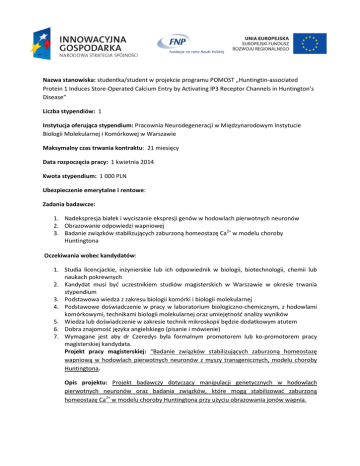 Nazwa stanowiska: studentka/student w projekcie programu POMOST „Huntingtin-associated Protein 1 Induces Store-Operated Calcium Entry by Activating IP3 Receptor Channels in Huntington’s Disease” Liczba stypendiów: 1 Instytucja oferująca stypendium: Pracownia Neurodegeneracji w Międzynarodowym Instytucie Biologii Molekularnej i Komórkowej w Warszawie Maksymalny czas trwania kontraktu: 21 miesięcy Data rozpoczęcia pracy: 1 kwietnia 2014 Kwota stypendium: 1 000 PLN Ubezpieczenie emerytalne i rentowe: Zadania badawcze: 1. Nadekspresja białek i wyciszanie ekspresji genów w hodowlach pierwotnych neuronów 2. Obrazowanie odpowiedzi wapniowej 3. Badanie związków stabilizujących zaburzoną homeostazę Ca2+ w modelu choroby Huntingtona Oczekiwania wobec kandydatów: 1. Studia licencjackie, inżynierskie lub ich odpowiednik w biologii, biotechnologii, chemii lub naukach pokrewnych 2. Kandydat musi być uczestnikiem studiów magisterskich w Warszawie w okresie trwania stypendium 3. Podstawowa wiedza z zakresu biologii komórki i biologii molekularnej 4. Podstawowe doświadczenie w pracy w laboratorium biologiczno-chemicznym, z hodowlami komórkowymi, technikami biologii molekularnej oraz umiejętność analizy wyników 5. Wiedza lub doświadczenie w zakresie technik mikroskopii będzie dodatkowym atutem 6. Dobra znajomość języka angielskiego (pisanie i mówienie) 7. Wymagane jest aby dr Czeredys była formalnym promotorem lub ko-promotorem pracy magisterskiej kandydata. Projekt pracy magisterskiej: “Badanie związków stabilizujących zaburzoną homeostazę wapniową w hodowlach pierwotnych neuronów z myszy transgenicznych, modelu choroby Huntingtona. Opis projektu: Projekt badawczy dotyczący manipulacji genetycznych w hodowlach pierwotnych neuronów oraz badania związków, które mogą stabilizować zaburzoną homeostazę Ca2+ w modelu choroby Huntingtona przy użyciu obrazowania jonów wapnia. Lista wymaganych dokumentów 1. CV, 2. list motywacyjny, 3. kontakt do ostatniego opiekuna Dodatkowe informacje o rekrutacji (strona www): http://www.iimcb.gov.pl/praca.html Imię i nazwisko laureata prowadzącego projekt w ramach którego oferowane jest stypendium: dr Magdalena Czeredys Adres przesyłania zgłoszeń: [email protected] Termin nadsyłania zgłoszeń: 14 marca 2014 Prosimy o zamieszczenie następującej klauzuli w przesłanej dokumentacji: "Wyrażam zgodę na przetwarzanie moich danych osobowych, zawartych w ofercie stypendialnej dla potrzeb niezbędnych dla realizacji procesu rekrutacji, zgodnie z Ustawą z 29.08.97 roku o Ochronie Danych Osobowych Dz.U. nr 133 poz. 883". Jednostka przedstawiająca ofertę stypendialną zastrzega sobie prawo kontaktu z wybranymi kandydatami.
