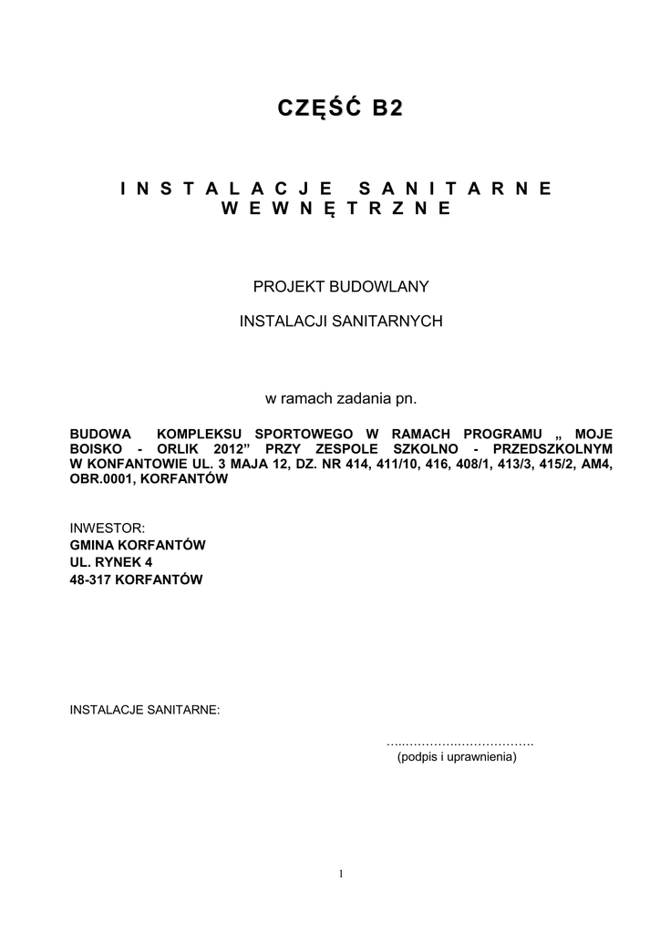 CZĘŚĆ B2 I N S T A L A C J E S A N I T A R N E W E W N Ę T R Z N E PROJEKT BUDOWLANY INSTALACJI SANITARNYCH w ramach zadania pn. BUDOWA KOMPLEKSU SPORTOWEGO W RAMACH PROGRAMU „ MOJE BOISKO - ORLIK 2012” PRZY ZESPOLE SZKOLNO - PRZEDSZKOLNYM W KONFANTOWIE UL. 3 MAJA 12, DZ. NR 414, 411/10, 416, 408/1, 413/3, 415/2, AM4, OBR.0001, KORFANTÓW INWESTOR: GMINA KORFANTÓW UL. RYNEK 4 48-317 KORFANTÓW INSTALACJE SANITARNE: …..………….………………. (podpis i uprawnienia) 1 WYKAZ ZAW ARTOŚCI PROJEKTU CZĘŚĆ OPISOWA ST RO N A T Y T UŁ O W A W Y K AZ Z AW AR T O ŚC I PR O J E KT U O P IS T E CH NI CZ NY 1. Podstawa opracowania 2. Zakres opracowania 3. Opis techniczny 3.1. Instalacja wody zimnej i ciepłej 3.2. Kanalizacja sanitarna 3.3. Instalacje grzewcze 3.4. Wentylacja pomieszczeń socjalnych 3.5. Instalacja gazowa z podłączeniem kotła gazowego 4. Wytyczne instalacji elektrycznej 5. Wytyczne branży budowlanej 6. Bezpieczeństwo użytkowania CZĘŚĆ RYSUNKOWA RYS. NR 01/IS – BUDYNEK ZAPLECZA SPORTOWEGO-RZUT PRZYZIEMIA – INSTALACJA WODOCIĄGOWA RYS. NR 02/IS – BUDYNEK ZAPLECZA SPORTOWEGO-RZUT PRZYZIEMIA – INSTALACJA KANALIZACJI SANITARNEJ RYS. NR 03/IS – BUDYNEK ZAPLECZA SPORTOWEGO-RZUT PRZYZIEMIA – INSTALACJA CENTRALNEGO OGRZEWANIA RYS. NR 04/IS – BUDYNEK ZAPLECZA SPORTOWEGO-RZUT PRZYZIEMIA – INSTALACJA WENTYLACJI MECHANICZNEJ RYS. NR 05/IS – BUDYNEK ZAPLECZA SPORTOWEGO-RZUT PRZYZIEMIA – INSTALACJA GAZOWA RYS. NR 06/IS – BUDYNEK ZAPLECZA SPORTOWEGO-AKSONOMETRIA – INSTALACJA GAZOWA 2 OPIS TECHNICZNY 1. PODSTAW A OPRACOW ANI A zlecenie inwestora, projekt architektoniczny, wytyczne techniczne projektowania instalacji z polipropylenu, PVC, miedzi mapa sytuacyjno-wysokościowa do celów projektowych w skali 1:500, wytyczne i DTR producentów urządzeń. 2. ZAKRES OPRACOWANIA Przedmiotem opracowania jest projekt budowlany branży instalacyjnej (woda zimna, ciepła, kanalizacja ogrzewanie, instalacja gazowa i wentylacja) stanowiącej element budowy kompleksu sportowego. Niniejsza część projektu zawiera: • instalacje wodociągowe • instalacje kanalizacji • instalację ogrzewania wraz z kotłownią gazową • instalację urządzeń wentylacyjnych obsługujących pomieszczenia socjalne • instalację gazową • wytyczne dla branży budowlanej związane z przedmiotem tej części projektu • elementy branży elektrycznej i AKP w zakresie j.w. 3. OPIS TECHNICZNY 3.1. Instalacja wody zimnej i ciepłej Przewody wody zimnej , ciepłej projektuje się z rur z polipropylenu łączonych przez zgrzewanie. Do łączenia rur z PP ze sobą lub z przewodami i urządzeniami z innych materiałów należy stosować kształtki systemowe łączone przez zgrzewanie. Podgrzew wody ciepłej zastosowano poprzez kompaktowy kocioł gazowy o mocy 26kW, kondensacyjny z wbudowanym wydajnym zbiornikiem c.w.u. o poj. 86l. a) Mocowanie przewodów. Do mocowania przewodów należy stosować uchwyty ze stali lub tworzyw sztucznych. Można również stosować uchwyty z blachy stalowej lub płaskownika lecz wtedy na całym obwodzie obejmy powinna być podkładka ochronna z gumy. Rozstaw uchwytów mocujących (przesuwnych) dla przewodów powinny wynosić odpowiednio: - dla średnicy 16 mm - 0,65 m - dla średnicy 20 mm - 0,70 m - dla średnicy 25 mm - 0,80 m - dla średnicy 32 mm - 0,90 m b) Kompensacja przewodów Instalacje wykonane z PP należy wyposażyć w kompensatory. Podstawową zasadą przy wbudowywaniu kompensatorów jest to, aby: był umieszczony pomiędzy punktami stałymi lub dwoma odgałęzieniami, w osi kompensator był mocowany punktem stałym. 3 c) Odbiór instalacji i przekazanie do eksploatacji Próbę szczelności instalacji należy przeprowadzić tak jak przy odbiorze instalacji z materiałów tradycyjnych, tj. zgodnie z normą PN-81/B-10700. Próbę szczelności należy poprzedzić napełnieniem instalacji wodą poprzez zainstalowany filtr siatkowy zatrzymujący cząstki stałe , co zapobiega niszczeniu ochronnej warstwy tlenowej. Po przeprowadzeniu próby ciśnieniowej instalacja musi być wypłukana w celu usunięcia zanieczyszczeń montażowych. Instalację należy płukać wodą przepuszczaną przez filtr siatkowy. d) Obliczenia Przepływ obliczeniowy w budynku obliczono zgodnie z wytycznymi normy PN-92/01706 *Instalacje wodociągowe *.Wymagania w projektowaniu. Przepływ obliczeniowy dla budynku obliczono wg wzoru: q = 0,4 x ( qn )0,54 +0,48 dm3/s w którym : qn - normatywny wypływ z punktów czerpalnych , dm3/s ZESTAWIENIE NORMATYWNYCH WYPŁYWÓW Z PKT. CZERP. WC umywalka zaw. czerp. natrysk pisuar - 4 x 0,13 = 0,52 - 4 x 0,07 = 0,28 - 4 x 0,30 = 1,20 - 3 x 0,15 = 0,45 -1 x 0,30 = 0,30 ....................................... 2,75 Ogółem qn =2,75 dm3/s Przepływ obliczeniowy dla obiektu wynosi: q= 1,17 dm3/s Dobór wodomierza wody Umowny przepływ obliczeniowy dla wodomierza wynosi: Qw = 2 x q = 2 x 1,17 dm3/s = 2,34 dm3/s Dobrano wodomierz firmy PoWoGaz typ JS 2,5 DN20. 3.2. Kanalizacja sanitarna Wewnętrzna instalacja kanalizacyjna charakteryzująca się grawitacyjnym spływem ścieków wymaga wymuszonej lokalizacji przewodów w budynku, stwarzając dla poszczególnych fragmentów instalacji odmienne warunki eksploatacji. Przewody kanalizacji wewnętrznej projektuje się z tworzywa sztucznego. Prowadzone są one pod posadzką podłogi zgodnie z wymaganiami normy. Dla celów samokompensacji przewodów kanalizacyjnych w przypadku odcinków dłuższych niż 2,5 m należy stosować prostki z wydłużonym kielichem. Przewody poziome kanalizacyjne należy układać z zachowaniem minimalnego spadku dla danej średnicy, zgodnie z wymaganiami określonymi w normie PN-92/01707 *instalacje kanalizacyjne*. Poziomy kanalizacyjne wykonane w podłożu wymagają wykonania wykopu z podłożem stabilizowanym podsypką z piasku lub drobnego żwiru . Piony kanalizacyjne będą prowadzone z przewodami innych instalacji których temperatura eksploatacyjna przekracza