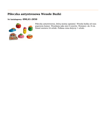 Piłeczka antystresowa Wesołe Buźki Nr katalogowy: 090,61-2050 Piłeczka antystresowa, którą można ugniatać. Wesoła buźka od razu poprawia humor. Wysyłamy jako mix 6 wzorów. Wymiary: ok. 8 cm. Stand zawiera 24 sztuki. Podana cena dotyczy 1 sztuki.
