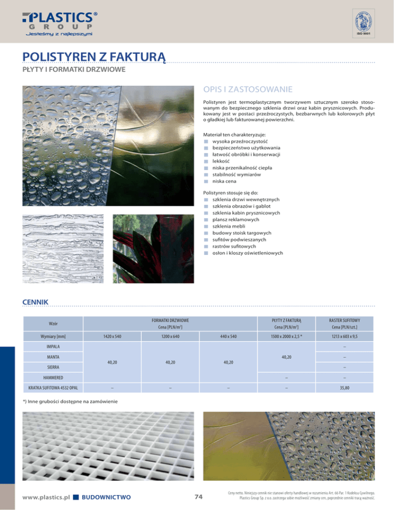 POLISTYREN Z FAKTURĄ PŁYTY I FORMATKI DRZWIOWE OPIS I ZASTOSOWANIE Polistyren jest termoplastycznym tworzywem sztucznym szeroko stosowanym do bezpiecznego szklenia drzwi oraz kabin prysznicowych. Produkowany jest w postaci przeźroczystych, bezbarwnych lub kolorowych płyt o gładkiej lub fakturowanej powierzchni. Materiał ten charakteryzuje: wysoka przeźroczystość bezpieczeństwo użytkowania łatwość obróbki i konserwacji lekkość niska przenikalność ciepła stabilność wymiarów niska cena Polistyren stosuje się do: szklenia drzwi wewnętrznych szklenia obrazów i gablot szklenia kabin prysznicowych plansz reklamowych szklenia mebli budowy stoisk targowych sufitów podwieszanych rastrów sufitowych osłon i kloszy oświetleniowych CENNIK FORMATKI DRZWIOWE Cena [PLN/m2] Wzór Wymiary [mm] 1420 x 540 1200 x 640 440 x 540 PŁYTY Z FAKTURĄ Cena [PLN/m2] RASTER SUFITOWY Cena [PLN/szt.] 1500 x 2000 x 2,5 * 1213 x 603 x 9,5 IMPALA – MANTA 40,20 40,20 40,20 SIERRA – HAMMERED KRATKA SUFITOWA 4532 OPAL – 40,20 – – – – – – 35,80 *) Inne grubości dostępne na zamówienie www.plastics.pl BUDOWNICTWO 74 Ceny netto. Niniejszy cennik nie stanowi oferty handlowej w rozumieniu Art. 66 Par. 1 Kodeksu Cywilnego. Plastics Group Sp. z o.o. zastrzega sobie możliwość zmiany cen, poprzednie cenniki tracą ważność. POLISTYREN Z FAKTURĄ DANE TECHNICZNE własności elektryczne wł. udarnościowe własności cieplne własności mechaniczne własności fizyczne Parametr Metoda badania Jednostka 3 PS Ciężar właściwy D - 1505 g/cm Twardość Rockwella D - 785 M - scale 76 Przepuszczalność światła 5036 % 93,7 Współczynnik załamania światła 53491 Moduł giętkości 53452 MPa 3200 Wytrzymałość na zginanie 53452 MPa 100 Moduł rozciągania 53455 MPa 3100 Wytrzymałość na rozciąganie 53455 MPa 50 Wytrzymałość na zginanie 53455 % 3 Temperatura Vicata 53460 °C >98 Temperatura odchylenia 53461 °C 86/98 D – 2766 J/gK 1,8 Wsp. liniowy rozszerzalności cieplnej 53752 Kx10 8 Przewodność ciepła 52612 W/mK 0,17 Temperatura rozkładu °C >280 Maksymalna temperatura pracy °C 80 Temperatura formowania °C Pojemność cieplna 1,05 1,59 130 ÷ 170 3 10 14 Udarność z karbem (Izod) ISO 180 kJ/m Udarność z karbem (Charpy) 53453 kJ/m3 Stała dieelektryczna IEC 250 2,5 3 >1016 Opór właściwy objętości D 257 kV/cm Opór powierzchni D 257 kV/cm3 >1014 Wytrzymałość dielektryczna D 149 kV/mm 20 Współczynnik rozproszenia (50 Hz) IEC 250 Niniejszy cennik nie stanowi oferty handlowej w rozumieniu Art. 66 Par. 1 Kodeksu Cywilnego. Ceny netto. Plastics Group Sp. z o.o. zastrzega sobie możliwość zmiany cen, poprzednie cenniki tracą ważność. 75 9x10 –5 BUDOWNICTWO www.plastics.pl