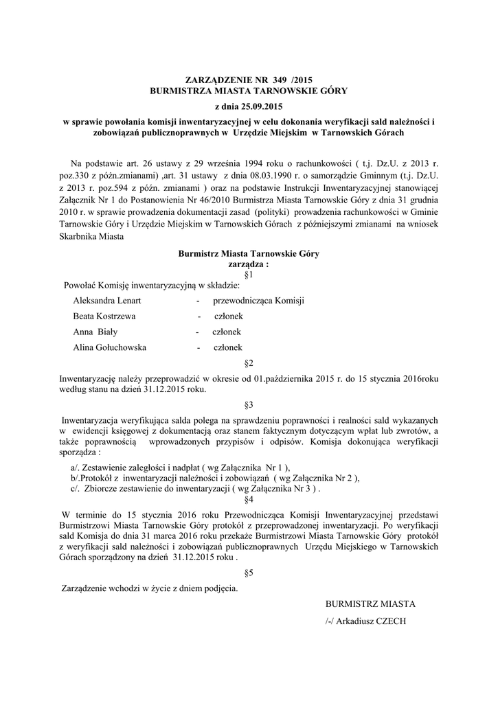 ZARZĄDZENIE NR 349 /2015 BURMISTRZA MIASTA TARNOWSKIE GÓRY z dnia 25.09.2015 w sprawie powołania komisji inwentaryzacyjnej w celu dokonania weryfikacji sald należności i zobowiązań publicznoprawnych w Urzędzie Miejskim w Tarnowskich Górach Na podstawie art. 26 ustawy z 29 września 1994 roku o rachunkowości ( t.j. Dz.U. z 2013 r. poz.330 z póżn.zmianami) ,art. 31 ustawy z dnia 08.03.1990 r. o samorządzie Gminnym (t.j. Dz.U. z 2013 r. poz.594 z późn. zmianami ) oraz na podstawie Instrukcji Inwentaryzacyjnej stanowiącej Załącznik Nr 1 do Postanowienia Nr 46/2010 Burmistrza Miasta Tarnowskie Góry z dnia 31 grudnia 2010 r. w sprawie prowadzenia dokumentacji zasad (polityki) prowadzenia rachunkowości w Gminie Tarnowskie Góry i Urzędzie Miejskim w Tarnowskich Górach z późniejszymi zmianami na wniosek Skarbnika Miasta Burmistrz Miasta Tarnowskie Góry zarządza : §1 Powołać Komisję inwentaryzacyjną w składzie: Aleksandra Lenart - przewodnicząca Komisji Beata Kostrzewa - członek Anna Biały - członek Alina Gołuchowska - członek §2 Inwentaryzację należy przeprowadzić w okresie od 01.października 2015 r. do 15 stycznia 2016roku według stanu na dzień 31.12.2015 roku. §3 Inwentaryzacja weryfikująca salda polega na sprawdzeniu poprawności i realności sald wykazanych w ewidencji księgowej z dokumentacją oraz stanem faktycznym dotyczącym wpłat lub zwrotów, a także poprawnością wprowadzonych przypisów i odpisów. Komisja dokonująca weryfikacji sporządza : a/. Zestawienie zaległości i nadpłat ( wg Załącznika Nr 1 ), b/.Protokół z inwentaryzacji należności i zobowiązań ( wg Załącznika Nr 2 ), c/. Zbiorcze zestawienie do inwentaryzacji ( wg Załącznika Nr 3 ) . §4 W terminie do 15 stycznia 2016 roku Przewodnicząca Komisji Inwentaryzacyjnej przedstawi Burmistrzowi Miasta Tarnowskie Góry protokół z przeprowadzonej inwentaryzacji. Po weryfikacji sald Komisja do dnia 31 marca 2016 roku przekaże Burmistrzowi Miasta Tarnowskie Góry protokół z weryfikacji sald należności i zobowiązań publicznoprawnych Urzędu Miejskiego w Tarnowskich Górach sporządzony na dzień 31.12.2015 roku . §5 Zarządzenie wchodzi w życie z dniem podjęcia. BURMISTRZ MIASTA /-/ Arkadiusz CZECH Załącznik nr 1 do Zarządzenia Burmistrza Miasta Nr /2015 z dnia ZESTAWIENIE ZALEGŁOŚCI I NADPŁAT Lp. Razem Konto Saldo zaległości Imię i nazwisko nadpłata 0,00 0,00 Dokonano weryfikacji salda na dzień……………………. Podpis ………………………. Uwagi Załącznik nr 2 do Zarządzenia Burmistrza Miasta Nr /2015z dnia PROTOKÓŁ Z WERYFIKACJI sald konta………………………………..np. 221 „ Należności z tytułu dochodów budżetowych” na dzień ……………………………… Zespół weryfikacyjny w składzie: 1…………………………………………………………………………………………………… 2…………………………………………………………………………………………………… 3………………………………………………………………………………………………….. W dniu…………………………………zweryfikował salda konta…………………………………………………………………....... i stwierdził, że salda konta wynikają z zapisów udokumentowanych sprawdzonymi i zatwierdzonymi dokumentami. Saldo należności i saldo zobowiązań jest realne i poprawnie ustalone. Saldo Wn obejmuje: a) np. 221 dz. 756 rozdz. 75615 §0310 ( czy też podatek od nieruchomości od osób prawnych w zależności od sposobu ujęcia w ewidencji analitycznej)………………….zł……………………………….. b) ……………………………………………………………………………………………………………..zł……………………………… c) ……………………………………………………………………………………………………………..zł……………………………… (saldo obejmuje również odsetki za zwłokę od zaległości podatkowych np. dz.756 rozdz.75615 § 0910). Saldo Ma obejmuje: a) np. 221 dz. 756 rodz.75615 § 0310 (czy też podatek od nieruchomości od osób prawnych w zależności od sposobu ujęcia w ewidencji analitycznej)………………….zł……………………………….. b) ……………………………………………………………………………………………………………..zł……………………………… c) ……………………………………………………………………………………………………………..zł……………………………… Salda końcowe na dzień …………………………………..wynoszą……………………………….zł. Podpis osoby odpowiedzialnej za ewidencję księgową Podpis członków zespołu weryfikacyjnego: 1………………………………………………………………………………….. 2………………………………………………………………………………….. 3…………………………………………………………………………………. Zatwierdzono: ………………………………… Główny księgowy ………………………………………. Kierownik jednostki Załącznik nr 3 do Zarządzenia Burmistrza Miasta Nr /2015 z dnia Inwentaryzacja w drodze weryfikacji zapisów ksiąg rachunkowych z odpowiednimi dokumentami 31.12.2015r. Konta zespołu 2 " Rozrachunki i roszczenia" Nr konta Razem Nazwa konta Nazwa rachunku Stan księgowy Wn Ma Stan faktyczny Wn Ma Różnica Uwagi
