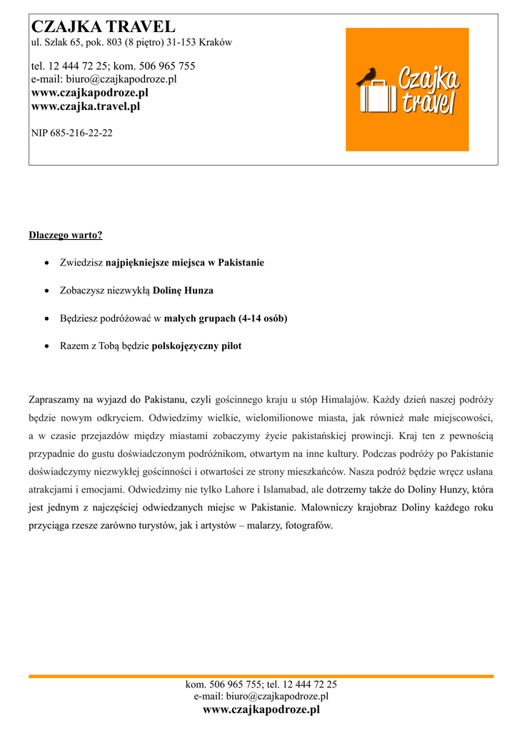 CZAJKA TRAVEL ul. Szlak 65, pok. 803 (8 piętro) 31-153 Kraków tel. 12 444 72 25; kom. 506 965 755 e-mail: [email protected] www.czajkapodroze.pl www.czajka.travel.pl NIP 685-216-22-22 Dlaczego warto? Zwiedzisz najpiękniejsze miejsca w Pakistanie Zobaczysz niezwykłą Dolinę Hunza Będziesz podróżować w małych grupach (4-14 osób) Razem z Tobą będzie polskojęzyczny pilot Zapraszamy na wyjazd do Pakistanu, czyli gościnnego kraju u stóp Himalajów. Każdy dzień naszej podróży będzie nowym odkryciem. Odwiedzimy wielkie, wielomilionowe miasta, jak również małe miejscowości, a w czasie przejazdów między miastami zobaczymy życie pakistańskiej prowincji. Kraj ten z pewnością przypadnie do gustu doświadczonym podróżnikom, otwartym na inne kultury. Podczas podróży po Pakistanie doświadczymy niezwykłej gościnności i otwartości ze strony mieszkańców. Nasza podróż będzie wręcz usłana atrakcjami i emocjami. Odwiedzimy nie tylko Lahore i Islamabad, ale dotrzemy także do Doliny Hunzy, która jest jednym z najczęściej odwiedzanych miejsc w Pakistanie. Malowniczy krajobraz Doliny każdego roku przyciąga rzesze zarówno turystów, jak i artystów – malarzy, fotografów. kom. 506 965 755; tel. 12 444 72 25 e-mail: [email protected] www.czajkapodroze.pl PROGRAM 1 dzień: Wylot z Warszawy do Islamabadu (z przesiadkami). 2 dzień: ISLAMABAD Przylot do Islamabadu w godzinach porannych a następnie zwiedzanie Islamabadu, w trakcie którego odwiedzimy m.in. Muzeum Lok Virsa, w którym będziemy mieli okazję poznać historię kraju i lokalne tradycje, czy też Meczet Faisal. Przerwa obiadowa na wzgórzu Daman-i-Koh, z którego można podziwiać malowniczą panoramę miasta. Po południu przejedziemy do oddalonego o niecałe 15 km Rawalpindi, gdzie zobaczymy zabytkowe targowisko Raja. Nocleg w Islamabad. 3 dzień: ISLAMABAD – TAXILA - BESHAM Tego dnia wyruszymy do miejscowości Taxila, która położona jest niecałe 50 km od Islamabad. Na miejscu zobaczymy Muzeum Miejskie oraz zabytkowe ruiny buddyjskiego klasztoru Jaulian. Choć ruiny pochodzą sprzed 2500 lat, to w dobrym stanie zachowały się płaskorzeźby przedstawiające życie i nauki Buddy. Potem przejedziemy do Mansehra, gdzie zobaczymy fragmenty filarów z edyktem Aśoki, pochodzące z III wieku p.n.e. Następnie wyruszymy w podróż do Besham. Cała trasa zajmie nam około 10 godzin, choć to niecałe 300 km. Nocleg w Besham. 4 dzień: BESHAM - CHILAS Po śniadaniu wyruszymy w stronę Chilas. Po drodze zatrzymamy się w miejscowości Shatyal, by zobaczyć tamtejsze napisy wykute w skałach, utworzone przez kupców i pielgrzymów zmierzających na Bliski Wschód. Następnie będziemy kontynuować przejazd po słynnej Szosie Karakorumskiej, która jest najwyżej położoną drogą na świecie o utwardzonej nawierzchni. Nocleg w Chilas. 5 dzień: CHILAS – MOST RAIKOT - FAIRY MEADOWS Tego dnia wyruszymy w 2-godzinny przejazd do Raikot, by zobaczyć tamtejszy most. Następnie przesiądziemy się do samochodów terenowych, którymi po 2 godzinach dotrzemy do Tato. Z Tato wyruszymy w 3-godzinną wędrówkę do Fairy Meadows, czyli łąki położonej na wysokości 3300 m n.p.m u stóp Nanga Parbat, która jest jednocześnie parkiem narodowym. Nocleg w schronisku. 6 dzień: FAIRY MEADOWS Tego dnia będziemy mieli okazję podziwiać piękno wysokogórskiej Fairy Meadows, która zapiera dech w piersiach. Z tego terenu wspaniale widać ośmiotysięcznik Nanga Parbat (8125 m). Dotrzemy do pastwiska Beyal, z którego będziemy mogli podziwiać szczyty Chongra (6820m.) i Riakot (7080m.). Następnie przejdziemy pod lodowiec Ganalo, z którego po 3 godzinach wędrówki dotrzemy do obozu u stóp Nanga kom. 506 965 755; tel. 12 444 72 25 e-mail: [email protected] www.czajkapodroze.pl Parbat (na wysokości 3970 m n.p.m). Później zejdziemy do Beyal, z którego powrócimy do Fairy Meadows. Nocleg w schronisku. 7 dzień: FAIRY MEADOWS – TATO – KARIMABAD HUNZA Po śniadaniu wyruszymy w pieszą wędrówkę do Tato, skąd następnie przejedziemy samochodami do Karimabad – dawnej stolicy Doliny Hunzy. Nocleg w Karimabad. 8 dzień: DOLINA HUNZY Dzień rozpoczniemy od wizyty w Zamku Baltit, który został zbudowany 900 lat temu, a od kilku lat znajduje się na liście UNESCO. Następnie przejdziemy wzdłuż kanału irygacyjnego, skąd będziemy podziwiać niesamowite panoramy Karakorum. Po tradycyjnym obiedzie zwiedzimy fort Altit. Tego dnia będziemy mieli także okazję podziwiać niezwykły zachód słońca z widokiem na Dolinę Hunzy z punktu widokowego Duiker, który położony jest na wysokości 2935 m n.p.m. Nocleg w Karimabad. 9 dzień: KARIMABAD – PASSU - GILGIT Po śniadaniu przejedziemy do Gulmit, gdzie zobaczymy tamtejsze muzeum i przespacerujemy się po wiosce. Później pojedziemy do Passu, gdzie będziemy podziwiać tamtejszy lodowiec oraz górski szczyt Passu Sar. Przed przyjazdem do Gilgit zatrzymamy się w miejscowości Kargah, by zobaczyć tamtejsze stanowisko archeologiczne, w którym znajduje się wykuty w skale wizerunek Buddy. Nocleg w Gilgit. 10 dzień: GILGIT – ISLAMABAD Przelot lokalnymi liniami z Gilgit do Islamabad. Czas wolny w Islamabad. Nocleg w Islamabad. 11 dzień: POŻEGNANIE Wylot z Islamabad do Polski. Kolejność zwiedzania może ulec zmianie. Przylot do Polski w zależności od lotów może nastąpić dzień później. CENA OBEJMUJE: Bilet lotniczy na trasie Warszawa-Islamabad-Warszawa (do kwoty 3800 PLN) 9 noclegów zgodnie z programem 9 śniadań Transport zgodnie z programem (wynajęty komfortowy i klimatyzowany bus, samochody 4x4) Wiza wjazdowa kom. 506 965 755; tel. 12 444 72 25 e-mail: [email protected] www.czajkapodroze.pl Opiekę polskiego pilota Opiekę miejscowego przewodnika Bilety wstępu do miejsc wymienionych w programie Ubezpieczenie KL, NNW, bagażu CENA NIE OBEJMUJE: Wyżywienia Wydatków na pamiątki TERMINY/CENY TERMIN CENA (4-5 osób) CENA (6-8 osób) CENA (