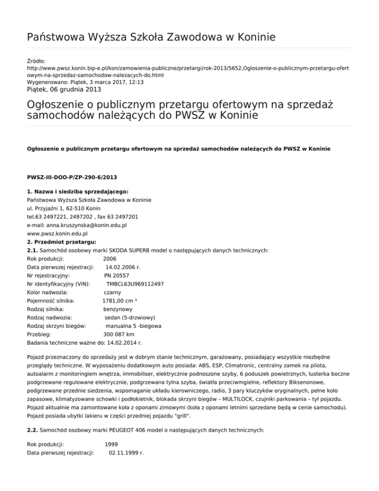 Państwowa Wyższa Szkoła Zawodowa w Koninie Źródło: http://www.pwsz.konin.bip-e.pl/kon/zamowienia-publiczne/przetargi/rok-2013/5652,Ogloszenie-o-publicznym-przetargu-ofert owym-na-sprzedaz-samochodow-nalezacych-do.html Wygenerowano: Piątek, 3 marca 2017, 12:13 Piątek, 06 grudnia 2013 Ogłoszenie o publicznym przetargu ofertowym na sprzedaż samochodów należących do PWSZ w Koninie Ogłoszenie o publicznym przetargu ofertowym na sprzedaż samochodów należących do PWSZ w Koninie PWSZ-III-DOO-P/ZP-290-6/2013 1. Nazwa i siedziba sprzedającego: Państwowa Wyższa Szkoła Zawodowa w Koninie ul. Przyjaźni 1, 62-510 Konin tel.63 2497221, 2497202 , fax 63 2497201 e-mail: [email protected] www.pwsz.konin.edu.pl 2. Przedmiot przetargu: 2.1. Samochód osobowy marki SKODA SUPERB model o następujących danych technicznych: Rok produkcji: 2006 Data pierwszej rejestracji: 14.02.2006 r. Nr rejestracyjny: PN 20557 Nr identyfikacyjny (VIN): TMBCL63U969112497 Kolor nadwozia: czarny Pojemność silnika: 1781,00 cm ³ Rodzaj silnika: benzynowy Rodzaj nadwozia: sedan (5-drzwiowy) Rodzaj skrzyni biegów: manualna 5 -biegowa Przebieg: 300 087 km Badania techniczne ważne do: 14.02.2014 r. Pojazd przeznaczony do sprzedaży jest w dobrym stanie technicznym, garażowany, posiadający wszystkie niezbędne przeglądy techniczne. W wyposażeniu dodatkowym auto posiada: ABS, ESP, Climatronic, centralny zamek na pilota, autoalarm z monitoringiem wnętrza, immobiliser, elektrycznie podnoszone szyby, 6 poduszek powietrznych, lusterka boczne podgrzewane regulowane elektrycznie, podgrzewana tylna szyba, światła przeciwmgielne, reflektory Biksenonowe, podgrzewane przednie siedzenia, wspomaganie układu kierowniczego, radio, 3 pary kluczyków oryginalnych, pełne koło zapasowe, klimatyzowane schowki i podłokietnik, blokada skrzyni biegów – MULTILOCK, czujniki parkowania – tył pojazdu. Pojazd aktualnie ma zamontowane koła z oponami zimowymi (koła z oponami letnimi sprzedane będą w cenie samochodu). Pojazd posiada ubytki lakieru w części przedniej pojazdu "grill". 2.2. Samochód osobowy marki PEUGEOT 406 model o następujących danych technicznych: Rok produkcji: Data pierwszej rejestracji: 1999 02.11.1999 r. Nr rejestracyjny: PN 51557 Nr identyfikacyjny (VIN): VF38BLFYE80808900 Kolor nadwozia: zielony Pojemność silnika: 1761,00 cm ³ Rodzaj silnika: benzynowy Rodzaj nadwozia: sedan (5-drzwiowy) Rodzaj skrzyni biegów: manualna 5 -biegowa Przebieg: 259 757 km Badania techniczne ważne do: 25.11.2014 r. Pojazd przeznaczony do sprzedaży jest w dobrym stanie technicznym, garażowany, posiadający wszystkie niezbędne przeglądy techniczne. W wyposażeniu dodatkowym auto posiada: ABS, klimatyzację (niesprawna), centralny zamek na pilota, immobiliser, elektrycznie podnoszone szyby z przodu, 2 poduszki powietrzne, podgrzewana tylna szyba, wspomaganie układu kierowniczego, radio, 2 pary kluczyków oryginalnych. Pojazd aktualnie ma zamontowane koła z oponami zimowymi (koła z oponami letnimi sprzedane będą w cenie samochodu). 2.3. Samochód osobowy marki FS-LUBLIN ŻUK A0701B model o następujących danych technicznych: Rok produkcji: 1992 Data pierwszej rejestracji: 28.06.1993 r. Nr rejestracyjny: PKO F867 Nr identyfikacyjny (VIN): SUL070111N0560447 Kolor nadwozia: szary Pojemność silnika: 2120,00 cm ³ Rodzaj silnika: benzynowy Rodzaj skrzyni biegów: manualna 4 - biegowa Przebieg: 32 036 km (licznik biegnie drugi raz) Badania techniczne ważne do: 27.03.2014 r. Pojazd przeznaczony do sprzedaży wykazuje znaczny stopień zużycia, posiada liczne ślady korozji, przedstawia średni stan techniczny. Posiada sprawne wszystkie mechanizmy. Pojazd sprzedawany bez akumulatora, garażowany. Posiada radio oraz 2 pary oryginalnych kluczyków. 3. Tryb przetargu: pisemny przetarg ofertowy Oferta pod rygorem nieważności, powinna być sporządzona w formie pisemnej i musi zawierać następujące dane oferenta: 3.1. imię i nazwisko lub nazwę firmy, 3.2. miejsce zamieszkania (siedziba), 3.3. numer telefonu, 3.4. numer PESEL w przypadku podatników będących osobami fizycznymi objętymi rejestrem PESEL nieprowadzących działalności gospodarczej lub niebędących zarejestrowanymi podatnikami podatku od towarów i usług, NIP w przypadku pozostałych podmiotów podlegających obowiązkowi ewidencyjnemu, 3.5. datę sporządzenia oferty, 3.6. oferowaną cenę, 3.7. oświadczenie oferenta, że zapoznał się ze stanem technicznym pojazdu i warunkami przetargu. 4. Cena wywoławcza samochodów: 4.1. Cena wywoławcza samochodu marki SKODA SUPERB wynosi 21 825,00 zł (słownie złotych: dwadzieścia jeden tysięcy osiemset dwadzieścia pięć 00/100). Cenę ustalono na podstawie opinii o wartości rynkowej pojazdu sporządzonej przez uprawnionego rzeczoznawcę majątkowego. 4.2. Cena wywoławcza samochodu marki PEUGEOT 406 wynosi 4 433,00 zł (słownie złotych: cztery tysiące czterysta trzydzieści trzy 00/100). Cenę ustalono na podstawie opinii o wartości rynkowej pojazdu sporządzonej przez uprawnionego rzeczoznawcę majątkowego. 4.3. Cena wywoławcza samochodu marki FS-LUBLIN ŻUK A0701B wynosi 1 500,00 zł (słownie złotych: jeden tysiąc pięćset 00/100). Cenę ustalono na podstawie opinii o wartości rynkowej pojazdu sporządzonej przez uprawnionego rzeczoznawcę majątkowego. Przedmiot przetargu jest zwolniony z podatku od towarów i usług na podstawie art. 43 ust.1, pkt 2 oraz ust. 2 Ustawy z dnia 11 marca 2004 roku o podatku od towarów i usług (Dz.U. z 2011, nr 177, poz.1054). Warunkiem przystąpienia do przetargu jest wniesienie wadium w wysokości: - Dla samochodu marki SKODA SUPERB – 2 182,50 zł (słownie złotych: dwa tysiące sto osiemdziesiąt dwa 50/100), - Dla samochodu marki PEUGEOT 406 – 443,30 zł (słownie złotych: czterysta czterdzieści trzy 30/100) - Dla samochodu marki FS-LUBLIB ŻUK A0701B – 150,00 zł (słownie złotych: sto pięćdziesiąt 00/100). Wadium należy wp