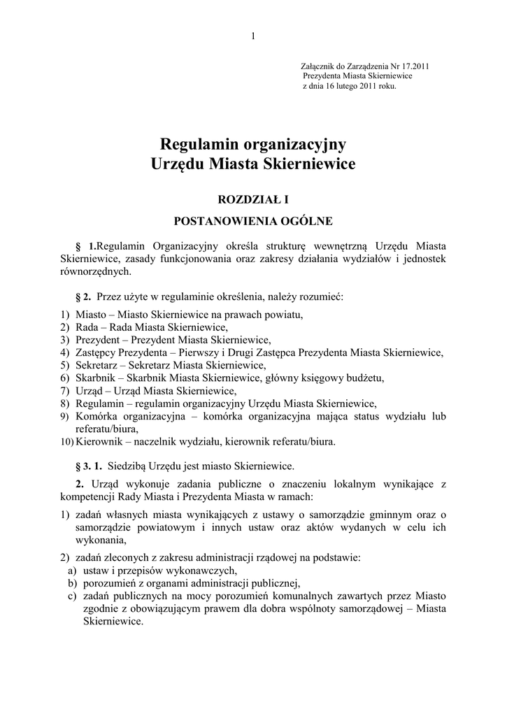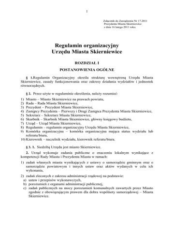 1 Załącznik do Zarządzenia Nr 17.2011 Prezydenta Miasta Skierniewice z dnia 16 lutego 2011 roku. Regulamin organizacyjny Urzędu Miasta Skierniewice ROZDZIAŁ I POSTANOWIENIA OGÓLNE § 1.Regulamin Organizacyjny określa strukturę wewnętrzną Urzędu Miasta Skierniewice, zasady funkcjonowania oraz zakresy działania wydziałów i jednostek równorzędnych. § 2. Przez użyte w regulaminie określenia, należy rozumieć: Miasto – Miasto Skierniewice na prawach powiatu, Rada – Rada Miasta Skierniewice, Prezydent – Prezydent Miasta Skierniewice, Zastępcy Prezydenta – Pierwszy i Drugi Zastępca Prezydenta Miasta Skierniewice, Sekretarz – Sekretarz Miasta Skierniewice, Skarbnik – Skarbnik Miasta Skierniewice, główny księgowy budżetu, Urząd – Urząd Miasta Skierniewice, Regulamin – regulamin organizacyjny Urzędu Miasta Skierniewice, 9) Komórka organizacyjna – komórka organizacyjna mająca status wydziału lub referatu/biura, 10) Kierownik – naczelnik wydziału, kierownik referatu/biura. 1) 2) 3) 4) 5) 6) 7) 8) § 3. 1. Siedzibą Urzędu jest miasto Skierniewice. 2. Urząd wykonuje zadania publiczne o znaczeniu lokalnym wynikające z kompetencji Rady Miasta i Prezydenta Miasta w ramach: 1) zadań własnych miasta wynikających z ustawy o samorządzie gminnym oraz o samorządzie powiatowym i innych ustaw oraz aktów wydanych w celu ich wykonania, 2) zadań zleconych z zakresu administracji rządowej na podstawie: a) ustaw i przepisów wykonawczych, b) porozumień z organami administracji publicznej, c) zadań publicznych na mocy porozumień komunalnych zawartych przez Miasto zgodnie z obowiązującym prawem dla dobra wspólnoty samorządowej – Miasta Skierniewice. 2 ROZDZIAŁ II ZASADY FUNKCJONOWANIA I STRUKTURA ORGANIZACYJNA URZĘDU § 4. 1. Prezydent Miasta jest Kierownikiem Urzędu. 2. Pracą Urzędu kieruje Prezydent przy pomocy dwóch Zastępców Prezydenta, Sekretarza i Skarbnika pełniącego jednocześnie funkcję głównego księgowego budżetu zgodnie z określonym w niniejszym regulaminie podziałem kompetencji i obowiązków. § 5.1. Do zadań i kompetencji Prezydenta należy w szczególności: 1) kierowanie bieżącymi sprawami Miasta i jego reprezentowanie na zewnątrz, 2) szczegółowe zadania i kompetencje Prezydenta określają ustawy i akty prawa miejscowego, 3) szczegółowe zakresy zadań Zastępców Prezydenta, Sekretarza i Skarbnika, ustala Prezydent w niniejszym regulaminie, 4) w czasie nieobecności Prezydenta Miasta jego zadania i kompetencje, przejmuje I Zastępcę Prezydenta. Jeżeli jest to niemożliwe obowiązki te przechodzą na II Zastępcę Prezydenta, 5) Prezydent może upoważnić Zastępców Prezydenta, Sekretarza i Skarbnika, oraz innych pracowników Urzędu do wydawania w jego imieniu decyzji administracyjnych. 2. Prezydent nadzoruje bezpośrednio pracę: Wydziału Organizacyjnego, Referatu Zamówień Publicznych Wydziału Geodezji, Katastru, Gospodarki Nieruchomościami i Rolnictwa, Geodety Miasta, Biura Prasowego, Referatu Zarządzania Kryzysowego i Obrony, Ochrony Ludności i Spraw Obronnych, 7) Komórki Kontroli i Audytu, 8) Miejskiego Rzecznika Konsumentów, 9) Pełnomocnika ds. informacji niejawnych, 10) Inspektora ds. bezpieczeństwa i higieny pracy, 11) Administratora bezpieczeństwa informacji 12) Biuro Projektu Uzdrowisko, 13) Komendy Miejskiej Państwowej Straży Pożarnej, 14) Powiatowego Urzędu Pracy, 15) Energetyki Cieplnej spółka z o.o., 16) Zakładu Wodociągów i Kanalizacji ,,WOD—KAN” spółka z o.o. 17) Miejskiej Pracowni Urbanistyczne, 18) Powiatowej Stacji Sanitarno-Epidemiologicznej. 1) 2) 3) 4) 5) 6) 3 § 6. 1. Pierwszy Zastępca Prezydenta realizuje zadania: 1. edukacji publicznej, 2. kultury i ochrony dóbr kultury, 3. kultury fizycznej, 4. współpracy z zagranica 5. rozwoju gospodarczego, miasta, 6. spraw społecznych, 7. współpraca z organizacjami pozarządowymi, 8. promocji miasta, 9. pomocy społecznej. 2. Pierwszy Zastępca bezpośrednio nadzoruje pracę: 1) Wydziału Edukacji, 2) Wydziału Kultury, Sportu i Promocji Miasta, 3) Wydziału Rozwoju Gospodarczego i Spraw Społecznych 4) Referatu Funduszy Społecznych 5) 25 placówek oświatowych, 6) Samorządowej szkoły muzycznej II stopnia, 7) Poradni Psychologiczno pedagogicznej 8) Miejskiego Ośrodka Pomocy Rodzinie, 9) Ośrodka Sportu i Rekreacji spółka z. o.o. 10) Pływalni Miejskiej NAWA spółka z. o.o. 11) Miejskiego Ośrodka Kultury, 12) Młodzieżowego Centrum Kultury, 13) Miejskiej Biblioteki Publicznej, 14) Biura Wystaw Artystycznych, 15) Izby Historii § 7. 1. Zastępca Prezydenta realizuje zadania: 1. realizacji inwestycji , 2. pozyskiwania funduszy inwestycyjnych, 3. administracji architektoniczno-budowlanej, 4. lokalnego transportu zbiorowego, 5. nadzorowania spraw z zakresu ewidencji pojazdów i kierowców, ośrodków szkolenia kierowców, stacji diagnostycznych, instruktorów nauki jazdy i diagnostów. 2. Zastępca Prezydenta bezpośrednio nadzoruje pracę: 1) Wydziału Inwestycji Kubaturowych, 2) 3) 4) 5) 6) 7) 8) Referatu Funduszy Inwestycyjnych, Wydział Architektury i Budownictwa, Wydziału Dróg i Komunikacji, Straży Miejskiej, Zakładu Utrzymania Miasta, Miejskiego Zakładu Komunikacji spółka z o.o., Miejskiego Inspektoratu Nadzoru Budowlanego. 4 § 8. 1. Sekretarz realizuje zadania: 1. ochrony środowiska i przyrody, 2. utrzymania czystości i porządku, 3. ewidencji ludności, dowodów osobistych, spraw wojskowych, 4. nadzoru organizacyjnego nad Urzędem Stanu Cywilnego, 2. Sekretarz bezpośrednio nadzoruje pracę: 1) 1Wydziału Gospodarki Komunalnej i Ochrony Środowiska, 2) Referatu Ochrony Środowiska, 3) Biura Rady Miasta, 4) Urzędu Stanu Cywilnego, 5) Wydziału Spraw Obywatelskich, 6) Zakładu Gospodarki Mieszkaniowej Spółka z.o.o. § 9. 1. Skarbnik inicjuje i koordynuje zadania prowadzące do pozyskiwania środków finansowych dla budżetu Miasta zapewnia prawidłową realizację budżetu Miasta ora