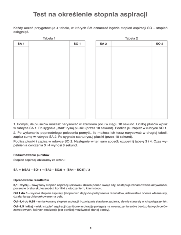 Test na określenie stopnia aspiracji Każdy uczeń przygotowuje 4 tabele, w których SA oznaczać będzie stopień aspiracji SO – stopień osiągnięć. Tabela 1 SA 1 Tabela 2 SO 1 SA 2 SO 2 1. Pomyśl, ile plusików możesz narysować w szerokim polu w ciągu 10 sekund. Liczbę plusów wpisz w rubryce SA 1. Po sygnale „start” rysuj plusiki (przez 10 sekund). Podlicz je i zapisz w rubryce SO 1. 2. Po wykonaniu poprzedniego polecenia pomyśl, ile możesz ich teraz narysować w drugiej tabeli, zapisz sumę w rubryce SA 2. Po sygnale startu rysuj plusiki (przez 10 sekund). Podlicz plusiki i zapisz w rubryce SO 2. Następnie w ten sam sposób uzupełnij tabelę 3 i 4. Czas wypełnienia ćwiczenia 3 i 4 wynosi 8 sekund. Podsumowanie punktów Stopień aspiracji obliczamy ze wzoru: SA = [(SA2 – SO1) +(SA3 – SO2) + (SA4 – SO3)] / 3 Opracowanie rezultatów 3,1 i wyżej – zawyżony stopień aspiracji (człowiek działa ponad swoje siły, następuje zahamowanie aktywności, poczucie braku skuteczności, konflikt z otoczeniem, kłamstwo); Od 1 do 3 – wysoki stopień aspiracji (stopniowo dąży do polepszenia rezultatów, adekwatnie ocenia własne siły, działania są ukierunkowane na cel); Od -1,4 do 0,99 – umiarkowany stopień aspiracji (rozwiązuje stawiane zadania, ale nie stara się o ich polepszenie); Od -1,5 i niżej – niski stopień aspiracji (zaniżone aspiracje polegają na wyznaczeniu sobie bardzo łatwych celów zawodowych, których realizacja jest poniżej możliwości danej osoby). 1