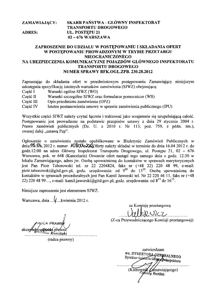 ZAMAWIAJ^CY: SKARB PANSTWA - GLOWNY INSPEKTORAT TRANSPORTU DROGOWEGO ADRES: UL. POST^PU 21 02 - 676 WARSZAWA ZAPROSZENIE DO UDZIALU W POST^POWANIU I SKLADANIA OFERT W POST^POWANIU PROWADZONYM W TRYBIE PRZETARGU NIEOGRANICZONEGO NA UBEZPIECZENIA KOMUNIKACYJNE POJAZDOW GLOWNEGO INSPEKTORATU TRANSPORTU DROGOWEGO NUMER SPRAWY BFK.OGL.ZPB. 230.28.2012 Zapraszajac do skiadania ofert w przedmiotowym postepowaniu Zamawiaj^cy niniejszym udostepnia specyfikacje istotnych warunkow zamowienia (SIWZ) obejmujaca: Czesc I Warunki ogolne SIWZ (WO) Czesc II Czesc III Czesc IV Warunki szczegolne SIWZ oraz formularze pomocnicze (WS) Opis przedmiotu zamowienia (OPZ) Istotne postanowienia umowy w sprawie zamowienia publicznego (IPU) Wszystkie czesci SIWZ nalezy czytac lacznie i traktowac jako wzajemnie sie uzupelniajaca calosc. Postepowanie jest prowadzone na podstawie przepisow ustawy z dnia 29 stycznia 2004 r. Prawo zamowien publicznych (Dz. U. z 2010 r. Nr 113, poz. 759, z pozn. zm.), zwanej dalej „ustaw^ Pzp". Ogloszenie o zamowieniu zostalo opublikowane w Biuletynie Zamowien Publicznych w dniu.P5-.Qk. 2012 r. numer ^0200WOAjpferty nalezy skladac w terminie do dnia 16.04 2012 r. do godz.!2:00 na adres Glowny Inspektorat Transportu Drogowego, ul. Postepu 21, 02 - 676 Warszawa, pok. nr 648 (Kancelaria) Otwarcie ofert nastapi tego samego dnia o godz. 12:30 w lokalu Zamawiajacego, adres jw. Osoba^ upowazniona do kontaktow w sprawach merytorycznych jest Pan Piotr Taborowski tel. nr 22 2204824, faks nr (+48 22) 220 48 99, e-mail: [email protected], godz. urzedowania: od 900 do 1530. Osoba upowazniona do kontaktow w sprawach proceduralnych jest Pan Kamil Jaworski tel. Nr 22 220 46 11, faks nr (+48 22) 220 48 99..., e-mail: [email protected], godz. urzedowania: od815 do 1615. Niniejsze zaproszenie jest elementem SIWZ. Warszawa, dnia ...y....kwietnia 2012 r. za Komisj^ przetargow^ OcdJ^oo.c^. (Z-ca Przewodniczacego Komisji przetargowej) akcepWejw^r&tfcfei jtfawne ••*"«*„,„ Kamifiski (radca prawny) zatwierdzam wz. DYREKTORiGENHPATww/, ^^^^pektora (KierowmK^kmawiajacego) Vf&ary Bafika Cz^sc I SIWZ WARUNKI OGOLNE (WO) 1. 2. Zamawiajacy. Skarb Panstwa - Glowny Inspektorat Transportu Drogowego ul. Postepu 21, Warszawa strona internetowa: www.gitd.gov.pl Zamowienie. Przedmiot niniejszego postepowania jest okreslony w Czesci III i IV SIWZ. 3. 3.1. 3.2. 3.3. 3.4. 3.5. 3.6. 3.7. 4. 4.1. 4.2. 4.3. 4.4. Wykonawca. O udzielenie zamowienia moga ubiegac sie Wykonawcy niepodlegajacy wykluczeniu na podstawie przepisow art. 24 ustawy Pzp. W przypadku Wykonawcow wspolnie ubiegajacych sie o udzielenie zamowienia oraz w przypadku, gdy Wykonawca polega na potencjale podmiotow trzecich, ktore uczestniczyc bedq w realizacji zamowienia, zaden z Wykonawcow i zaden z tych podmiotow trzecich nie moze podlegac wykluczeniu na podstawie przepisow art. 24 ustawy Pzp. Na potwierdzenie braku podstaw do wykluczenia z postepowania Wykonawca sklada oswiadczenia i dokumenty, ktore sq wskazane w Czesci II SIWZ. O udzielenie zamowienia mogq ubiegac sie Wykonawcy spelniajacy warunki udzialu w postepowaniu okreslone w art. 22 ust. 1 ustawy Pzp. Sposob oceny spelniania warunkow udzialu w postepowaniu okresla Czesci II SIWZ. Na potwierdzenie spelniania warunkow udzialu w postepowaniu Wykonawca winien sklada oswiadczenia i dokumenty, ktore s^ wskazane w Czesci II SIWZ. W przypadku, gdy opis sposobu oceny spelniania warunkow udzialu w postepowaniu okreslony w Czesci II SIWZ odnosi sie do kwot podanych w zlotych polskich (PLN) a Wykonawca wykazujac spelnienie warunkow udzialu w postepowaniu wskaze kwoty w innej walucie niz zloty polski, dla potrzeb oceny spelniania warunku udzialu w postepowaniu kwoty te zostana^ przez Zamawiajacego przeliczone na zloty polski po srednim kursie NBP z dnia publikacji ogloszenia o zamowieniu w Biuletynie Zamowien Publicznych. Jesli w dniu publikacji tego ogloszenia o zamowieniu nie zostanie opublikowana tabela srednich kursow NBP, zastosowany zostanie kurs z ostatniej tabeli kursow srednich opublikowanej przed dniem publikacji ogloszenia o zamowieniu. Opis sposobu przygotowania ofert. Wykonawca moze zlozyc tylko jedna oferte. Oferta musi obejmowac calosc zamowienia. Oferte stanowi wypelniony formularz „Oferta" (formularz numer OF.O) oraz dokumenty wymienione w Warunkach szczegolnych SIWZ. Wraz z oferta^ powinny bye zlozone: 4.4.1. oswiadczenia i dokumenty potwierdzajace brak przestanek wykluczenia oraz spelnianie warunkow udzialu w postepowaniu wymienione w pkt 3 i wymagane postanowieniami Czesci II i III SIWZ; 4.4.2. pelnomocnictwo do reprezentowania wszystkich Wykonawcow wspolnie 4.4.3. ubiegajacych sie o udzielenie zamowienia, ewentualnie umowa o wspoldzialaniu, z ktorej bedzie wynikac przedmiotowe pelnomocnictwo. Pelnomocnik moze bye ustanowiony do reprezentowania Wykonawcow w postepowaniu albo reprezentowania w postepowaniu i zawarcia umowy; pelnomocnictwo do podpisania oferty - o ile uprawnienie do podpisania oferty nie wynika z innych dokumentow zlozonych wraz z oferta; 4.5. Oferta, oswiadczenia i dokumenty, dla ktorych Zamawiajacy okreslil wzory (formularze) powinny bye sporzadzone zgodnie z tymi wzorami co do tresci oraz opisu kolumn i wierszy. 4.6. 4.7. 4.8. 4.9. 4.10. Oferta, oswiadczenia i dokumenty powinny bye sporzadzone w formie pisemnej, w jezyku polskim, w formie zapewniajacej pelna czytelnosc tresci. Wszystkie strony oferty wraz z zalacznikami zawierajacymi jakakolwiek tresc powinny bye podpisane lub parafowane przez Wykonawce. Wszelkie zmiany w tresci oferty i zalacznikow do oferty, w szczegolnosci kazde przerobienie, przekreslenie, uzupelnienie, nadpisanie, przesloniecie korektorem, etc. muszq. bye podpisane lub parafowane przez Wykonawcy - w przeciwnym wypadku nie beda^ uwzgl^dniane. Wszystkie dokumenty powinny bye zlozone w oryginale albo kopii poswiadczonej przez notariusza, wystawce dokumentu lub Wykonawcy. Pelnomocnictwa dolaczone do oferty powinny bye zlozone w oryginale albo kopii poswia