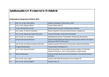 Ambasadorzy Kongresów Polskich Ambasadorzy Kongresów Polskich 2013 1. prof. zw. dr hab. Antoni Basta Katedra Ginekologii i Położnictwa, UJCM 2. prof. dr hab. Zbigniew Błocki Instytut Matematyki UJ 3. dr hab. Mirosław Boruszczak Wyższa Szkoła Turystyki i Hotelarstwa w Gdańsku 4. prof. nadzw. dr Helena Czakowska Rektor Kujawsko-Pomorskiej Szkoły Wyższej w Bydgoszczy 5. prof. dr hab. Bogusława Dobek-Ostrowska Instytut Politologii, Uniwersytet Wrocławski 6. prof. dr hab. inż. Jan Dziuban Zakład Mikroinżynierii i Fotowoltaiki, Politechnika Wrocławska 7. Grażyna Karwowska-Winiarek Polski Ośrodek Międzynarodowego Stowarzyszenia Teatrów dla Dzieci i Młodzieży ASSITEJ w Warszawie 8. prof. dr hab. inż. Bożenna Kawalec-Pietrenko Katedra Inżynierii Chemicznej i Procesowej, Politechnika Gdańska 9. dr Agata Kołodziejczyk Instytut Nauk o Środowisku UJ 10. prof. dr hab. Ryszard Kurzawa Klinika Alergologii i Pneumonologii Instytutu Gruźlicy i Chorób Płuc Oddział Terenowy im. Jana i Ireny Rudników w Rabce Zdroju 11. Maciej Kwiatkowski Członek zarządu Stowarzyszenia Instruktorów i Trenerów Narciarstwa SITN PZN 12. prof. dr hab. Jerzy Langer Instytut Fizyki PAN/ Wrocławskie Centrum Badań EIT 13. prof. dr hab. Andrzej Magiera Instytut Fizyki, UJ 14. prof. zw. dr hab. Ewa Oziewicz Instytut Handlu Zagranicznego, Zakład Międzynarodowych Stosunków Ekonomicznych, UG 15. dr Ryszard Piramidowicz Instytut Mikroelektroniki i Optoelektroniki, Politechnika Warszawska 16. dr hab. Piotr Przybyłowski Klinika Chirurgii Serca, Naczyń i Transplantologii, UJCM 17. prof. dr hab. inż. Wojciech Sadowski Katedra Fizyki Ciała Stałego, Politechnika Gdańska 18. prof. dr hab. Jacek Szepietowski Katedra i Klinika Dermatologii, Wenerologii i Alergologii UM we Wrocławiu 19. prof. zw. dr hab. Bogdan Szlachta Instytut Nauk Politycznych i Stosunków Międzynarodowych, UJ 20. dr hab. Jolanta Tambor Szkoła Języka i Kultury Polskiej Uniwersytetu Śląskiego 21. Lawrence Ugwu Dyrektor Nadbałtyckiego Centrum Kultury 22. prof. dr hab. Tadeusz Mieczysław Wróblewski Katedra i Klinika Chirurgii Ogólnej, Transplantacyjnej i Wątroby, Warszawski Uniwersytet Medyczny Ambasadorzy Kongresów Polskich 2012 23. 24. 25. 26. 27. 28. 29. 30. prof. dr Kazimierz Strzałka prof. Andrzej Chwalba prof. Krzysztof Zamorski prof. dr hab. Katarzyna Turnau Ewa Mańkiewicz - Cudny prof. dr hab. med. Henryk Skarżyński prof. dr hab. Roman Kaliszan prof. zw. dr hab. Bernard Franciszek Kubiak Uniwersytet Jagielloński Uniwersytet Jagielloński Uniwersytet Jagielloński Uniwersytet Jagielloński Federacja Stowarzyszeń Naukowo - Technicznych NOT Instytut Fizjologii i Patologii Słuchu Gdański Uniwersytet Medyczny Uniwersytet Gdański 31. prof. dr hab. Dariusz Rott Uniwersytet Śląski 32. 33. 34. Mateusz Kusznierewicz dr n. med. Marta Bogusz - Czerniewicz prof. nzw. dr hab. Jan Fazlagić Dwa tytuły Mistrza Świata (1998 i 2000) w klasie FINN Wielkopolskie Centrum Onkologii w Poznaniu Uniwersytet Ekonomiczny w Poznaniu, Uczelnia Vistula w Warszawie 35. dr Rafał Serafin Fundacja Partnerstwo dla Środowiska Ambasadorzy Kongresów Polskich 2011 36. 37. 38. 39. 40. 41. dr hab. inż. Piotr Augustyniak dr inż. Jacek Janiszewski prof. dr hab. med. Edward Czerwiński dr hab. Paweł Lula prof. dr hab Marian Jaskuła prof. UG dr hab. Beata Pastwa-Wojciechowska Akademia Górniczo-Hutnicza Uniwersytet Kardynała Stefana Wyszyńskiego Collegium Medicum UJ Uniwersytet Ekonomiczny w Krakowie Wydział Chemii UJ Uniwersytet Gdański 42. 43. 44. 45. 46. 47. 48. 49. dr Piotr Kuropatwiński prof. dr hab. Mirosław Patalon dr Anna Kalinowska – Żeleźnik prof. dr hab. med. Jacek Antoni Pietrzyk dr inż. Tomasz Schweitzer prof. zw. dr hab. Piotr Wilczek prof. dr hab. Ludwik Czaja dr nauk ekonomicznych Andrzej Byrt Uniwersytet Gdański Uniwersytet Gdański Uniwersytet Gdański Collegium Medicum UJ Polski Komitet Normalizacyjny Uniwersytet Warszawski , Uczelnia Vistula Uniwersytet Warszawski, Uczelnia Vistula Międzynarodowe Targi Poznańskie sp. z o.o. Ambasadorzy Kongresów Polskich 2010 50. 51. Dr Alicja Adamczak Dr Piotr Buła Urząd Patentowy RP Uniwersytet Ekonomiczny w Krakowie 52. 53. 54. 55. 56. Dr hab. med. Dariusz Dudek Prof. dr hab. Kazimierz Głowniak Prof. dr hab. Leszek Kaczmarek Dr inż. Jerzy Kicki Prof. dr n. med. Andrzej Kołodziejczyk Szpital Uniwersytecki w Krakowie Uniwersytet Medyczny w Lublinie Instytut Biologii Doświadczalnej PAN Akademia Górniczo-Hutnicza w Krakowie 4 Wojskowy Szpital Kliniczny, Dolnośląskie Centrum Medycyny Nuklearnej 57. 58. 59. 60. 61. 62. Dr hab. n. med. Joanna Łaszczyńska Prof. Jan Madey Prof. dr hab. n. med. Andrzej Milewicz Dr hab. Inż. Marek Pawełczyk Prof. dr hab. Marek Pietraszkiewicz Prof. zw. dr. hab. Emil Walenty Pływaczewski Wojskowy Instytut Medycyny Lotniczej w Warszawie Uniwersytet Warszawski Akademia Medyczna im. Piastów Śląskich we Wrocławiu Politechnika Śląska, Instytut Automatyki Instytut Chemii Fizycznej Polskiej Akademii Nauk Wydział Prawa Uniwersytetu w Białymstoku 63. 64. 65. 66. Prof. zw. dr hab. Jacek Purchla Prof. dr hab. n. med. Marek Rudnicki Dr n. med. Łukasz Wojnowski Dr. hab. Dariusz Zarzecki Uniwersytet Ekonomiczny w Krakowie Illinois Masonic Medical Center, Chicago Kujawsko –Pomorska Okręgowa Izba Lekarska w Toruniu Uniwersytet Szczeciński Ambasadorzy Kongresów Polskich 2009 67. Prof. dr hab. med. Janusz Andres Uniwersytet Jagielloński, Collegium Medicum, Katedra Anestezjologii I Intensywnej Terapii 68. Prof. dr hab. n. m. Aleksander Araszkiewicz Szpital Uniwersytecki nr 1 A. Jarusza w Bydgoszczy, Collegium Medicum w Bydgoszczy 69. Prof. dr hab. med. Jacek Bomba Uniwersytet Jagiellooski, Collegium Medicum, Katedra Psychiatrii 70. 71. Mgr Jan Pieter Brinkman Kazimierz Bryndal AXA-MAG Sp. Z o. o. Samodzielne Wojewódzkie Centrum Stomatologii 72. 73. Rafał Dutkiewicz Dr hab. inż., prof. PW Janusz Frączek Urząd Miasta Wrocławia Polite