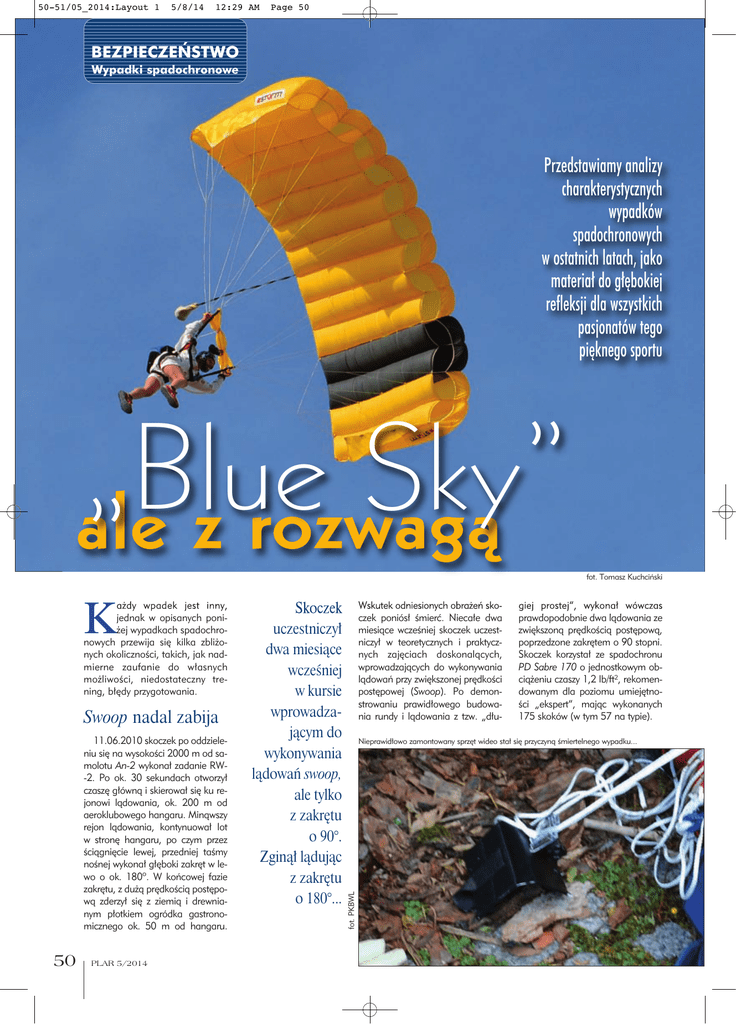 50-51/05_2014:Layout 1 5/8/14 12:29 AM Page 50 BEZPIECZEŃSTWO Wypadki spadochronowe Przedstawiamy analizy charakterystycznych wypadków spadochronowych w ostatnich latach, jako materiał do głębokiej refleksji dla wszystkich pasjonatów tego pięknego sportu „Blue Sky” ale z rozwagą fot. Tomasz Kuchciński Swoop nadal zabija 11.06.2010 skoczek po oddzieleniu się na wysokości 2000 m od samolotu An-2 wykonał zadanie RW-2. Po ok. 30 sekundach otworzył czaszę główną i skierował się ku rejonowi lądowania, ok. 200 m od aeroklubowego hangaru. Minąwszy rejon lądowania, kontynuował lot w stronę hangaru, po czym przez ściągnięcie lewej, przedniej taśmy nośnej wykonał głęboki zakręt w lewo o ok. 180º. W końcowej fazie zakrętu, z dużą prędkością postępową zderzył się z ziemią i drewnianym płotkiem ogródka gastronomicznego ok. 50 m od hangaru. 50 PLAR 5/2014 Skoczek uczestniczył dwa miesiące wcześniej w kursie wprowadzającym do wykonywania lądowań swoop, ale tylko z zakrętu o 90°. Zginął lądując z zakrętu o 180°... Wskutek odniesionych obrażeń skoczek poniósł śmierć. Niecałe dwa miesiące wcześniej skoczek uczestniczył w teoretycznych i praktycznych zajęciach doskonalących, wprowadzających do wykonywania lądowań przy zwiększonej prędkości postępowej (Swoop). Po demonstrowaniu prawidłowego budowania rundy i lądowania z tzw. „dłu- giej prostej”, wykonał wówczas prawdopodobnie dwa lądowania ze zwiększoną prędkością postępową, poprzedzone zakrętem o 90 stopni. Skoczek korzystał ze spadochronu PD Sabre 170 o jednostkowym obciążeniu czaszy 1,2 lb/ft², rekomendowanym dla poziomu umiejętności „ekspert”, mając wykonanych 175 skoków (w tym 57 na typie). Nieprawidłowo zamontowany sprzęt wideo stał się przyczyną śmiertelnego wypadku... fot. PKBWL K ażdy wpadek jest inny, jednak w opisanych poniżej wypadkach spadochronowych przewija się kilka zbliżonych okoliczności, takich, jak nadmierne zaufanie do własnych możliwości, niedostateczny trening, błędy przygotowania. 5/8/14 12:30 AM Według ustaleń PKBWL, przyczynami wypadku były: – niewłaściwe rozplanowanie podejścia do lądowania, co doprowadziło do lotu na małej wysokości i w pobliżu przeszkód terenowych, – wykonanie zakrętu do lądowania na zbyt małej wysokości, czego efektem było zderzenie skoczka z ziemią i ogrodzeniem przy dużej prędkości postępowej. Okolicznością sprzyjającą był brak odpowiednich umiejętności niezbędnych do zastosowanej przez skoczka techniki lądowania. Wingsuit i kamera 22.07.2012 doświadczony (2340 skoków) skoczek wykonywał skok z wysokości 4000 m w kombinezonie typu wingsuit, filmując kolegów zamontowanymi na kasku kamerami. Czaszę główną otworzył na wysokości ok. 1150-1050 m, doszło jednak do skręcenia linek i spadochron zaczął wirować. Po wyczepieniu czaszy głównej system RSL (Reserve Static Line) zainicjował otwarcie czaszy zapasowej. Podczas jej otwierania, taśma łącząca pilocik z osłoną czaszy zaczepiła o elementy zamontowanego z boku kasku sprzętu wideo. Z otwartej komory pokrowca wypadła czasza zapasowa w osłonie, która została opleciona przez linki. W efekcie upadku z dużą prędkością skoczek zginął na miejscu. Jako przyczynę wypadku PKBWL określiła zablokowanie otwarcia czaszy spadochronu zapasowego o nieprawidłowo zamontowany na kasku sprzęt wideo. Wśród okoliczności sprzyjających wskazano: – niewielkie doświadczenie skoczka w skokach w kombinezonach wingsuit (łącznie 25, w tym 15 na typie), – zainicjowanie otwarcia Page 51 fot. Tomasz Burza 50-51/05_2014:Layout 1 Prawidłowo otwierająca się czasza – tego życzymy wszystkim spadochroniarzom! czaszy głównej bez zredukowania prędkości postępowej, – użycie do skoku w wingsuicie spadochronu głównego podatnego na zakłócenia otwarcia (o eliptycznym obrysie czaszy i dużym obciążeniu jednostkowym), – wykonanie skoku z zainstalowanym na kasku sprzętem wideo przy podłączonym do pracy systemie RSL, – zamontowanie na kasku sprzętu wideo w sposób sprzyjający zaczepieniu elementów spadochronu. Nawet duże doświadczenie nie zwalnia od ostrożności przy łączeniu sprzętu i wyposażenia: wingsuit, kamera, eliptyczna czasza, RSL stały się zabójczą kombinacją Troje ocalonych 18.08.2013 skoczek (w dorobku 1263 skoki, z czego ok. 200 w tandemie) wykonywał skok z pasażerem z wysokości 3000 m, filmowany przez drugiego skoczka, doświadczonego kamerzystę. Ok. 6 s po oddzieleniu się od samolotu skoczek w stabilnej pozycji wypuścił spadochron hamujący (drogue). Kamerzysta filmował tandem, spadając na tej samej wysokości. Na wys. ok. 1700 m, gdy skoczek tan- fot. PKBWL ...nie pomogło nawet zrzucenie kasku demu zasygnalizował zamiar otwarcia spadochronu, kamerzysta przyjął sylwetkę siedzącą i przemieścił się pod tandem, kontynuując filmowanie. Otwarcie czaszy głównej tandemu, zainicjowane na wys. ok. 1500 m, nie nastąpiło, więc skoczek tandemu wyczepił zamki taśm nośnych czaszy głównej i zainicjował otwarcie czaszy zapasowej. W efekcie oddzielenia spadochronu hamującego, tandem zwiększył prędkość spadania i podczas otwierania się czaszy zapasowej niemal zderzył się z kamerzystą. Napełniająca się czasza zapasowa wyhamowała tandem i na wys. ok. 1250 m doszło do zderzenia kamerzysty i skoczka tandemu... Ostatecznie jednak tandem i kamerzysta bezpiecznie wylądowali na lotnisku. PKBWL stwierdziła, że przyczynami poważnego incydentu były: – prawdopodobny błąd podczas układania spadochronu, polegający na nieprawidłowym położeniu taśmy z zamkiem trzykółkowym spadochronu hamującego, co mogło spowodować zablokowanie otwarcia czaszy głównej, – brak zachowania separacji poziomej przez kamerzystę względem tandemu, co podczas otwarcia czaszy zapasowej tandemu doprowadziło do zderzenia w powietrzu. Dy