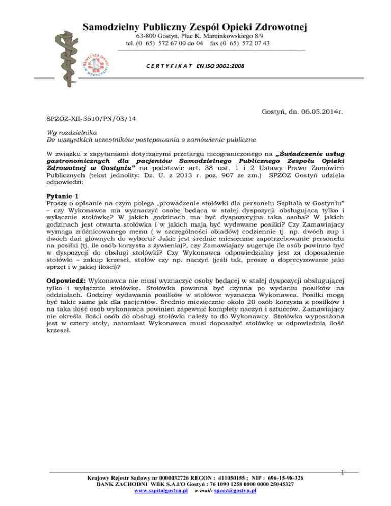 Samodzielny Publiczny Zespół Opieki Zdrowotnej 63-800 Gostyń, Plac K. Marcinkowskiego 8/9 tel. (0 65) 572 67 00 do 04 fax (0 65) 572 07 43 C E R T Y F I K A T EN ISO 9001:2008 Gostyń, dn. 06.05.2014r. SPZOZ-XII-3510/PN/03/14 Wg rozdzielnika Do wszystkich uczestników postępowania o zamówienie publiczne W związku z zapytaniami dotyczącymi przetargu nieograniczonego na „Świadczenie usług gastronomicznych dla pacjentów Samodzielnego Publicznego Zespołu Opieki Zdrowotnej w Gostyniu” na podstawie art. 38 ust. 1 i 2 Ustawy Prawo Zamówień Publicznych (tekst jednolity: Dz. U. z 2013 r. poz. 907 ze zm.) SPZOZ Gostyń udziela odpowiedzi: Pytanie 1 Proszę o opisanie na czym polega „prowadzenie stołówki dla personelu Szpitala w Gostyniu” – czy Wykonawca ma wyznaczyć osobę będącą w stałej dyspozycji obsługującą tylko i wyłącznie stołówkę? W jakich godzinach ma być dyspozycyjna taka osoba? W jakich godzinach jest otwarta stołówka i w jakich mają być wydawane posiłki? Czy Zamawiający wymaga zróżnicowanego menu ( w szczególności obiadów) codziennie tj. np. dwóch zup i dwóch dań głównych do wyboru? Jakie jest średnie miesięczne zapotrzebowanie personelu na posiłki (tj. ile osób korzysta z żywienia)?, czy Zamawiający sugeruje ile osób powinno być w dyspozycji do obsługi stołówki? Czy Wykonawca odpowiedzialny jest za doposażenie stołówki – zakup krzeseł, stołów czy np. naczyń (jeśli tak, proszę o doprecyzowanie jaki sprzęt i w jakiej ilości)? Odpowiedź: Wykonawca nie musi wyznaczyć osoby będącej w stałej dyspozycji obsługującej tylko i wyłącznie stołówkę. Stołówka powinna być czynna po wydaniu posiłków na oddziałach. Godziny wydawania posiłków w stołówce wyznacza Wykonawca. Posiłki mogą być takie same jak dla pacjentów. Średnio miesięcznie około 20 osób korzysta z posiłków i na taka ilość osób wykonawca powinien zapewnić komplety naczyń i sztućców. Zamawiający nie określa ilości osób do obsługi stołówki należy to do Wykonawcy. Stołówka wyposażona jest w cztery stoły, natomiast Wykonawca musi doposażyć stołówkę w odpowiednią ilość krzeseł. Krajowy Rejestr Sądowy nr 0000032726 REGON : 411050155 ; NIP : 696-15-98-326 BANK ZACHODNI WBK S.A.I/O Gostyń : 76 1090 1258 0000 0000 25045327 www.szpitalgostyn.pl e-mail: [email protected] 1