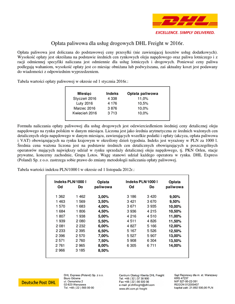 Opłata paliwowa dla usług drogowych DHL Freight w 2016r.