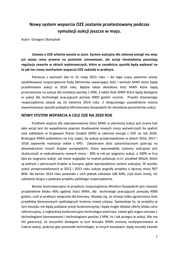 Nowy system wsparcia OZE zostanie przetestowany podczas symulacji aukcji jeszcze w maju. Autor: Grzegorz Skarżyński Ustawa o OZE właśnie weszła w życie. System aukcyjny dla zielonej energii ma więc już swoje ramy prawne na poziomie ustawowym, ale wciąż niewiadomą pozostają regulacje zawarte w aktach wykonawczych, które w zasadniczy sposób będą wpływać na to jak ten nowy mechanizm wsparcia OZE zadziała w praktyce. Pierwsza z ważnych dat to 31 maja 2015 roku – do tego czasu powinno zostać opublikowane rozporządzenie Rady Ministrów zawierające ilość i wartość MWh które będą przedmiotem aukcji w 2016 roku. Będzie także określona ilość MWh które będą przeznaczone na aukcje dla instalacji poniżej 1 MW, a także ilość MWh które będą dostępne w aukcji dla technologii pracujących poniżej 4000 godzin rocznie. Projekt stosownego rozporządzenia ukazał się 14 kwietnia 2014 roku. Z dołączonego uzasadnienia można wywnioskować sposób podejścia Ministerstwa Gospodarki do określania parametrów aukcji. NOWY SYSTEM WSPARCIA A CELE OZE NA 2020 ROK Punktem wyjścia dla zaproponowanej ilości MWh w pierwszej aukcji jest ocena luki jaka wciąż jest do wypełnienia poprzez zbudowanie nowych mocy wytwórczych by spełnić cele zakładane w Krajowym Planie Działań (KPD) w zakresie energii z OZE na rok 2020. Brakujące MWh podzielono na trzy części, by aukcje przeprowadzone w latach 2016, 2017 i 2018 zapewniły realizacje celów z KPD. Założeniem dość optymistycznym (patrząc na doświadczenia innych krajów europejskich, które wprowadziły systemy aukcyjne) jest skuteczność w wybudowaniu nowych mocy - 30% w rok po wygraniu aukcji, a 100% w trzy lata po wygraniu aukcji. Jak może wyglądać to realnie pokazuje m.in. przykład Włoch, które są jednym z pierwszych krajów w Europie, gdzie wprowadzono system aukcyjny. W wyniku aukcji przeprowadzonych w 2012 i 2013 roku aukcje wygrały projekty o łącznej mocy 907 MW. Na koniec 2014 roku powstało z nich jednak zaledwie 100 MW, czyli dużo mniej, niż założenie leżące u podstaw projektu polskiego rozporządzenia. Bardzo kontrowersyjne w projekcie rozporządzenia Ministra Gospodarki jest również przydzielenie blisko 40% ogólnej ilości MWh, dla technologii pracujących powyżej 4000 godzin, czyli w praktyce wyłącznie dla biomasy. Wydaje się, że istnieje tylko ograniczona ilość projektów biomasowych spełniających kryteria nowej ustawy. Spowoduje to, że projekty w tym koszyku nie będą poddane presji konkurencyjnej i będą mogły składać oferty blisko ceny referencyjnej, a najbardziej konkurencyjna technologia wiatrowa, nawet gdy wygra cenowo z technologiami biomasowymi i technologiami poniżej 1 MW, to i tak przegra w aukcji. Nie ma też gwarancji, że wszystkie dostępne w tym koszyku MWh zostaną rozdysponowane w trakcie aukcji, podczas gdy pozostałe technologie, w innych koszykach, będą musiały twardo 1 ze sobą konkurować. W tym kontekście zasadne wydawałoby się, aby przynajmniej w pierwszej aukcji nie stosować owego ograniczenia 4000 godzin. Istotne znaczenie będzie też miała data 31 grudnia, ponieważ do tego dnia opublikowane będą ceny referencyjne. Relatywnie wyższa cena referencyjna np. projektów biomasowych niż wiatrowych (w połączeniu z wprowadzonym progiem 4000 godzin) oznaczać będzie istotne uprzywilejowanie tej pierwszej technologii OZE. Z kolei poziom ceny referencyjnej dla fotowoltaiki będzie miał zasadnicze znaczenie dla tempa jej rozwoju. Im wyższa będzie ta cena, tym większa szansa, że projekty fotowoltaiczne będą wygrywać w kategorii projektów do 1 MW i to pomimo, że oferowane ceny będą wyższe niż dla projektów o mocy powyżej 1MW. Ustawa nałożyła także obowiązek, by 25% łącznej ilości MWh było rozdysponowane na aukcjach dotyczących projektów poniżej 1 MW. Bardzo wątpliwe, że znajdzie się tyle instalacji spełniających to kryterium. Tym bardziej, że tu też obowiązuje podział na technologie pracujące poniżej i powyżej 4000 godzin. Takie ustawienie parametrów aukcji już w pierwszym roku sprawia, że bardzo trudno jest wierzyć w zrealizowanie celu dotyczącego OZE na 2020 rok. ZAGROŻENIE UNDERBIDDINGU Poważnym problemem w systemie aukcyjnym może też być zjawisko underbiddingu, czyli składania ofert na poziomie niższym niż możliwość ich realizacji. O ile dla instalacji biomasowych (koszyk z technologiami pracującymi powyżej 4000 godzin) nie należy się spodziewać tego zjawiska, bo ilość projektów jest tu ograniczona, o tyle dla pozostałych technologii to zjawisko jest bardzo prawdopodobne, gdyż przy dużej ilości projektów dostępne ilości MWh będą relatywnie mniejsze. Na skalę problemu wskazują m.in. doświadczenia płynące z aukcji przeprowadzonych w 2015 roku w Wielkiej Brytanii. Dwa duże projekty fotowoltaiczne wycofały się tam tuż po wygraniu aukcji. Powodem były właśnie zbyt niskie ceny – niższe o ok. 60% od ofert, które były następne w kolejności. Oprócz ilości MWh istotny jest też budżet aukcji, co oznacza, że jeżeli zaoferowane ceny przekroczą średnią cenę, to pomimo że będą jeszcze niewykorzystane megawatogodziny, to nie wszystkie oferty zostaną zaakceptowane. Dla projektów o mocy powyżej 1 MW średnią cenę wyznaczono na poziomie 360 zł, a dla projektów poniżej tego progu na poziomie 470 złotych. Są to stosunkowo niskie kwoty, które mogą sprawić problemy szczególnie w tym najbardziej konkurencyjnym koszyku, czyli dla technologii powyżej 1 MW i o produkcji poniżej 4000 godzin. Skłaniać one będą do agresywnego ofertowania, co w konsekwencji może doprowadzić do ofert, których realizacja będzie pod znakiem zapytania. SCENARIUSZE AWARYJNE Możemy zatem mieć sytuację, w której albo będą oferowane zbyt niskie ceny, by projekty zostały zbudowane, bądź też przy relatywnie wyższych zaoferowanych cenach szybciej