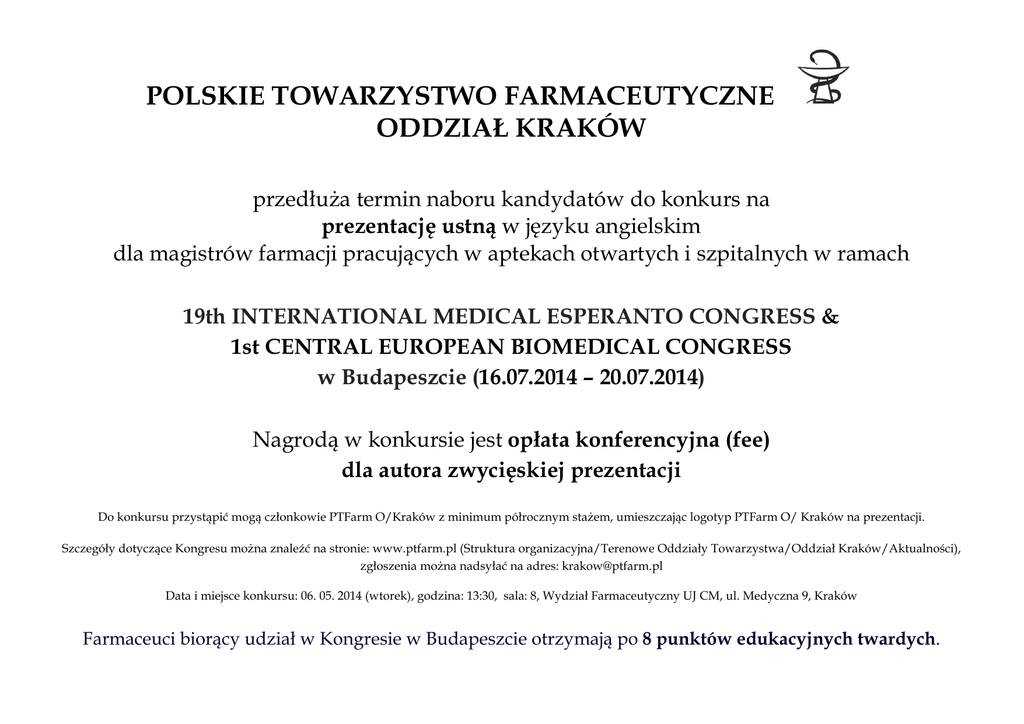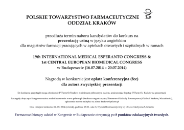 POLSKIE TOWARZYSTWO FARMACEUTYCZNE ODDZIAŁ KRAKÓW przedłuża termin naboru kandydatów do konkurs na prezentację ustną w języku angielskim dla magistrów farmacji pracujących w aptekach otwartych i szpitalnych w ramach 19th INTERNATIONAL MEDICAL ESPERANTO CONGRESS & 1st CENTRAL EUROPEAN BIOMEDICAL CONGRESS w Budapeszcie (16.07.2014 – 20.07.2014) Nagrodą w konkursie jest opłata konferencyjna (fee) dla autora zwycięskiej prezentacji Do konkursu przystąpić mogą członkowie PTFarm O/Kraków z minimum półrocznym stażem, umieszczając logotyp PTFarm O/ Kraków na prezentacji. Szczegóły dotyczące Kongresu można znaleźć na stronie: www.ptfarm.pl (Struktura organizacyjna/Terenowe Oddziały Towarzystwa/Oddział Kraków/Aktualności), zgłoszenia można nadsyłać na adres: [email protected] Data i miejsce konkursu: 06. 05. 2014 (wtorek), godzina: 13:30, sala: 8, Wydział Farmaceutyczny UJ CM, ul. Medyczna 9, Kraków Farmaceuci biorący udział w Kongresie w Budapeszcie otrzymają po 8 punktów edukacyjnych twardych.