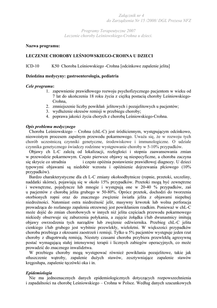 Załącznik nr 4 do Zarządzenia Nr 15 /2008/ DGL Prezesa NFZ Programy Terapeutyczne 2007 Leczenie choroby Leśniowskiego-Crohna u dzieci. Nazwa programu: LECZENIE CHOROBY LEŚNIOWSKIEGO-CROHNA U DZIECI ICD-10 K50 Choroba Leśniowskiego -Crohna [odcinkowe zapalenie jelita] Dziedzina medycyny: gastroenterologia, pediatria Cele programu: 1. zapewnienie prawidłowego rozwoju psychofizycznego pacjentom w wieku od 7 lat do ukończenia 18 roku życia z ciężką postacią choroby LeśniowskiegoCrohna, 2. zmniejszenie liczby powikłań jelitowych i pozajelitowych u pacjentów; 3. wydłużenie okresów remisji w przebiegu choroby; 4. poprawa jakości życia chorych z chorobą Leśniowskiego-Crohna. Opis problemu medycznego Choroba Leśniowskiego – Crohna (chL-C) jest śródściennym, występującym odcinkowo, nieswoistym procesem zapalnym przewodu pokarmowego. Uważa się, że w rozwoju tych chorób uczestniczą czynniki genetyczne, środowiskowe i immunologiczne. O udziale czynnika genetycznego świadczy rodzinne występowanie choroby w 5-10% przypadków. Objawy ch L-C zależą od lokalizacji, rozległości i stopnia zaawansowania zmian w przewodzie pokarmowym. Często pierwsze objawy są niespecyficzne, a choroba zaczyna się skrycie co utrudnia i często opóźnia postawienie prawidłowej diagnozy. U dzieci typowymi objawami są niedobór wzrostu i opóźnienie dojrzewania płciowego (10% przypadków). Bardzo charakterystyczne dla ch L-C zmiany okołoodbytnicze (ropnie, przetoki, szczeliny, naddatki skórne), pojawiają się w około 15% przypadków. Przetoki mogą być zewnętrzne i wewnętrzne, pojedyncze lub mnogie i występują one w 20-40 % przypadków, zaś u pacjentów z chorobą jelita grubego w 50-80%. Oprócz przetok, dochodzi do tworzenia otorbionych ropni oraz do znacznego zwężenie światła jelita z objawami niepełnej niedrożności. Natomiast ostra niedrożność jelit, masywny krwotok lub wolna perforacja prowadząca do rozlanego zapalenia otrzewnej jest powikłaniem rzadkim. Ponieważ w chL-C może dojść do zmian chorobowych w innych niż jelita częściach przewodu pokarmowego niekiedy obserwuje się zaburzenia połykania, a zajęcie żołądka i/lub dwunastnicy imitują objawy owrzodzenia tych narządów lub zwężenie odźwiernika. Przebieg chL-C jelita cienkiego i/lub grubego jest wybitnie przewlekły, wieloletni. W większości przypadków choroba przebiega z okresami zaostrzeń i remisji. Tylko u 5% pacjentów występuje jeden rzut choroby z długotrwałą remisją. Niestety czasami choroba przybiera przewlekłą agresywną postać wymagającą stałej intensywnej terapii i licznych zabiegów operacyjnych, co może prowadzić do znacznego inwalidztwa. W przebiegu choroby mogą występować również powikłania pozajelitowe, takie jak stłuszczenie wątroby, zapalenie dużych stawów, zesztywniające zapalenie stawów kręgosłupa, zapalenie tęczówki oka i in. Epidemiologia Nie ma jednoznacznych danych epidemiologicznych dotyczących rozpowszechnienia i zapadalności na chorobę Leśniowskiego – Crohna w Polsce. Według danych szacunkowych Załącznik nr 4 do Zarządzenia Nr 15 /2008/ DGL Prezesa NFZ Programy Terapeutyczne 2007 Leczenie choroby Leśniowskiego-Crohna u dzieci. liczba chorych na początku 2007 roku wynosiła około 5 tys. U około 25% pacjentów choroba diagnozowana jest przed 18 rokiem życia, również wśród dzieci w wieku poniżej 2 lat. W badaniach epidemiologicznych obserwuje się wzrost zapadalności na chorobę Leśniowskiego – Crohna. Największą zapadalność na chorobę Leśniowskiego – Crohna stwierdza się między 20 a 30 rokiem życia. Średnia zapadalność jest szacowana na 3/100 000 osób na rok. Opis programu Program zakłada leczenie dzieci w wieku od 7 lat do ukończenia 18 roku życia, chorych z powodu ch L-C o ciężkim przebiegu (PCDAI>51 pkt), którzy nie wykazali odpowiedzi na pełny i odpowiedni kurs leczenia kortykosteroidem i/lub lekiem immunosupresyjnym albo nie tolerują takiego leczenia lub jest ono u nich przeciwwskazane ze względów medycznych, a u których stwierdzono wysokie stężenie biochemicznych markerów stanu zapalnego ( jak np. białko C-reaktywne) i wysokie OB. Opis działania leku: TNFα (TNFα – tumor necrosis factor), odgrywa istotną rolę w patomechanizmie rozwoju stanu zapalnego w przebiegu choroby Leśniowskiego - Crohna. Neutralizacja jego działania pozwala na skuteczną kontrolę procesu zapalnego. Infliksymab jest chimerycznym przeciwciałem monoklonalnym, które poprzez przyłączenie się do cząsteczki czynnika martwicy nowotworów alfa neutralizuje jego działanie. Schemat podawania leku: Infliksymab należy podać w dawce 5 mg/kg mc w infuzji dożylnej trwającej ponad 2 godziny. Następne dawki należy podać po 14 i 42 dniach od pierwszej infuzji. Kwalifikacja chorych do programu wymaga wcześniejszego wykonania następujących badań laboratoryjnych: - morfologia krwi, Ht, -OB, - AlAT i AspAT, - poziom kreatyniny, - poziom elektrolitów, - CRP, -antygen Hbs, - przeciwciała anty-HCV, - antygen HIV. Ponadto wymagane jest wykonanie: - EKG, - RTG klatki piersiowej, - badań endoskopowych, - obliczenia wskaźnika PCDAI. Kryteria włączenia do programu Do programu mogą zostać włączeni chorzy w wieku od 7 lat do momentu ukończenia 18 roku życia, z ciężką postacią chL-C (PCDAI> 51 pkt), u których brak jest lub nastąpiła utrata odpowiedzi na dotychczas stosowane leczenie (za wyjątkiem leczenia biologicznego), Załącznik nr 4 do Zarządzenia Nr 15 /2008/ DGL Prezesa NFZ Programy Terapeutyczne 2007 Leczenie choroby Leśniowskiego-Crohna u dzieci. a u których występuje wysokie stężenie markerów stanu zapalnego jak np. CRP, oraz wysoki OB. U chorych tych mogą występować czynne przetoki. W przypadku pacjentek dojrzałych płciowo, prowadzących aktywne życie seksualne musi być wyrażona zgoda na świadomą kontrolę urodzeń w okresie do 6 miesięcy po zastosowa