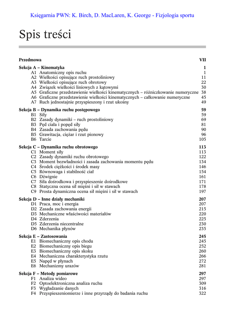 Księgarnia PWN: K. Birch, D. MacLaren, K. George - Fizjologia sportu Spis treści Przedmowa Sekcja A – Kinematyka A1 Anatomiczny opis ruchu A2 Wielkości opisujące ruch prostoliniowy A3 Wielkości opisujące ruch obrotowy A4 Związek wielkości liniowych z kątowymi A5 Graficzne przedstawienie wielkości kinematycznych – różniczkowanie numeryczne A6 Graficzne przedstawienie wielkości kinematycznych – całkowanie numeryczne A7 Ruch jednostajnie przyspieszony i rzut ukośny VII 1 1 11 22 30 38 45 49 Sekcja B – Dynamika ruchu postępowego B1 Siły B2 Zasady dynamiki – ruch prostoliniowy B3 Pęd ciała i popęd siły B4 Zasada zachowania pędu B5 Grawitacja, ciężar i rzut pionowy B6 Tarcie 59 59 69 81 90 96 105 Sekcja C – Dynamika ruchu obrotowego C1 Moment siły C2 Zasady dynamiki ruchu obrotowego C3 Moment bezwładności i zasada zachowania momentu pędu C4 Środek ciężkości i środek masy C5 Równowaga i stabilność ciał C6 Dźwignie C7 Siła dośrodkowa i przyspieszenie dośrodkowe C8 Statyczna ocena sił mięśni i sił w stawach C9 Prosta dynamiczna ocena sił mięśni i sił w stawach 113 113 122 134 146 154 161 171 178 197 Sekcja D – Inne działy mechaniki D1 Praca, moc i energia D2 Zasada zachowania energii D3 Mechaniczne właściwości materiałów D4 Zderzenia D5 Zderzenia niecentralne D6 Mechanika płynów 207 207 215 220 225 230 235 Sekcja E – Zastosowania E1 Biomechaniczny opis chodu E2 Biomechaniczny opis biegu E3 Biomechaniczny opis skoku E4 Mechaniczna charakterystyka rzutu E5 Napęd w płynach E6 Mechanizmy urazów 245 245 252 260 266 272 281 Sekcja F – Metody pomiarowe F1 Analiza wideo F2 Optoelektroniczna analiza ruchu F3 Wygładzanie danych F4 Przyspieszeniomierze i inne przyrządy do badania ruchu 297 297 309 316 322 VI Spis treści F5 F6 F7 F8 F9 Dodatki I II III IV Indeks Platformy dynamometryczne Pomiary ciśnienia Elektromiografia (EMG) Dynamometria izokinetyczna Antropometria, biomechanika i projektowanie sprzętu sportowego Diagramy sił Kryterium próbkowania Powtórka z matematyki: przekształcenia algebraiczne Powtórka z matematyki: trygonometria 330 339 344 355 361 373 373 375 379 386 389