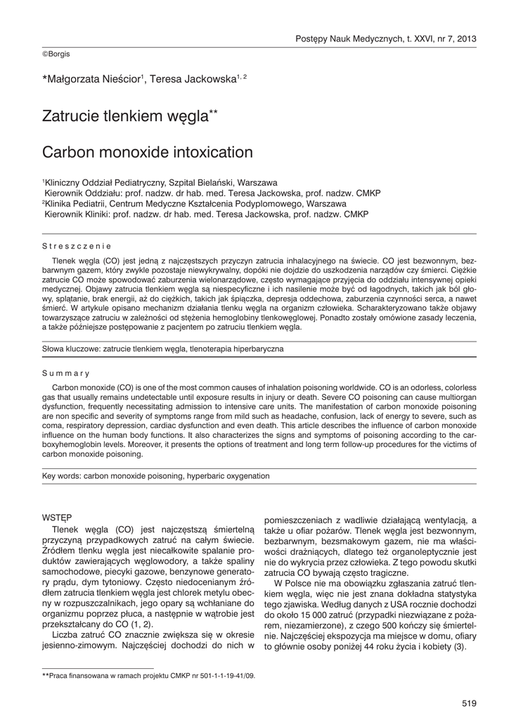 Postępy Nauk Medycznych, t. XXVI, nr 7, 2013 ©Borgis *Małgorzata Nieścior1, Teresa Jackowska1, 2 Zatrucie tlenkiem węgla** Carbon monoxide intoxication Kliniczny Oddział Pediatryczny, Szpital Bielański, Warszawa Kierownik Oddziału: prof. nadzw. dr hab. med. Teresa Jackowska, prof. nadzw. CMKP 2 Klinika Pediatrii, Centrum Medyczne Kształcenia Podyplomowego, Warszawa Kierownik Kliniki: prof. nadzw. dr hab. med. Teresa Jackowska, prof. nadzw. CMKP 1 Streszczenie Tlenek węgla (CO) jest jedną z najczęstszych przyczyn zatrucia inhalacyjnego na świecie. CO jest bezwonnym, bezbarwnym gazem, który zwykle pozostaje niewykrywalny, dopóki nie dojdzie do uszkodzenia narządów czy śmierci. Ciężkie zatrucie CO może spowodować zaburzenia wielonarządowe, często wymagające przyjęcia do oddziału intensywnej opieki medycznej. Objawy zatrucia tlenkiem węgla są niespecyficzne i ich nasilenie może być od łagodnych, takich jak ból głowy, splątanie, brak energii, aż do ciężkich, takich jak śpiączka, depresja oddechowa, zaburzenia czynności serca, a nawet śmierć. W artykule opisano mechanizm działania tlenku węgla na organizm człowieka. Scharakteryzowano także objawy towarzyszące zatruciu w zależności od stężenia hemoglobiny tlenkowęglowej. Ponadto zostały omówione zasady leczenia, a także późniejsze postępowanie z pacjentem po zatruciu tlenkiem węgla. Słowa kluczowe: zatrucie tlenkiem węgla, tlenoterapia hiperbaryczna Summary Carbon monoxide (CO) is one of the most common causes of inhalation poisoning worldwide. CO is an odorless, colorless gas that usually remains undetectable until exposure results in injury or death. Severe CO poisoning can cause multiorgan dysfunction, frequently necessitating admission to intensive care units. The manifestation of carbon monoxide poisoning are non specific and severity of symptoms range from mild such as headache, confusion, lack of energy to severe, such as coma, respiratory depression, cardiac dysfunction and even death. This article describes the influence of carbon monoxide influence on the human body functions. It also characterizes the signs and symptoms of poisoning according to the carboxyhemoglobin levels. Moreover, it presents the options of treatment and long term follow-up procedures for the victims of carbon monoxide poisoning. Key words: carbon monoxide poisoning, hyperbaric oxygenation Wstęp Tlenek węgla (CO) jest najczęstszą śmiertelną przyczyną przypadkowych zatruć na całym świecie. Źródłem tlenku węgla jest niecałkowite spalanie produktów zawierających węglowodory, a także spaliny samochodowe, piecyki gazowe, benzynowe generatory prądu, dym tytoniowy. Często niedocenianym źródłem zatrucia tlenkiem węgla jest chlorek metylu obecny w rozpuszczalnikach, jego opary są wchłaniane do organizmu poprzez płuca, a następnie w wątrobie jest przekształcany do CO (1, 2). Liczba zatruć CO znacznie zwiększa się w okresie jesienno-zimowym. Najczęściej dochodzi do nich w pomieszczeniach z wadliwie działającą wentylacją, a także u ofiar pożarów. Tlenek węgla jest bezwonnym, bezbarwnym, bezsmakowym gazem, nie ma właściwości drażniących, dlatego też organoleptycznie jest nie do wykrycia przez człowieka. Z tego powodu skutki zatrucia CO bywają często tragiczne. W Polsce nie ma obowiązku zgłaszania zatruć tlenkiem węgla, więc nie jest znana dokładna statystyka tego zjawiska. Według danych z USA rocznie dochodzi do około 15 000 zatruć (przypadki niezwiązane z pożarem, niezamierzone), z czego 500 kończy się śmiertelnie. Najczęściej ekspozycja ma miejsce w domu, ofiary to głównie osoby poniżej 44 roku życia i kobiety (3). **Praca finansowana w ramach projektu CMKP nr 501-1-1-19-41/09. 519 Małgorzata Nieścior, Teresa Jackowska Patofizjologia Objawy zatrucia Tlenek węgla wnika do organizmu poprzez drogi oddechowe, a w mniejszej ilości przez skórę i błony śluzowe, jednak w przebiegu intoksykacji nie ma to istotnego znaczenia. Z organizmu wydalany jest przez układ oddechowy jako tlenek węgla, a jedynie w 1% jest utleniany do dwutlenku węgla (4). We krwi CO łączy się z hemoglobiną (Hb), tworząc karboksyhemoglobinę (COHb). Szybkość wiązania się CO z hemoglobiną w początkowym okresie ekspozycji jest duża, aż do momentu osiągnięcia równowagi między stężeniem COHb we krwi a CO w powietrzu. Powinowactwo tlenku węgla do hemoglobiny jest 200-250 razy większe niż tlenu. Dysocjacja karboksyhemoglobiny następuje 10 razy wolniej niż oksyhemoglobiny, w ten sposób CO blokuje hemoglobinę dla tlenu. Dodatkowo tlenek węgla powoduje przesunięcie krzywej dysocjacji hemoglobiny w lewo, zwiększając powinowactwo hemoglobiny do tlenu (efekt Haldane’a), co prowadzi do anoksji w tkankach (5, 6). U osób z ciężką niedokrwistością (Hb 6 g/dl) komórki są zaopatrywane w większą ilość tlenu niż u osób, u których stężenie hemoglobiny jest równe 12 g/dl, z czego 50% hemoglobiny jest zablokowane przez CO. Powyższy przykład dowodzi tego, że tlenek węgla upośledza właściwe zaopatrzenie tkanek w tlen nie tylko bezpośrednio poprzez blokadę hemoglobiny, ale także pośrednio poprzez przesunięcie krzywej dysocjacji hemoglobiny w lewo, co stabilizuje wiązanie hemoglobiny z tlenem. Po rozpadzie wiązania hemoglobiny z tlenkiem węgla hemoglobina nadal jest zdolna do wiązania tlenu (6). Po wniknięciu do krwi około 15% tlenku węgla dyfunduje do tkanek i wiąże się z mioglobiną i oksydazą cytochromu C, upośledzając w ten sposób procesy wewnątrzkomórkowe, co dodatkowo pogłębia hipoksję tkankową. Z mioglobiną CO wiąże się około 40 razy silniej niż tlen (5, 6). Noworodki ze względu na obecność w ich krwi hemoglobiny płodowej, która wiąże dwa razy więcej tlenku węgla niż zwykła hemoglobina, są bardziej wrażliwe na działanie CO. Dzieci są bardziej wrażliwe na działanie tlenku węgla także 