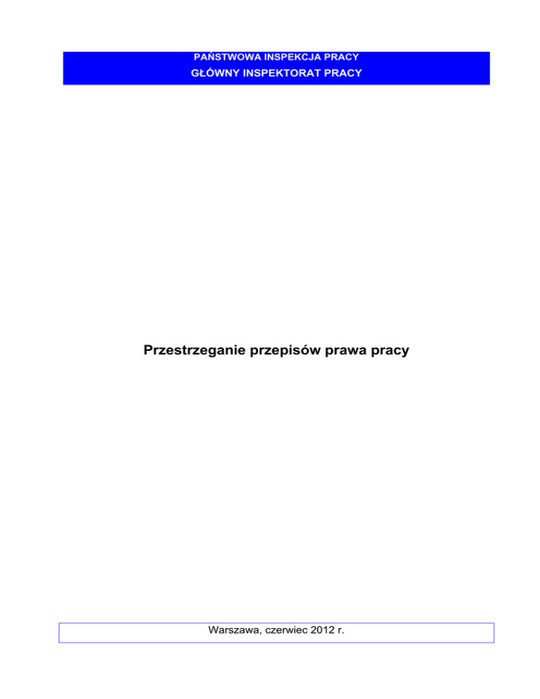 PAŃSTWOWA INSPEKCJA PRACY GŁÓWNY INSPEKTORAT PRACY Przestrzeganie przepisów prawa pracy Warszawa, czerwiec 2012 r. Prawo pracy to ogół norm prawnych, które kompleksowo regulują zasady postępowania w zakresie stosunku pracy oraz wynikających z tego tytułu praw i obowiązków pracowników, jak również pracodawców. Normy te zawarte są w polskim ustawodawstwie oraz w aktach normatywnych prawa międzynarodowego i Unii Europejskiej. Podstawowym źródłem polskiego prawa pracy jest Kodeks pracy. Do podstawowych zagadnień uregulowanych w tym akcie prawnym należy: sformułowanie podstawowych zasad prawa pracy, ustanowienie podstawowych instytucji prawa pracy, określenie praw i obowiązków pracodawców oraz pracowników w zakresie czasu pracy, prawa do odpoczynku, uprawnień związanych z rodzicielstwem oraz związanych z bezpieczeństwem i higieną pracy, wyznaczenie zakresu i sposobu tworzenia niektórych aktów normatywnych w zakresie zakładowego prawa pracy. Unormowania określone w Kodeksie pracy wyznaczają podstawowy zakres i poziom uprawnień oraz świadczeń pracowniczych mających powszechny charakter, co nie oznacza, że pracodawcy nie mogą zaproponować pracownikom korzystniejszych rozwiązań ustalonych w układzie zbiorowym pracy lub umowie o pracę. Szereg regulacji z zakresu prawa pracy zawierają też tzw. pragmatyki służbowe oraz inne ustawy i rozporządzenia. Zgodnie z ustawą o Państwowej Inspekcji Pracy, podstawowe działania Urzędu mają charakter kontrolno - nadzorczy. W obszarze prawnej ochrony pracy działania te skoncentrowane są na zagadnieniach mających największy wpływ na funkcjonowanie społeczeństwa (jak np. kwestie dotyczące wynagrodzeń za pracę) bądź oddziałujących pośrednio na sferę bezpieczeństwa pracy (jak problematyka czasu pracy), zaś w zakresie bezpieczeństwa i ochrony zdrowia ludzi - na branżach i zakładach pracy, w których występuje – zdiagnozowane wcześniej – największe nasilenie zagrożeń zawodowych. Realizując zadania nałożone na Państwową Inspekcję Pracy, inspektorzy pracy prowadzą co roku ok. 90 tys. kontroli. Oprócz kontroli planowych, dużą grupę kontroli stanowią kontrole związane z badaniem zasadności skarg na działania pracodawców, jak również dotyczące badania wypadków przy pracy. Zakres przedmiotowy kontroli obejmuje szerokie spektrum zagadnień z zakresu prawnej ochrony pracy oraz technicznego bezpieczeństwa pracy (adekwatnie do kontrolowanej branży i zidentyfikowanych w niej problemów) oraz kwestie legalności zatrudnienia (w tym cudzoziemców). 2 W 2011 r. inspektorzy pracy przeprowadzili 90,6 tys. kontroli. Łącznie objęto kontrolami 68,5 tys. pracodawców i innych podmiotów, na rzecz których świadczyło pracę ponad 3,9 mln osób. Blisko 67,5 tys. kontroli obejmowało zagadnienia związane z prawną ochroną pracy, zagadnienia bezpieczeństwa i higieny pracy analizowano w prawie 63,5 tys. kontroli. Liczba kontroli bezpieczeństwo i higiena OIP prawna ochrona pracy pracy OIP Białystok 2 442 3 333 OIP Bydgoszcz 3 562 3 594 OIP Gdańsk 4 204 4 124 OIP Katowice 9 188 6 986 OIP Kielce 2 477 1 880 OIP Kraków 3 990 3 721 OIP Lublin 2 925 3 360 OIP Łódź 6 044 5 726 OIP Olsztyn 2 752 2 559 OIP Opole 2 223 2 488 OIP Poznań 6 706 6 198 OIP Rzeszów 3 618 3 699 OIP Szczecin 2 492 2 936 OIP Warszawa 6 380 4 766 OIP Wrocław 6 300 6 200 OIP Zielona Góra 2 171 1 880 OGÓŁEM 67474 63450 Działalność kontrolna zintensyfikowana została w sektorach gospodarki, w których istniały największe zagrożenia zawodowe oraz, w których, na podstawie wyników kontroli z lat ubiegłych, prognozowano dużą skalę nieprawidłowości. Ponadto dobór podmiotów do kontroli wynikał z kierowanych do Urzędu skarg oraz wniosków, jak również doniesień medialnych o szczególnie rażących nieprawidłowościach. Dział gospodarki wg PKD Odsetek przeprowadzonych kontroli Prawna ochrona pracy BHP Rolnictwo i leśnictwo 1,9% 2,1% Przetwórstwo przemysłowe 21% 23,0% Dostawa wody 1,3% 1,8% Budownictwo 14% 25,0% Handel i naprawy 29% 24,5% 3 Transporrt i gospodarka a magazyn nowa 5,6% % 3,5% omiczne gastrono 4,6% % 3,4% Działalno ość profesjona alna 2,4% % 1,9% Usługi ad dministrowania a 4,2% % 2,6% Edukacja a 3,6% % 2,3% społeczn na 2,7% % 1,9% Pozostałła działalność usługowa 2,7% % 2,0% Pozostałłe 7,0% % 6,0% Zakwaterowanie i usłu ugi Opieka zzdrowotna i po omoc W przeważającej częś ści kontrole prowadzon ne były w po odmiotach nnależących do sektora a prywatn nego. Praco odawcy należący do sektora pu ublicznego (w większoości samorrządowego)) stanowiili niespełna a 10%. Przep prowadzone kontrole z zzakresu praw wnej ochrony y pracy miotu wgg formy włassności podm sekto or prywattny 90,4% % nieokkreślona właasność 00,2% sektor publiczny 9,4% 4 P Przeprowadzzone kontrolle z zakresu bhp wg form my własnoścci podmiotu sektor pryywatny 91,5% % nieokkreślona właasność 00,4% sektoor publiczny 8,1% N Najwięcej kontroli prrzeprowadz ono w tzw w. mikroprzedsiębiorsstwach, tj. zakładach h zatrudniających do o 9 pracown ników. Przeprowadzo one kontrolee z zakresu prawnej ochrony pracy wg wiel kosci podmiiotu do 9 zatrudnionych % 55% 10 0‐49 zatrud dnionych 28% 2 50‐‐249 zatrud nionych 250 i powyżej 122% zattrudnionych 5% 5 Przeprowad dzone kontrrole z zakresu u bhp wg wielkosci ppodmiotu do 9 zatrudnionych 55% % 10 0‐49 zatrud dnionych 28% 2 50‐‐249 zatrud nionych 250 i powyżej 122% zattrudnionych 5% N Należy zauważyć, że wydaniem środków prrawnych (na akazów, wnniosków wy ystąpień lub b poleceń ń) zakończyyło się 72,88 8% kontroli.. 6 I. Przestrzegania przepisów z zakresu prawnej ochrony pracy Stosunek pracy Stosunek pracy oraz prawa i obowiązki wynikające z niego dla pracodawcy i pracownika regulowane są przede wszystkim przez przepisy Działu II Kodeksu pracy, ale także przez szereg przepisów szczególnych normuj