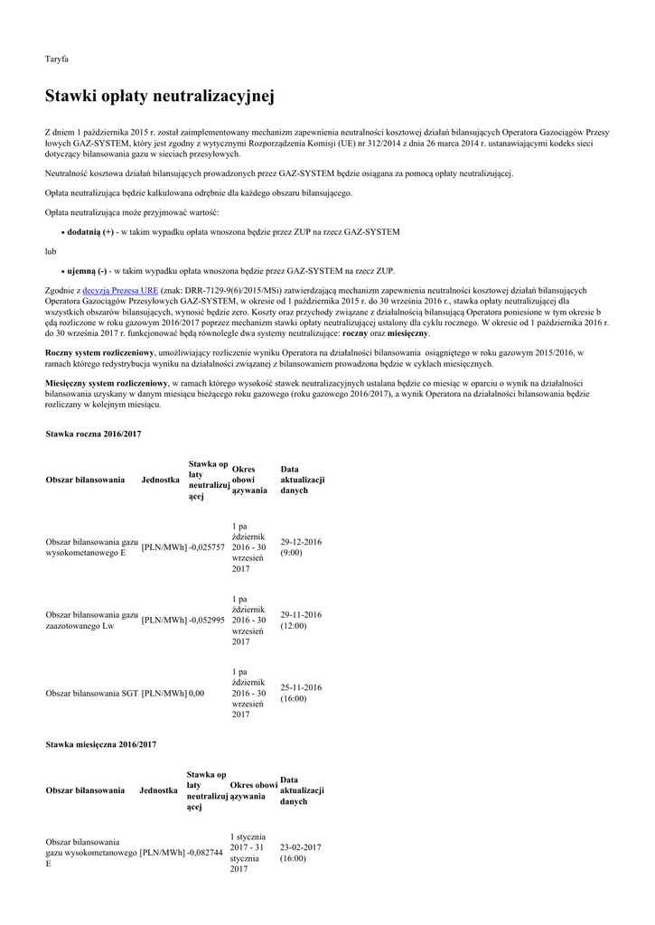 Taryfa Stawki opłaty neutralizacyjnej Z dniem 1 października 2015 r. został zaimplementowany mechanizm zapewnienia neutralności kosztowej działań bilansujących Operatora Gazociągów Przesy łowych GAZ-SYSTEM, który jest zgodny z wytycznymi Rozporządzenia Komisji (UE) nr 312/2014 z dnia 26 marca 2014 r. ustanawiającymi kodeks sieci dotyczący bilansowania gazu w sieciach przesyłowych. Neutralność kosztowa działań bilansujących prowadzonych przez GAZ-SYSTEM będzie osiągana za pomocą opłaty neutralizującej. Opłata neutralizująca będzie kalkulowana odrębnie dla każdego obszaru bilansującego. Opłata neutralizująca może przyjmować wartość: dodatnią (+) - w takim wypadku opłata wnoszona będzie przez ZUP na rzecz GAZ-SYSTEM lub ujemną (-) - w takim wypadku opłata wnoszona będzie przez GAZ-SYSTEM na rzecz ZUP. Zgodnie z decyzją Prezesa URE (znak: DRR-7129-9(6)/2015/MSi) zatwierdzającą mechanizm zapewnienia neutralności kosztowej działań bilansujących Operatora Gazociągów Przesyłowych GAZ-SYSTEM, w okresie od 1 października 2015 r. do 30 września 2016 r., stawka opłaty neutralizującej dla wszystkich obszarów bilansujących, wynosić będzie zero. Koszty oraz przychody związane z działalnością bilansującą Operatora poniesione w tym okresie b ędą rozliczone w roku gazowym 2016/2017 poprzez mechanizm stawki opłaty neutralizującej ustalony dla cyklu rocznego. W okresie od 1 października 2016 r. do 30 września 2017 r. funkcjonować będą równolegle dwa systemy neutralizujące: roczny oraz miesięczny. Roczny system rozliczeniowy, umożliwiający rozliczenie wyniku Operatora na działalności bilansowania osiągniętego w roku gazowym 2015/2016, w ramach którego redystrybucja wyniku na działalności związanej z bilansowaniem prowadzona będzie w cyklach miesięcznych. Miesięczny system rozliczeniowy, w ramach którego wysokość stawek neutralizacyjnych ustalana będzie co miesiąc w oparciu o wynik na działalności bilansowania uzyskany w danym miesiącu bieżącego roku gazowego (roku gazowego 2016/2017), a wynik Operatora na działalności bilansowania będzie rozliczany w kolejnym miesiącu. Stawka roczna 2016/2017 Obszar bilansowania Jednostka Stawka op Okres łaty obowi neutralizuj ązywania ącej Data aktualizacji danych 1 pa ździernik Obszar bilansowania gazu [PLN/MWh] -0,025757 2016 - 30 wysokometanowego E wrzesień 2017 29-12-2016 (9:00) 1 pa ździernik Obszar bilansowania gazu [PLN/MWh] -0,052995 2016 - 30 zaazotowanego Lw wrzesień 2017 29-11-2016 (12:00) 1 pa ździernik 2016 - 30 wrzesień 2017 25-11-2016 (16:00) Obszar bilansowania SGT [PLN/MWh] 0,00 Stawka miesięczna 2016/2017 Obszar bilansowania Jednostka Stawka op Data łaty Okres obowi aktualizacji neutralizuj ązywania danych ącej 1 stycznia Obszar bilansowania 2017 - 31 gazu wysokometanowego [PLN/MWh] -0,082744 stycznia E 2017 23-02-2017 (16:00) 1 stycznia Obszar bilansowania 2017 - 31 [PLN/MWh] -0,100133 gazu zaazotowanego Lw stycznia 2017 23-02-2017 (16:00) 1 stycznia 2017 - 31 stycznia 2017 23-02-2017 (16:00) Obszar bilansowania SGT [PLN/MWh] 0,00 Obszar bilansowania 1 grudnia 26-01-2017 gazu wysokometanowego [PLN/MWh] -0,029217 2016 - 31 (15:00) E grudnia 2016 Obszar bilansowania [PLN/MWh] 1,204877 gazu zaazotowanego Lw 1 grudnia 26-01-2017 2016 - 31 (15:00) grudnia 2016 Obszar bilansowania SGT 1 grudnia 26-01-2017 2016 - 31 (15:00) grudnia 2016 [PLN/MWh] 0,00 Obszar bilansowania gazu wysokometanowego [PLN/MWh] 0,232036 E 1 listopad 23-12-2016 2016 - 30 (13:00) listopad 2016 1 listopad Obszar bilansowania 23-12-2016 [PLN/MWh] -0,989343 2016 - 30 gazu zaazotowanego Lw (13:00) listopad 2016 Obszar bilansowania SGT [PLN/MWh] 0,00 1 listopad 23-12-2016 2016 - 30 (13:00) listopad 2016 1 październik Obszar bilansowania 2016 - 31 pa 30-11-2016 gazu wysokometanowego [PLN/MWh] -0,332738 ździernik (9:20) E 2016 1 październik Obszar bilansowania 2016 - 31 pa 29-11-2016 [PLN/MWh] -0,463624 gazu zaazotowanego Lw ździernik (12:00) 2016 Obszar bilansowania SGT [PLN/MWh] 0,00 1 październik 2016 - 31 pa 25-11-2016 ździernik (16:00) 2016 Całość wyniku Operatora na działalności bilansowania będzie kumulowana na rachunku Operatora i zostanie rozliczona z ZUP w cyklach miesięcznych w kolejnym roku gazowym.