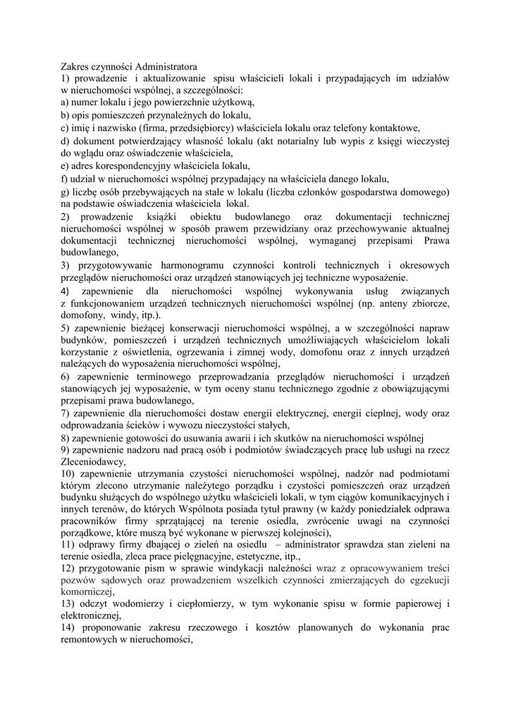 Zakres czynności Administratora 1) prowadzenie i aktualizowanie spisu właścicieli lokali i przypadających im udziałów w nieruchomości wspólnej, a szczególności: a) numer lokalu i jego powierzchnie użytkową, b) opis pomieszczeń przynależnych do lokalu, c) imię i nazwisko (firma, przedsiębiorcy) właściciela lokalu oraz telefony kontaktowe, d) dokument potwierdzający własność lokalu (akt notarialny lub wypis z księgi wieczystej do wglądu oraz oświadczenie właściciela, e) adres korespondencyjny właściciela lokalu, f) udział w nieruchomości wspólnej przypadający na właściciela danego lokalu, g) liczbę osób przebywających na stałe w lokalu (liczba członków gospodarstwa domowego) na podstawie oświadczenia właściciela lokal. 2) prowadzenie książki obiektu budowlanego oraz dokumentacji technicznej nieruchomości wspólnej w sposób prawem przewidziany oraz przechowywanie aktualnej dokumentacji technicznej nieruchomości wspólnej, wymaganej przepisami Prawa budowlanego, 3) przygotowywanie harmonogramu czynności kontroli technicznych i okresowych przeglądów nieruchomości oraz urządzeń stanowiących jej techniczne wyposażenie. 4) zapewnienie dla nieruchomości wspólnej wykonywania usług związanych z funkcjonowaniem urządzeń technicznych nieruchomości wspólnej (np. anteny zbiorcze, domofony, windy, itp.). 5) zapewnienie bieżącej konserwacji nieruchomości wspólnej, a w szczególności napraw budynków, pomieszczeń i urządzeń technicznych umożliwiających właścicielom lokali korzystanie z oświetlenia, ogrzewania i zimnej wody, domofonu oraz z innych urządzeń należących do wyposażenia nieruchomości wspólnej, 6) zapewnienie terminowego przeprowadzania przeglądów nieruchomości i urządzeń stanowiących jej wyposażenie, w tym oceny stanu technicznego zgodnie z obowiązującymi przepisami prawa budowlanego, 7) zapewnienie dla nieruchomości dostaw energii elektrycznej, energii cieplnej, wody oraz odprowadzania ścieków i wywozu nieczystości stałych, 8) zapewnienie gotowości do usuwania awarii i ich skutków na nieruchomości wspólnej 9) zapewnienie nadzoru nad pracą osób i podmiotów świadczących pracę lub usługi na rzecz Zleceniodawcy, 10) zapewnienie utrzymania czystości nieruchomości wspólnej, nadzór nad podmiotami którym zlecono utrzymanie należytego porządku i czystości pomieszczeń oraz urządzeń budynku służących do wspólnego użytku właścicieli lokali, w tym ciągów komunikacyjnych i innych terenów, do których Wspólnota posiada tytuł prawny (w każdy poniedziałek odprawa pracowników firmy sprzątającej na terenie osiedla, zwrócenie uwagi na czynności porządkowe, które muszą być wykonane w pierwszej kolejności), 11) odprawy firmy dbającej o zieleń na osiedlu – administrator sprawdza stan zieleni na terenie osiedla, zleca prace pielęgnacyjne, estetyczne, itp., 12) przygotowanie pism w sprawie windykacji należności wraz z opracowywaniem treści pozwów sądowych oraz prowadzeniem wszelkich czynności zmierzających do egzekucji komorniczej, 13) odczyt wodomierzy i ciepłomierzy, w tym wykonanie spisu w formie papierowej i elektronicznej, 14) proponowanie zakresu rzeczowego i kosztów planowanych do wykonania prac remontowych w nieruchomości, 15) udzielanie każdemu z właścicieli na jego żądanie wyczerpujących informacji o sprawach dotyczących zarządzania nieruchomością wspólną, 16) przechowywanie, zabezpieczenie i archiwizowanie dokumentów i dokumentacji dotyczącej nieruchomości wspólnej, 17) prowadzenie rejestru oddanych kart do głosowania, liczenie głosów oraz ich agregowanie, 18) powiadamianie właścicieli lokali o treści uchwał podjętych w drodze indywidualnego zbierania głosów, 19) dostarczanie wszelkiej korespondencji związanej z bieżącym utrzymaniem nieruchomości, 20) uczestniczenie w takich czynnościach jak np. wymiana wodomierzy, oględziny po zalaniu, itp. (sporządzenie odpowiedniego protokołu), 21) raz na kwartał sprawdzenie czystości miejsc postojowych – wykaz miejsc, 22) raz w miesiącu przeprowadzenie kontroli czystości i drożności przejść na klatkach, 23) prowadzenie dziennika korespondencji, 24) odbieranie i wysyłanie korespondencji pocztowej Wspólnoty oraz opróżnianie skrzynek pocztowych „zwroty”, opisanie zawartości, segregacja oraz zwrot na pocztę, 25) sprawdzanie prawidłowości otrzymywanych przez Wspólnotę rachunków i faktur, 26) zabezpieczenie biura Wspólnoty (zakupy papieru, tonerów, kopert, itp.) 27) zabezpieczenie magazynu Wspólnoty (zakup świetlówek, stopek do drzwi, klamek, drzwiczek rewizyjnych oraz wszelkich innych urządzeń, które są niezbędne dla prawidłowego funkcjonowania urządzeń Wspólnoty), 28) przygotowanie projektów umów z usługodawcami, 29) inwentaryzacja stanu własności Wspólnoty, 30) oględziny osiedla pod względem montowania samodzielnie urządzeń lub wykonywania zabudowań bez uzyskania zgody członków Wspólnoty, 31) kontrola stanu parkowania na osiedlu, 32) prowadzenie wykazu usługodawców wraz z terminami zawartych umów, 33) nadzór nad pracą firm wykonujących remonty i modernizację oraz uczestnictwo w komisji przy odbiorze ilościowym i jakościowym wykonanych robót i usług, 34) nadzór i organizacja legalizacji urządzeń pomiarowych, 35) prowadzenie spraw związanych z pozwoleniem na umieszczenie reklam i tablic informacyjnych na budynku, 36) prowadzenie ewidencji awarii oraz zleconych napraw zgłoszonych przez właścicieli lokali, najemców, ochronę, serwis sprzątający, konserwatora, Członków Zarządu (w ewidencji powinny być odnotowane wszystkie zgłoszenia przekazane do Administratora oraz sposób ich realizacji). 37) zamieszczanie na tablicach informacji organizacyjnych, 38) przygotowywanie dokumentacji oraz pomoc przy zorganizowaniu i przeprowadzeniu corocznego Zebrania Wspólnoty Mieszkaniowej (sporządzanie dokumentów podsumowuj