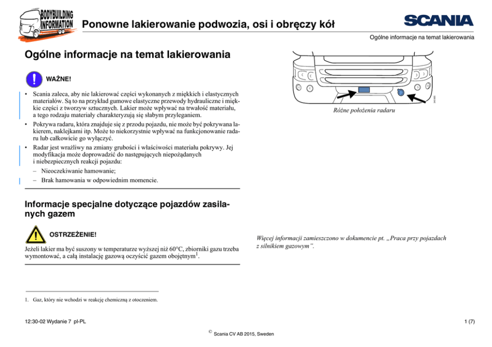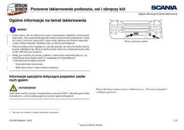 Ponowne lakierowanie podwozia, osi i obręczy kół Ogólne informacje na temat lakierowania Ogólne informacje na temat lakierowania WAŻNE! 340 805 • Scania zaleca, aby nie lakierować części wykonanych z miękkich i elastycznych materiałów. Są to na przykład gumowe elastyczne przewody hydrauliczne i miękkie części z tworzyw sztucznych. Lakier może wpływać na trwałość materiału, a tego rodzaju materiały charakteryzują się słabym przyleganiem. • Pokrywa radaru, która znajduje się z przodu pojazdu, nie może być pokrywana lakierem, naklejkami itp. Może to niekorzystnie wpływać na funkcjonowanie radaru lub całkowicie go wyłączyć. • Radar jest wrażliwy na zmiany grubości i właściwości materiału pokrywy. Jej modyfikacja może doprowadzić do następujących niepożądanych i niebezpiecznych reakcji pojazdu: – Nieoczekiwanie hamowanie; – Brak hamowania w odpowiednim momencie. Różne położenia radaru Informacje specjalne dotyczące pojazdów zasilanych gazem OSTRZEŻENIE! Jeżeli lakier ma być suszony w temperaturze wyższej niż 60°C, zbiorniki gazu trzeba wymontować, a całą instalację gazową oczyścić gazem obojętnym1. Więcej informacji zamieszczono w dokumencie pt. „Praca przy pojazdach z silnikiem gazowym”. 1. Gaz, który nie wchodzi w reakcję chemiczną z otoczeniem. 12:30-02 Wydanie 7 pl-PL 1 (7) © Scania CV AB 2015, Sweden Ponowne lakierowanie podwozia, osi i obręczy kół Elementy podwozia z blachy stalowej Elementy podwozia z blachy stalowej Przygotowanie Wykonaj następujące czynności: 1. umyj środkiem odtłuszczającym na bazie wody, aby usunąć z powierzchni sól. 2. Usuń wszelką rdzę. 3. Oczyść powierzchnie środkiem odtłuszczającym. 4. Opłucz strumieniem wody pod wysokim ciśnieniem, maksymalnie 50°C. Nie spłukuj wodą następujących części: – Łożyska kulkowe i podobne elementy, w których musi pozostać smar; – Membrany różnych podzespołów. 5. Zabezpiecz części, których nie wolno lakierować. Przykłady: – Membrany hamulców, zawieszenia pneumatycznego i sprzęgła automatycznego; – Złączki przewodów sprężonego powietrza, smarowania, odpowietrzania i opróżniania. 12:30-02 Wydanie 7 pl-PL 2 (7) © Scania CV AB 2015, Sweden Ponowne lakierowanie podwozia, osi i obręczy kół Elementy podwozia z blachy stalowej Lakierowanie Podwozia pojazdów marki Scania są lakierowane proszkowo. W przypadku ponownego lakierowania bez podkładu wymagany jest dwuskładnikowy lakier akrylowy lub poliuretanowy. Jeżeli stosowany jest podkład można również zastosować lakier jednoskładnikowy z zadowalającym wynikiem. Więcej informacji zamieszczono w dokumencie „STD2331 – Obróbka powierzchniowa przyczep, zabudowy i podwozia”. Postępuj zgodnie z instrukcjami zawartymi w normie Scania STD2331. WAŻNE! Nie stosuj lakieru epoksydowego jako warstwy wierzchniej, ponieważ jest wrażliwy na promienie UV. Unikaj stosowania jednoskładnikowego lakieru suszonego powietrzem, ponieważ jego przyleganie nie jest wystarczająco dobre. 12:30-02 Wydanie 7 pl-PL 3 (7) © Scania CV AB 2015, Sweden Ponowne lakierowanie podwozia, osi i obręczy kół Elementy podwozia z tworzywa sztucznego Elementy podwozia z tworzywa sztucznego Tworzywo sztuczne PC/PBT • • • • • Zderzak Osłony stopni Przednie błotniki Boczne osłony przeciwnajazdowe o wysokości 580 mm Skrzynie akumulatorów ze stopniami Tworzywo PP/EPDM 356 511 • Skrzynie akumulatorów • Tylne błotniki • Wspornik tylnej lampy Zewnętrzne elementy podwozia z tworzywa sztucznego Tworzywo SMC • Dolna atrapa przednia • Boczne osłony przeciwnajazdowe o wysokości 730 mm 12:30-02 Wydanie 7 pl-PL 4 (7) © Scania CV AB 2015, Sweden Ponowne lakierowanie podwozia, osi i obręczy kół Elementy podwozia z tworzywa sztucznego Lakierowanie elementów z tworzyw sztucznych Aby farba przylegała do tworzywa PP/EPDM, należy najpierw pokryć je podkładem. Skontaktuj się z producentem lakieru w celu dobrania odpowiednich podkładów dla tworzyw PC/PBT i PP/EPDM. Środowisko Nielakierowane tworzywa PC/PBT i PP/EPDM są całkowicie zdatne do recyklingu. Polakierowane tworzywa sztuczne nie nadają się do recyklingu w takim samym zakresie, jak tworzywa nielakierowane. Lakierując części, uwzględnij następujące kwestie: • Zastosuj lakier odpowiedni dla materiałów elastycznych. • Skonsultuj się z producentem lakieru w celu dobrania odpowiedniego lakieru. Wykonaj następujące czynności: 1. Usuń wszelki brud oraz nierówności. 2. Umyj wodą. 3. Dokładnie oczyść środkiem odtłuszczającym i osusz. 4. Polakieruj zgodnie z instrukcjami dostawcy lakieru. Jeżeli nie chcesz, aby struktura powierzchni tworzywa sztucznego była widoczna po lakierowaniu, wykonaj następujące czynności: 1. Oszlifuj powierzchnię. 2. Nałóż lakier z wypełniaczem. 12:30-02 Wydanie 7 pl-PL 5 (7) © Scania CV AB 2015, Sweden Ponowne lakierowanie podwozia, osi i obręczy kół Osie Osie Do lakierowania podwozia, osi i stalowych obręczy należy stosować lakier zgodny z lakierami firmy Scania. Lakiery nie mogą wpływać na właściwości oryginalnej warstwy lakieru. Wały napędowe Lakierowanie wałów napędowych WAŻNE! Aby nie dopuścić do tworzenia krawędzi lakieru podczas lakierowania wałów napędowych, należy dobrze okleić części. Oklej całą powierzchnię kołnierzowego złącza wielowypustowego, gdzie porusza się pierścień zgarniający. Dokładnie oklej cały obszar oznaczony na szaro, aż do skosu tulei. Patrz rysunek. Zdarzały się wypadki luzu połączenia suwliwego wału napędowego po lakierowaniu. Wynika to z tego, że kołnierzowe złącze wielowypustowe nie zostało prawidłowo oklejone podczas lakierowania (dotyczy to wałów lakierowanych na zewnątrz). Mogą się wtedy tworzyć krawędzie lakieru i ocierać się o pierścień zgarniający. Krawędzie lakieru szybko zużywają krawędzie pierścienia zgarniającego, gdy k
