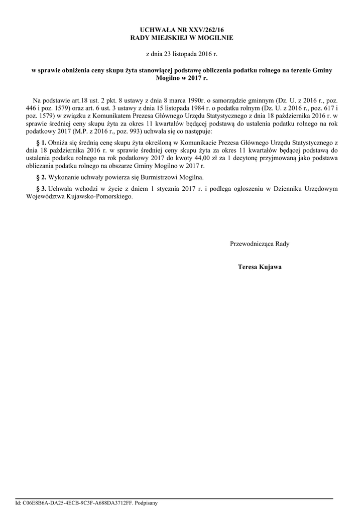 UCHWAŁA NR XXV/262/16 RADY MIEJSKIEJ W MOGILNIE z dnia 23 listopada 2016 r. w sprawie obniżenia ceny skupu żyta stanowiącej podstawę obliczenia podatku rolnego na terenie Gminy Mogilno w 2017 r. Na podstawie art.18 ust. 2 pkt. 8 ustawy z dnia 8 marca 1990r. o samorządzie gminnym (Dz. U. z 2016 r., poz. 446 i poz. 1579) oraz art. 6 ust. 3 ustawy z dnia 15 listopada 1984 r. o podatku rolnym (Dz. U. z 2016 r., poz. 617 i poz. 1579) w związku z Komunikatem Prezesa Głównego Urzędu Statystycznego z dnia 18 października 2016 r. w sprawie średniej ceny skupu żyta za okres 11 kwartałów będącej podstawą do ustalenia podatku rolnego na rok podatkowy 2017 (M.P. z 2016 r., poz. 993) uchwala się co następuje: § 1. Obniża się średnią cenę skupu żyta określoną w Komunikacie Prezesa Głównego Urzędu Statystycznego z dnia 18 października 2016 r. w sprawie średniej ceny skupu żyta za okres 11 kwartałów będącej podstawą do ustalenia podatku rolnego na rok podatkowy 2017 do kwoty 44,00 zł za 1 decytonę przyjmowaną jako podstawa obliczania podatku rolnego na obszarze Gminy Mogilno w 2017 r. § 2. Wykonanie uchwały powierza się Burmistrzowi Mogilna. § 3. Uchwała wchodzi w życie z dniem 1 stycznia 2017 r. i podlega ogłoszeniu w Dzienniku Urzędowym Województwa Kujawsko-Pomorskiego. Przewodnicząca Rady Teresa Kujawa Id: C06E8B6A-DA25-4ECB-9C3F-A688DA3712FF. Podpisany UZASADNIENIE DO UCHWAŁY Nr XXV/262/16 RADY MIEJSKIEJ W MOGILNIE z 23 listopada 2016 r. w sprawie obniżenia ceny skupu żyta stanowiącej podstawę obliczenia podatku rolnego na terenie Gminy Mogilno w 2017 r. Średnia cena skupu żyta za 11 kwartałów poprzedzających kwartał poprzedzający rok podatkowy wyniosła 52,44 zł za jedną decytonę (wg Komunikatu Prezesa Głównego Urzędu Statystycznego z dnia 18 października 2016 r. opublikowanego w Monitorze Polskim z 2016 r., poz. 993). Rada Miejska działając na podstawie art. 6 ust. 3 ustawy z dnia 15 listopada 1984 r. o podatku rolnym obniża w/w cenę skupu żyta do kwoty 44 zł i przyjmuje jako podstawę do obliczenia podatku rolnego na 2017 r. Uzyskane dochody z tytułu podatku rolnego przeznaczy się na inwestycje w gminie Mogilno. W 2017 r. podatek rolny z 1 ha przeliczeniowego będzie wynosił (44,00 zł x 2,5 q) 110,00 zł. Id: C06E8B6A-DA25-4ECB-9C3F-A688DA3712FF. Podpisany