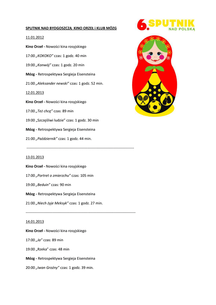 SPUTNIK NAD BYDGOSZCZĄ KINO ORZEŁ i KLUB MÓZG 11.01.2012 Kino Orzeł - Nowości kina rosyjskiego 17:00 „KOKOKO” czas: 1 godz. 40 min 19:00 „Konwój” czas: 1 godz. 20 min Mózg - Retrospektywa Sergieja Eisensteina 21:00 „Aleksander newski” czas: 1 godz. 52 min. 12.01.2013 Kino Orzeł - Nowości kina rosyjskiego 17:00 „Też chcę” czas: 89 min 19:00 „Szczęśliwi ludzie” czas: 1 godz. 30 min Mózg - Retrospektywa Sergieja Eisensteina 21:00 „Październik” czas: 1 godz. 44 min. ---------------------------------------------------------------------------------------13.01.2013 Kino Orzeł - Nowości kina rosyjskiego 17:00 „Portret o zmierzchu” czas: 105 min 19:00 „Beduin” czas: 90 min Mózg - Retrospektywa Sergieja Eisensteina 21:00 „Niech żyje Meksyk” czas: 1 godz. 27 min. -----------------------------------------------------------------------------------------14.01.2013 Kino Orzeł - Nowości kina rosyjskiego 17:00 „Ja” czas: 89 min 19:00 „Rzeka” czas: 48 min Mózg - Retrospektywa Sergieja Eisensteina 20:00 „Iwan Groźny” czas: 1 godz. 39 min. ----------------------------------------------------------------------------------------------15.01.2013 Kino Orzeł - Wielka literatura w kinie radzieckim 17:00 „Don Kichot” czas: 1 godz. 50 min 19:00 „Hamlet” czas: 2 godz. 20 min Mózg – Retrospektywa Aleksandra Sokurowa 21:30 „Cielec” czas: 1 godz. 34 min. ----------------------------------------------------------------------------------------------------16. 01.2013 Kino Orzeł - Wielka literatura w kinie radzieckim 17:00 „Król Lear” czas: 2 godz. 19 min 19:30 „Wujaszek Wania” czas: 1 godz. 44 min Mózg - Retrospektywa Aleksandra Sokurowa 21:30 „Smutna obojętność” czas: 1 godz. 50 min --------------------------------------------------------------------------------------------17.01.2013 Kino Orzeł - Wielka literatura w kinie radzieckim 17:00 „Bracia Karamazow” cz. 1 19:00 „Bracia Karamazow” cz. 2 Mózg - Retrospektywa Aleksandra Sokurowa 21:00 „Dni zaćmienia” czas: 2 godz. 13 min ----------------------------------------------------------------------------------------------18.01.2013 Kino Orzeł - Klasyka kina radzieckiego 17:00 „Stalker” czas: 2 godz. 43 minuty 20:00 „Lecą żurawie” czas: 1 godz. 37 minut.