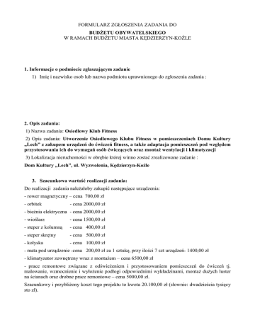 FORMULARZ ZGŁOSZENIA ZADANIA DO BUDŻETU OBYWATELSKIEGO W RAMACH BUDŻETU MIASTA KĘDZIERZYN-KOŹLE 1. Informacje o podmiocie zgłaszającym zadanie 1) Imię i nazwisko osob lub nazwa podmiotu uprawnionego do zgłoszenia zadania : Ewa Benedyk 2) Adres: ul. Tuwima 16/4, 47-225 Kędzierzyn-Koźle 3) Numer telefonu: 0600 839 158 4) Adres e-mail:[email protected] 2. Opis zadania: 1) Nazwa zadania: Osiedlowy Klub Fitness 2) Opis zadania: Utworzenie Osiedlowego Klubu Fitness w pomieszczeniach Domu Kultury „Lech” z zakupem urządzeń do ćwiczeń fitness, a także adaptacja pomieszczeń pod względem przystosowania ich do wymagań osób ćwiczących oraz montaż wentylacji i klimatyzacji 3) Lokalizacja nieruchomości w obrębie której winno zostać zrealizowane zadanie : Dom Kultury „Lech”, ul. Wyzwolenia, Kędzierzyn-Koźle 3. Szacunkowa wartość realizacji zadania: Do realizacji zadania należałoby zakupić następujące urządzenia: - rower magnetyczny – cena 700,00 zł - orbitek - cena 2000,00 zł - bieżnia elektryczna - cena 2000,00 zł - wioślarz - cena 1500,00 zł - steper z kolumną - cena 400,00 zł - steper skrętny - cena 500,00 zł - kołyska - cena 100,00 zł - mata pod urządzenie -cena 200,00 zł za 1 sztukę, przy ilości 7 szt urządzeń- 1400,00 zł - klimatyzator zewnętrzny wraz z montażem – cena 6500,00 zł - prace remontowe związane z odświeżeniem i przystosowaniem pomieszczeń do ćwiczeń tj. malowanie, wzmocnienie i wyłożenie podłogi odpowiednimi wykładzinami, montaż dużych luster na ścianach oraz drobne prace remontowe – cena 5000,00 zł. Szacunkowy i przybliżony koszt tego projektu to kwota 20.100,00 zł (słownie: dwadzieścia tysięcy sto zł). Należy zaznaczyć, że ceny urządzeń mogą być wyższe, ponieważ cena np. bieżni może wynosić 1500,00 zł jak i 5000,00 zł. Ważne jest aby w trakcie realizacji projektu, zwrócić uwagę przede wszystkim na jakość urządzeń i warunki bezpieczeństwa użytkowania przez większą ilośc osób. Przy założeniu, że dla Osiedlowego Klubu Fitness zostaną przeznaczone odpowiednio duże pomieszczenia w DK „Lech” można dokoną zakupu większj ilości urządzeń do ćwiczeń. (z zastrzeżeniem, iż wartość prac nie może przekraczać łącznie kwoty przypadającej na dane Osiedla w podziale rezerwy celowej utworzonej w budżecie miasta na dany rok dla wydatków objętych Budżetem Obywatelskim). 4. Załączniki (np.: mapy, zdjęcia, grafiki, inne materiały): (nieobowiązkowe) Z poważaniem Ewa Benedyk